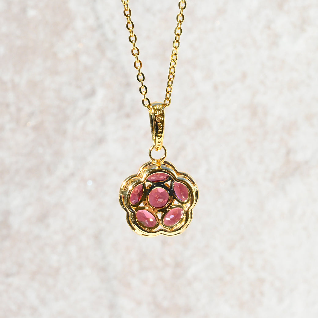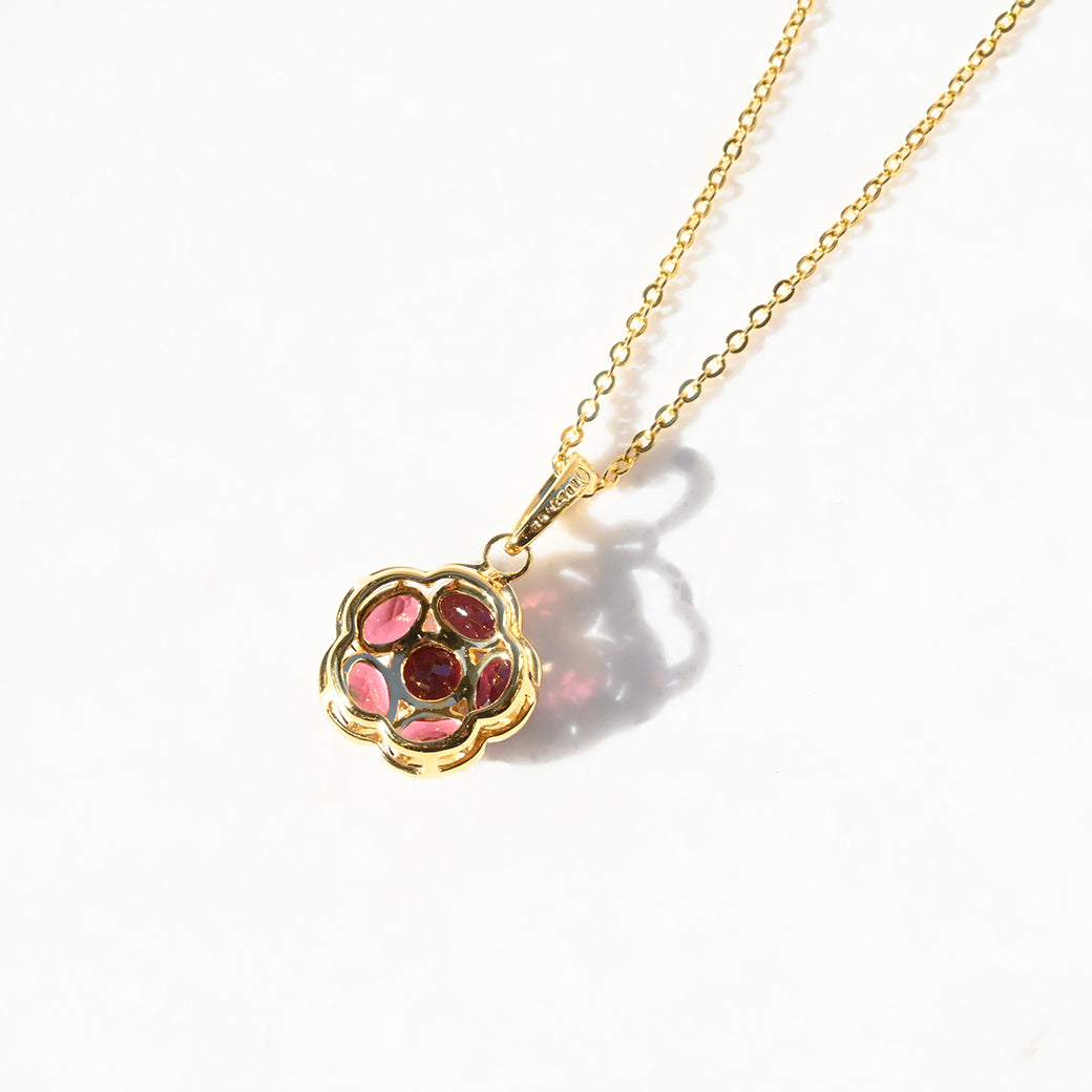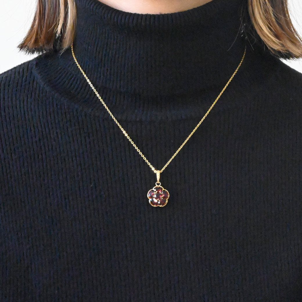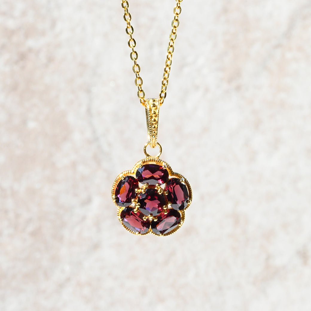 深みのある赤紫色が美しいロードライトガーネットを贅沢にあしらった、フラワーモチーフのペンダント。