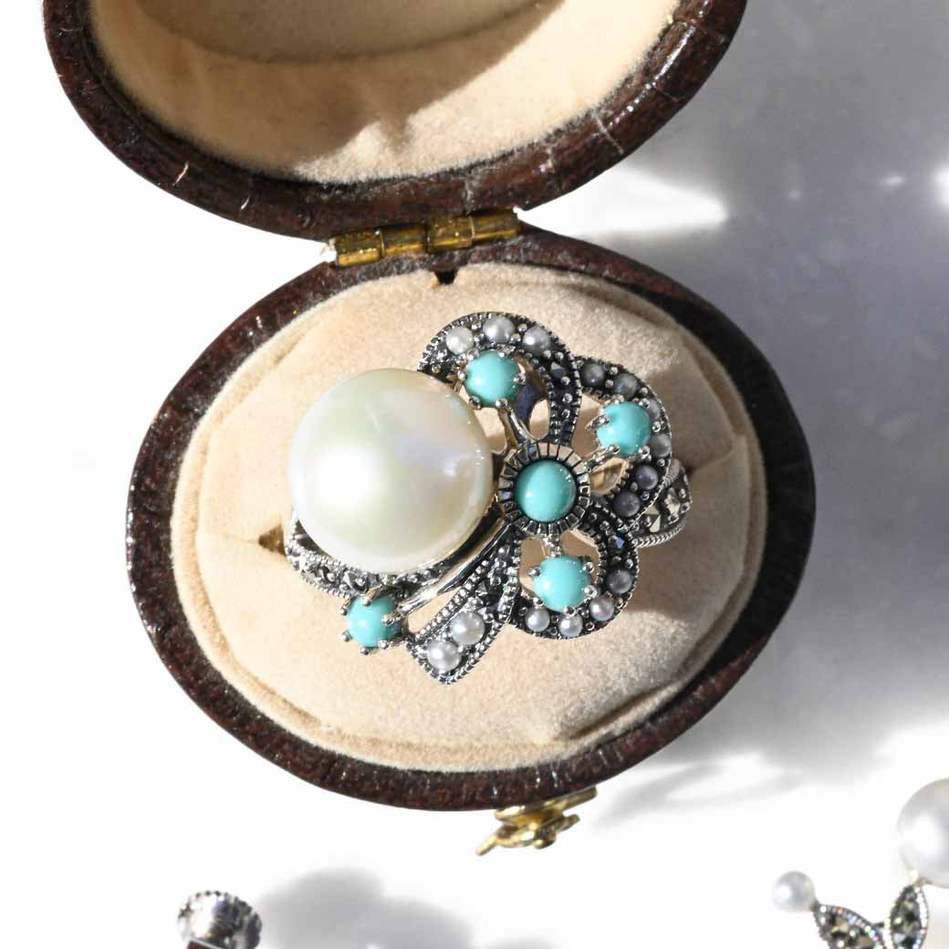 ①〈素材〉シルバー925〈石〉ターコイズ、シードパール、マルカジット〈モチーフサイズ〉最大19mm(15号にて計測)