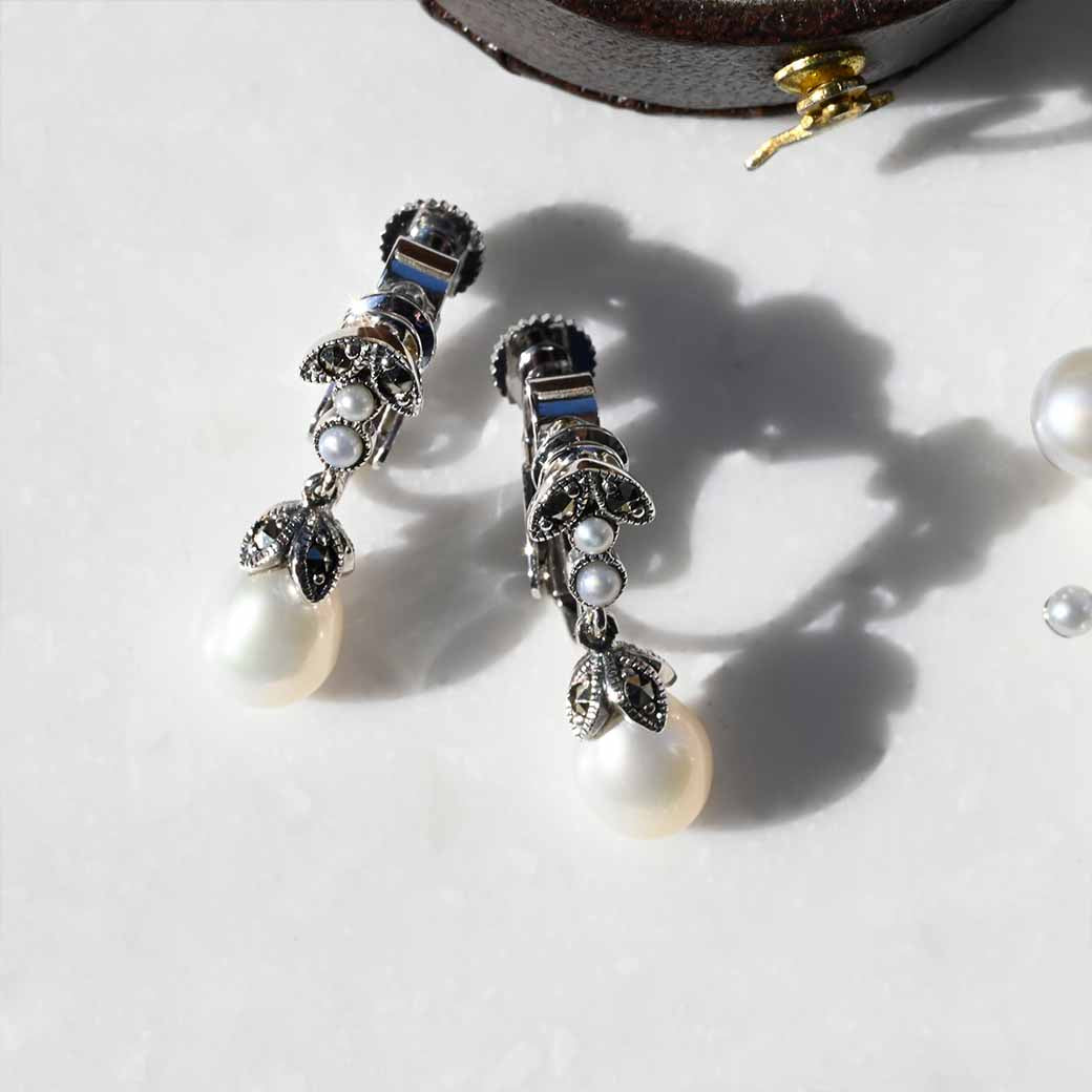 〈素材〉シルバー925〈石〉淡水パール、マルカジット〈モチーフサイズ〉直径 約18 mm ※イヤリング=ネジバネ式/ピアス=スタッドタイプ