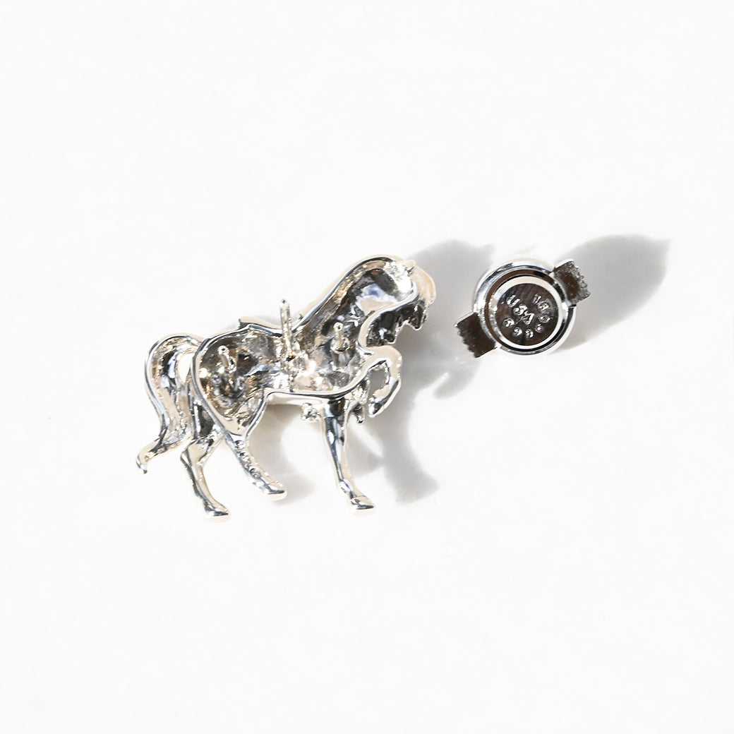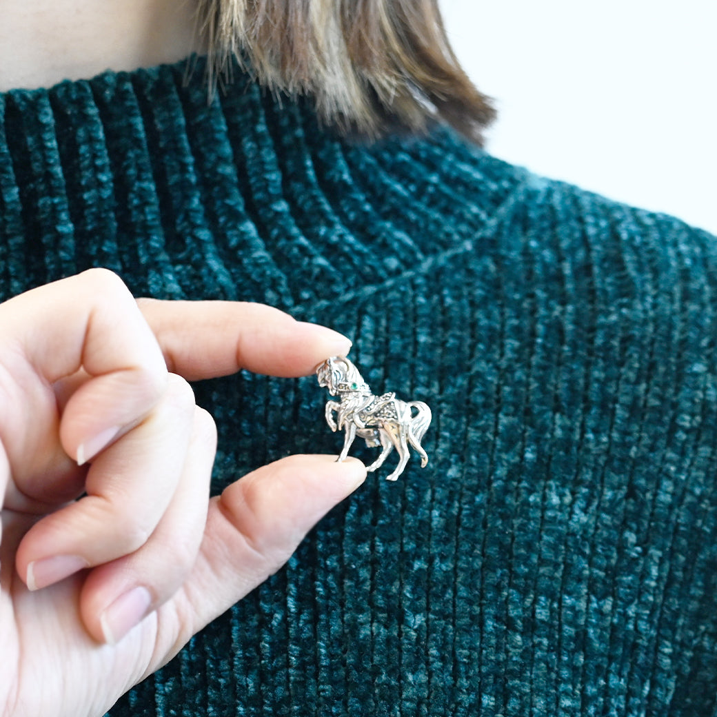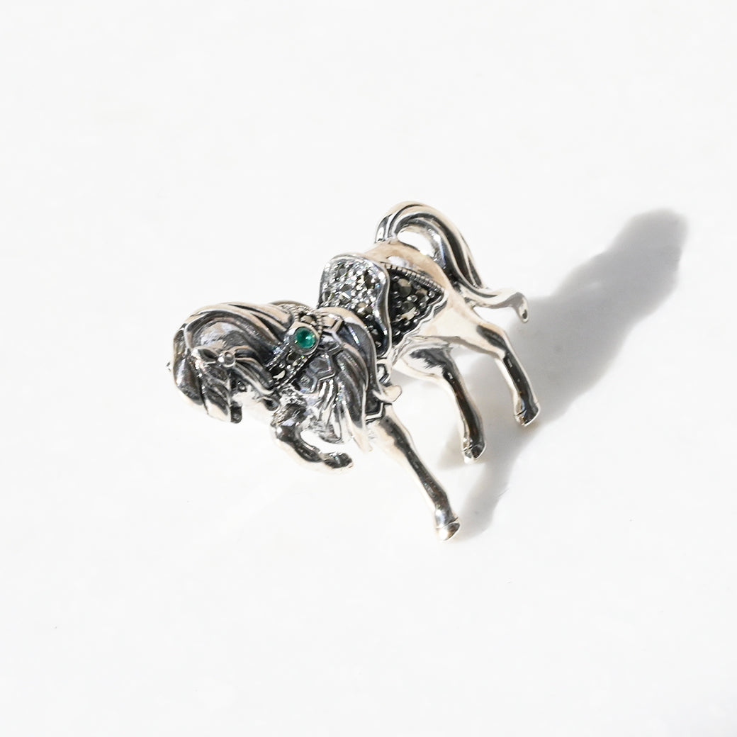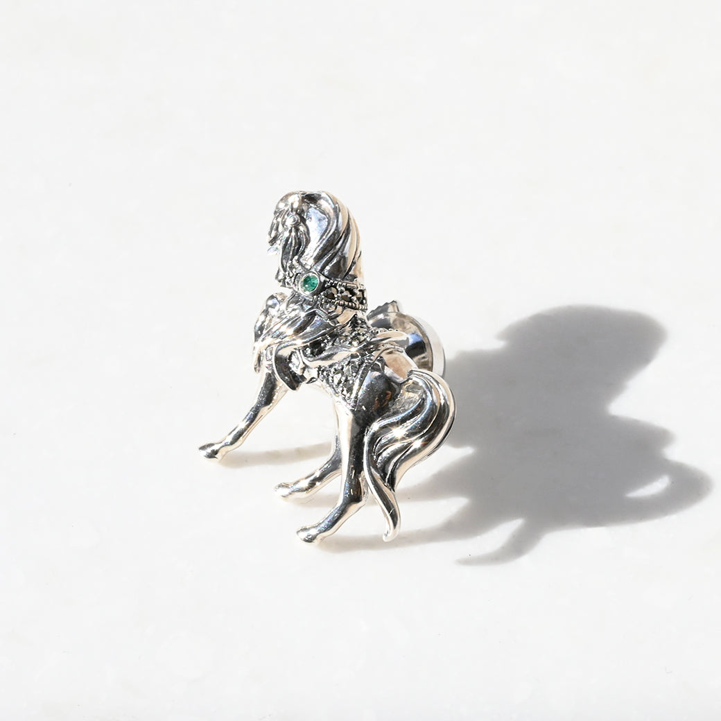 立体感のある馬の造形が美しく、ワンポイントで使用した深く青く輝きを放つファセットカットのエメラルドにも目を奪われてしまいます。たなびく縦髪やほっそりとした足、サラブレットの体の作りなど職人の手のぬくもりが感じられるほどに細部まで良く作り込んでいますので時間を忘れて見入ってしまう作品です。