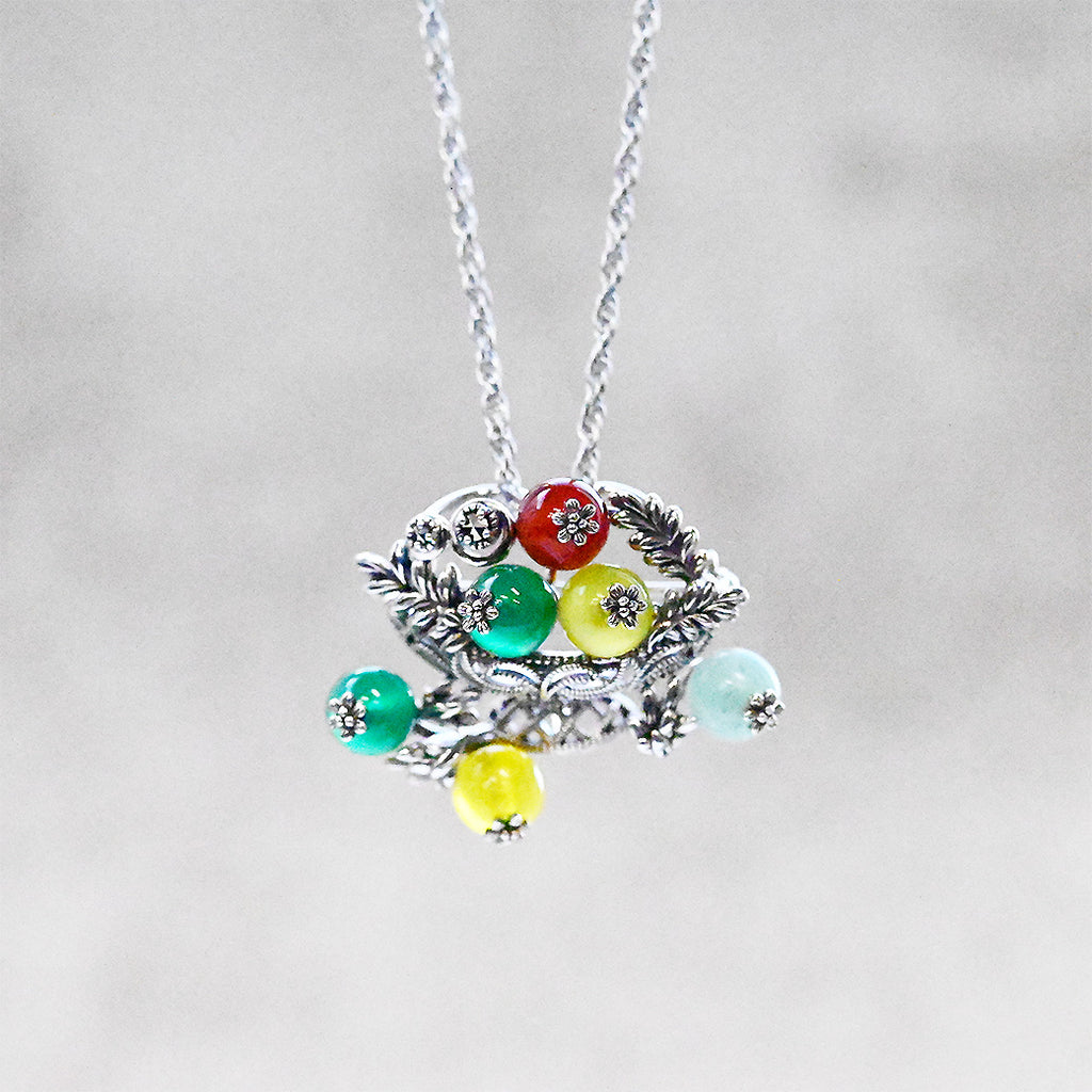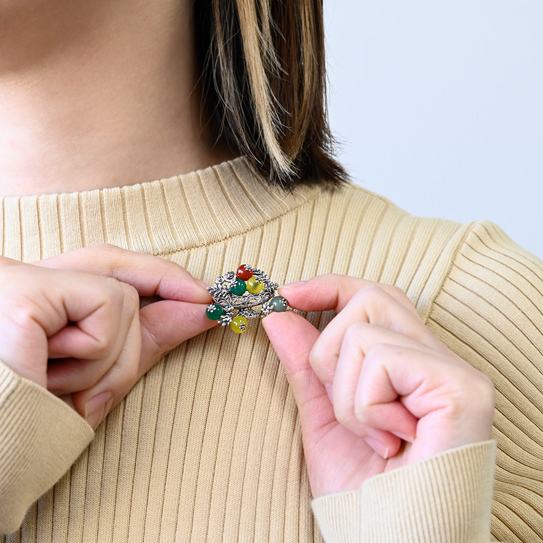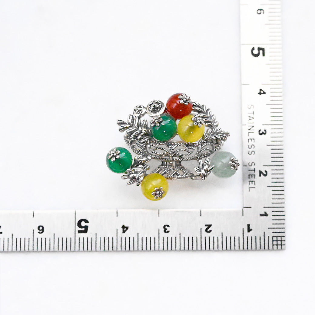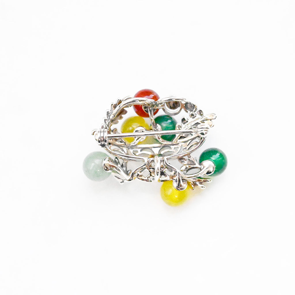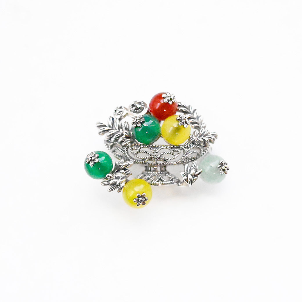 クラシカルなシルバーブローチ。ポール・セザンヌの「コンポートのある静物画」をモチーフに、4色のメノウで果実の鮮やかさと瑞々しさを表現しました。