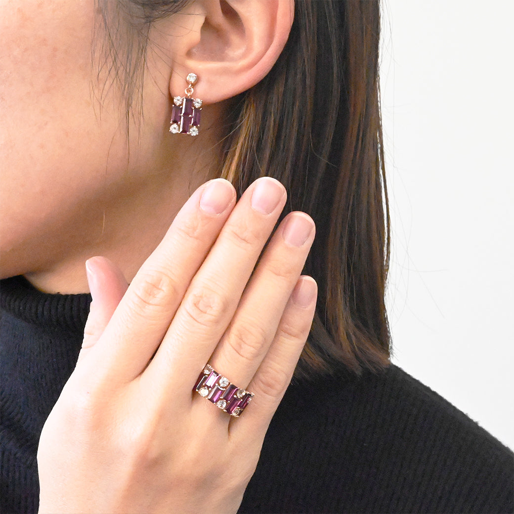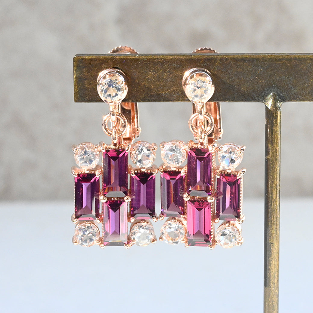 シャープな直線美が際立つ、バゲットライン ロードライト イヤリングorピアス。SILVER925にピンクゴールドコーティングを施し、深みのある赤紫色のロードライトと透明感あふれるホワイトトパーズを組み合わせた、洗練されたデザインです。