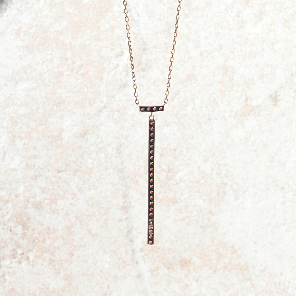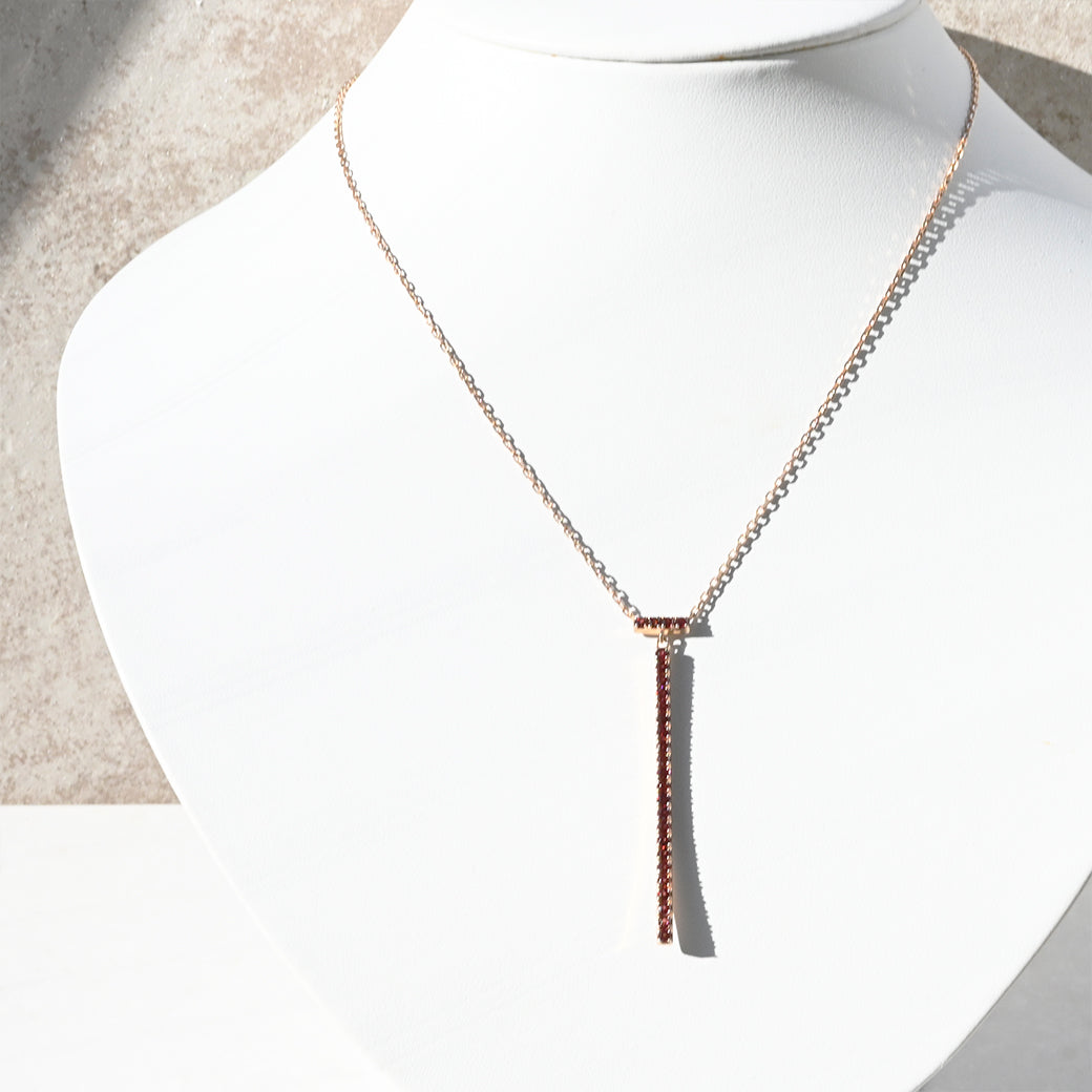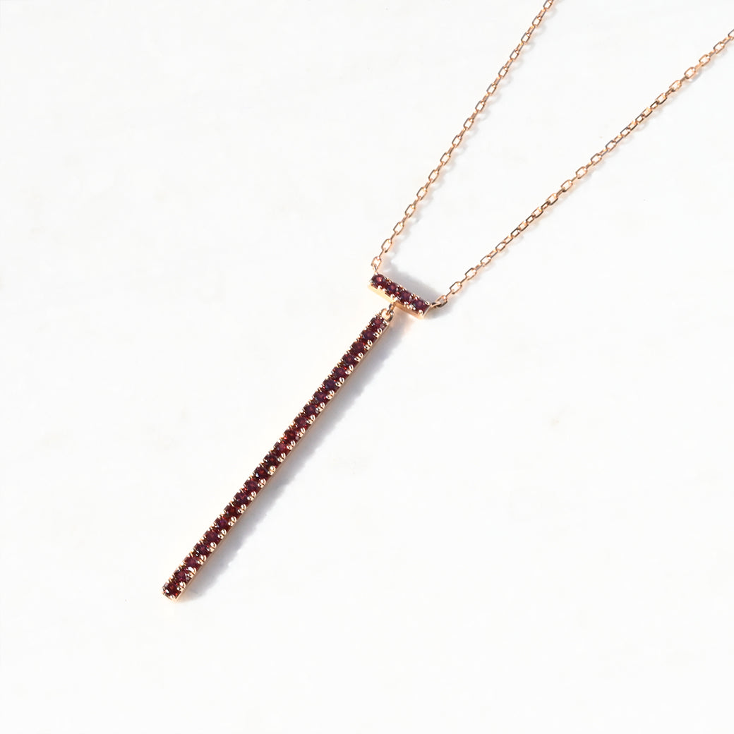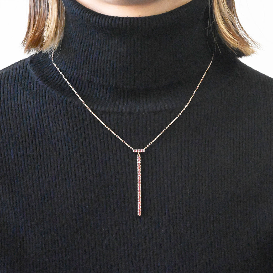 シャープでミニマルなラインが印象的な、 ローズガーネット リニアネックレス。SILVER925の上品な輝きに、赤紫色が美しいローズガーネットを縦一列にあしらい、洗練された存在感を放つデザインです。