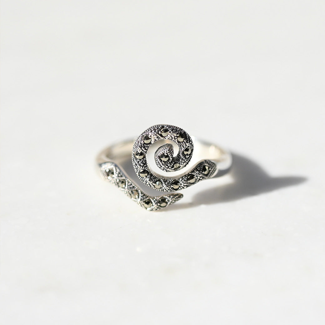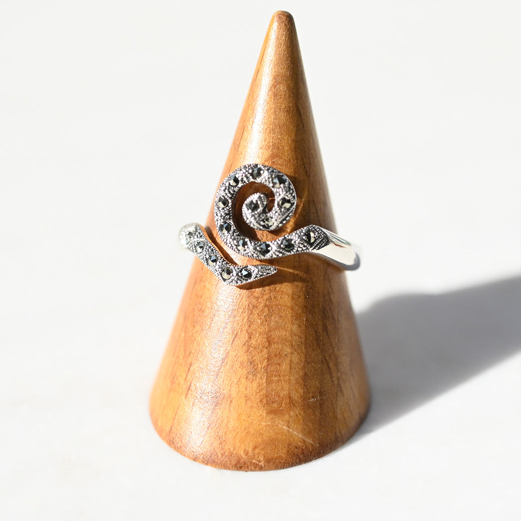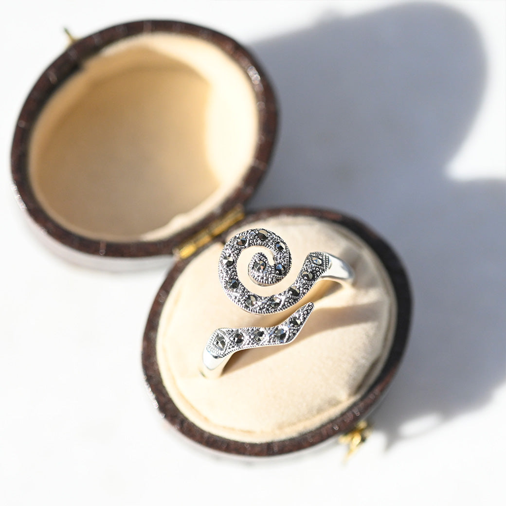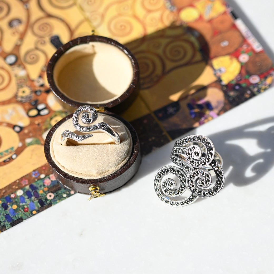 グスタフ・クリムトの名作《生命の樹》に描かれる、永遠と再生を象徴するスパイラル(渦巻き)模様。その神秘的な形状を、ヴィンテージ感のあるマーカサイトで包み込み、静かなる力強さを宿したリングとして表現しました。