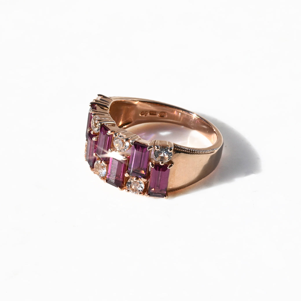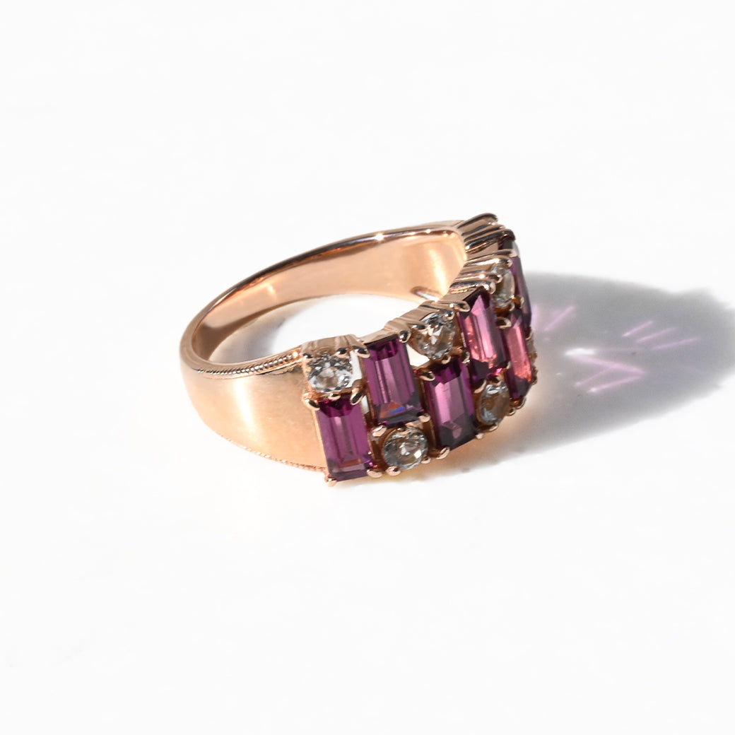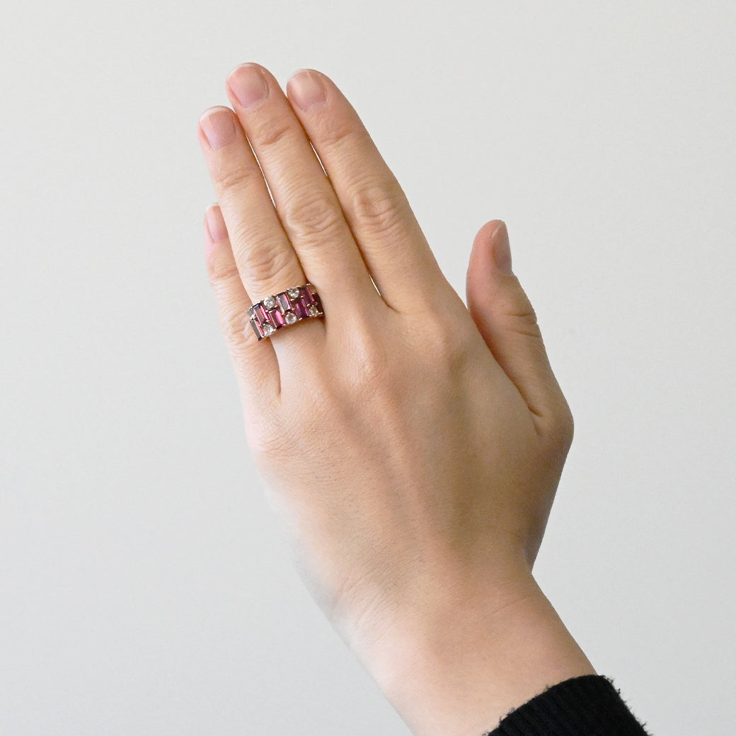 深みのある赤紫色が魅力のロードライトガーネットをバゲットカットで整然と配し、その間にあしらわれたホワイトトパーズが、洗練された透明感ときらめきを添えます。