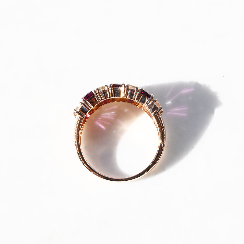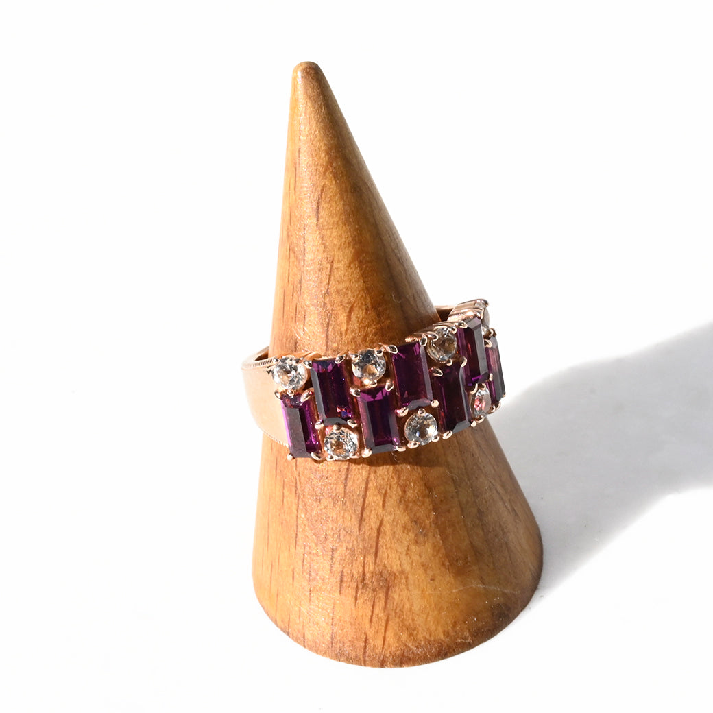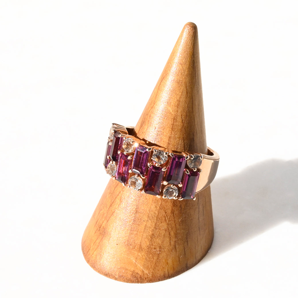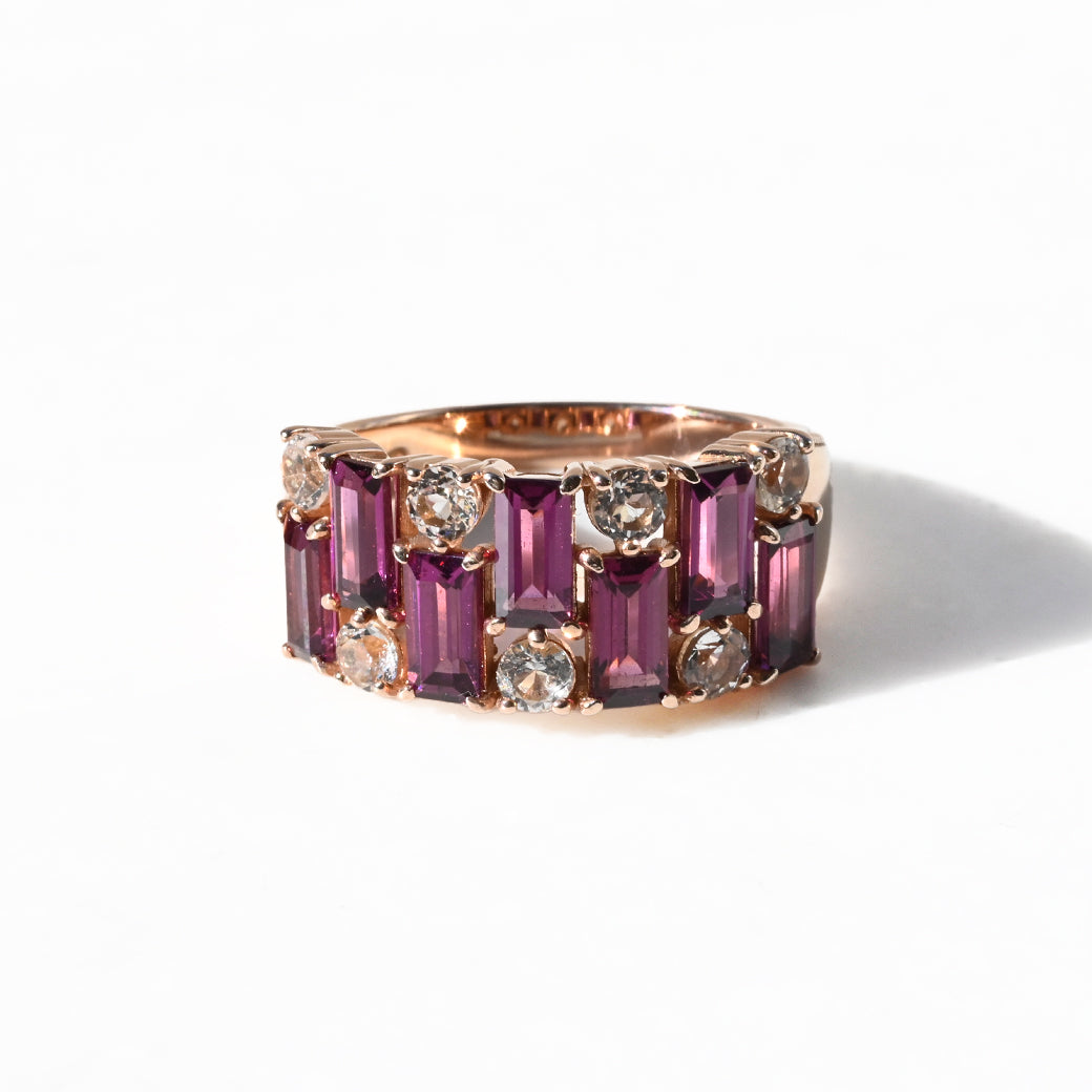 深みのある赤紫色が魅力のロードライトガーネットをバゲットカットで整然と配し、その間にあしらわれたホワイトトパーズが、洗練された透明感ときらめきを添えます。