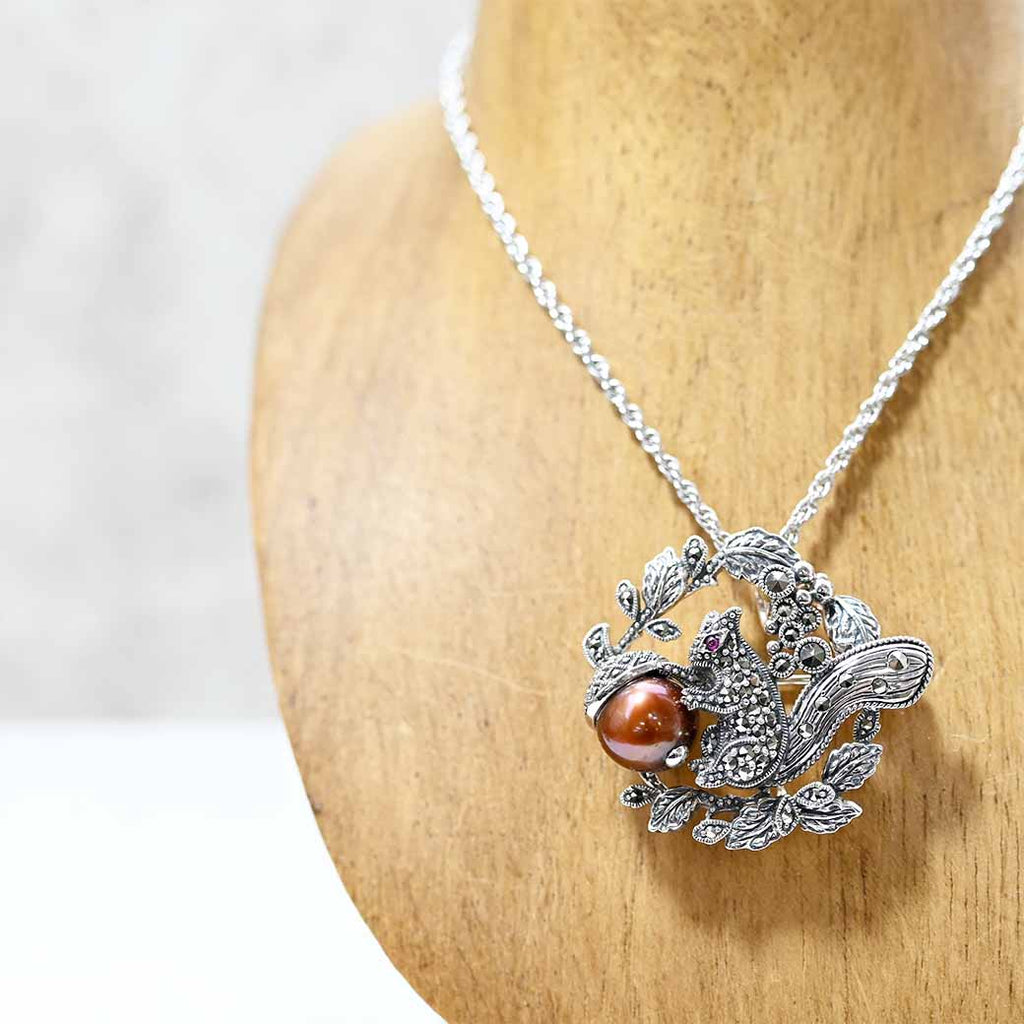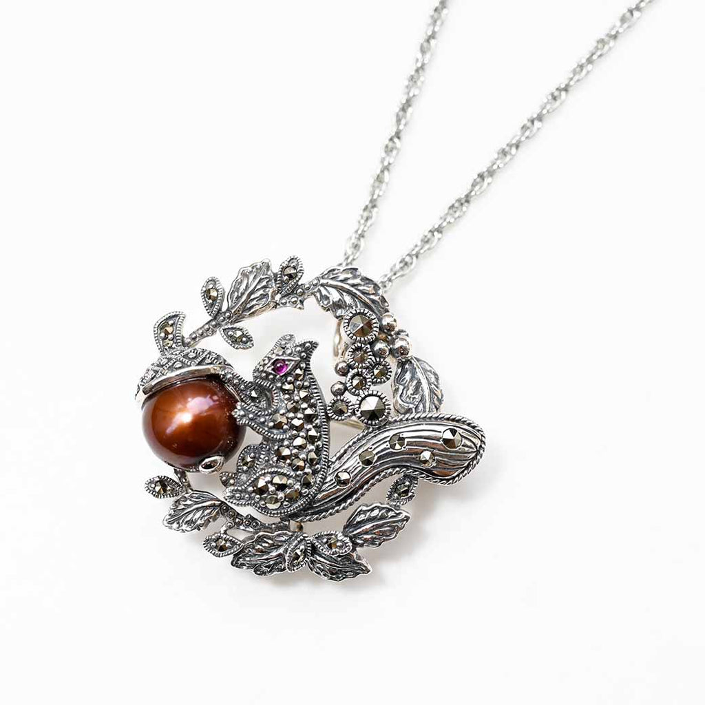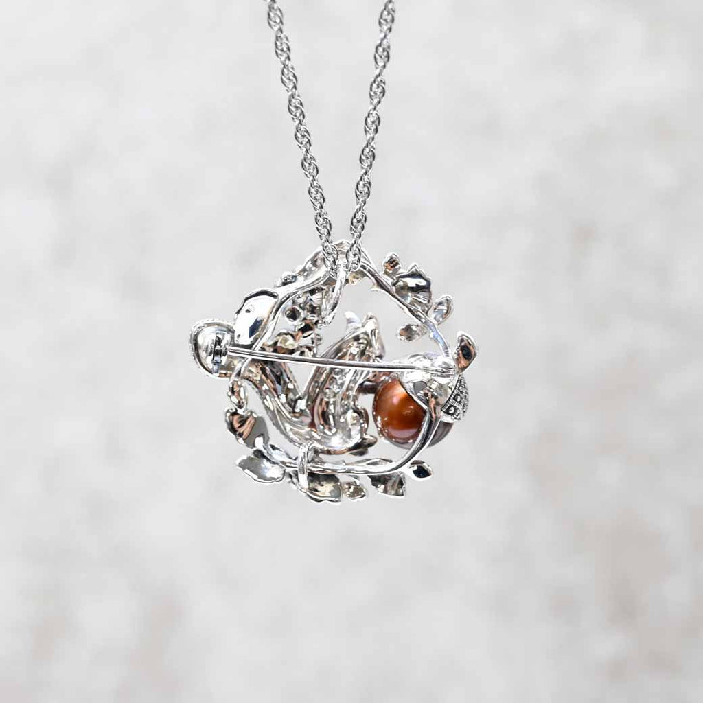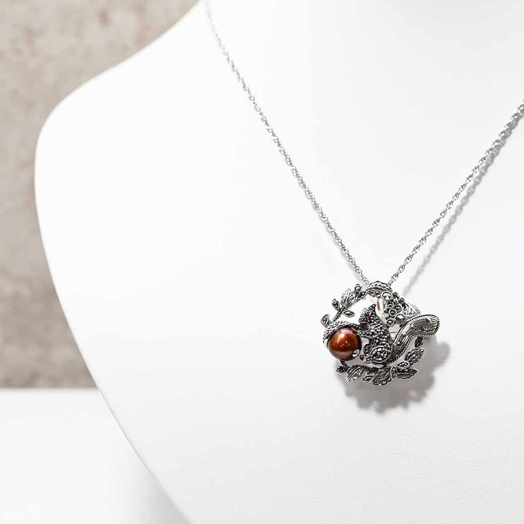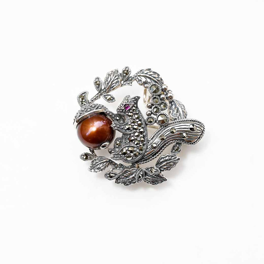 ある秋の朝、小さなリスが森の中で見つけたのは、ひときわ美しく輝くどんぐり。それは茶色い淡水パールでできていて、まるで秋の陽ざしをそのまま閉じ込めたよう。彼はその実を両手でそっと抱え、マーカサイトの葉の中に大切に包みました。小さな瞳には、希望のようなルビーの赤が静かに灯っています。
