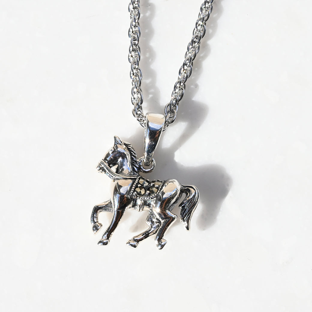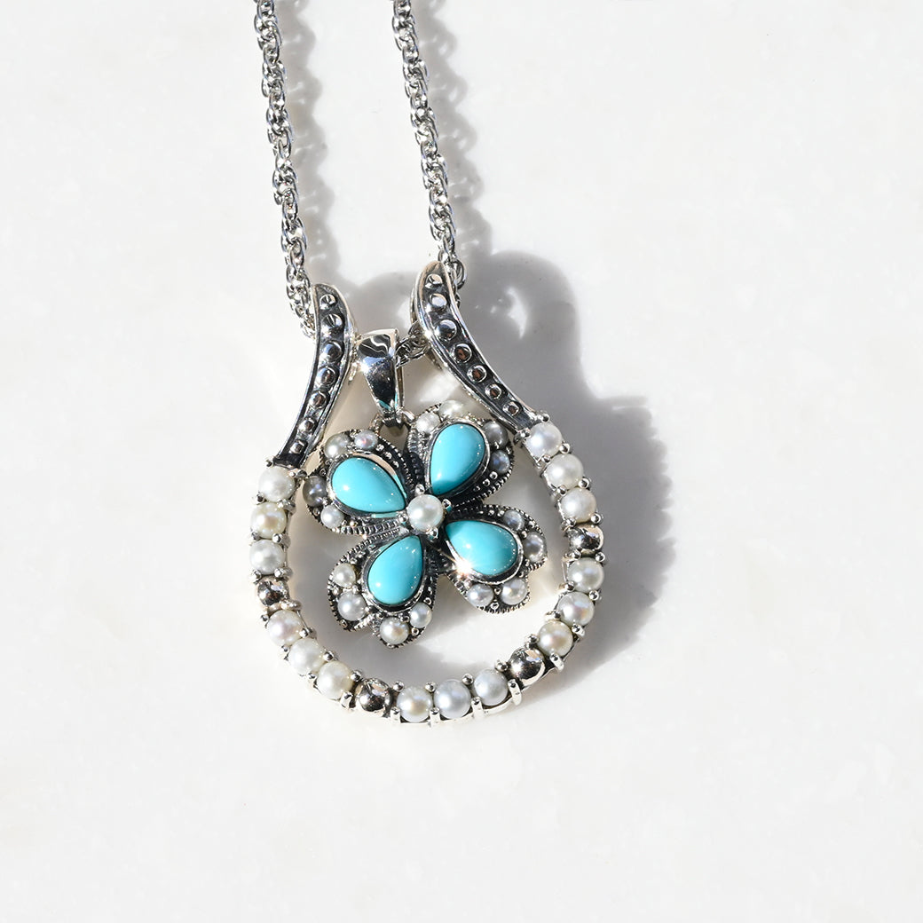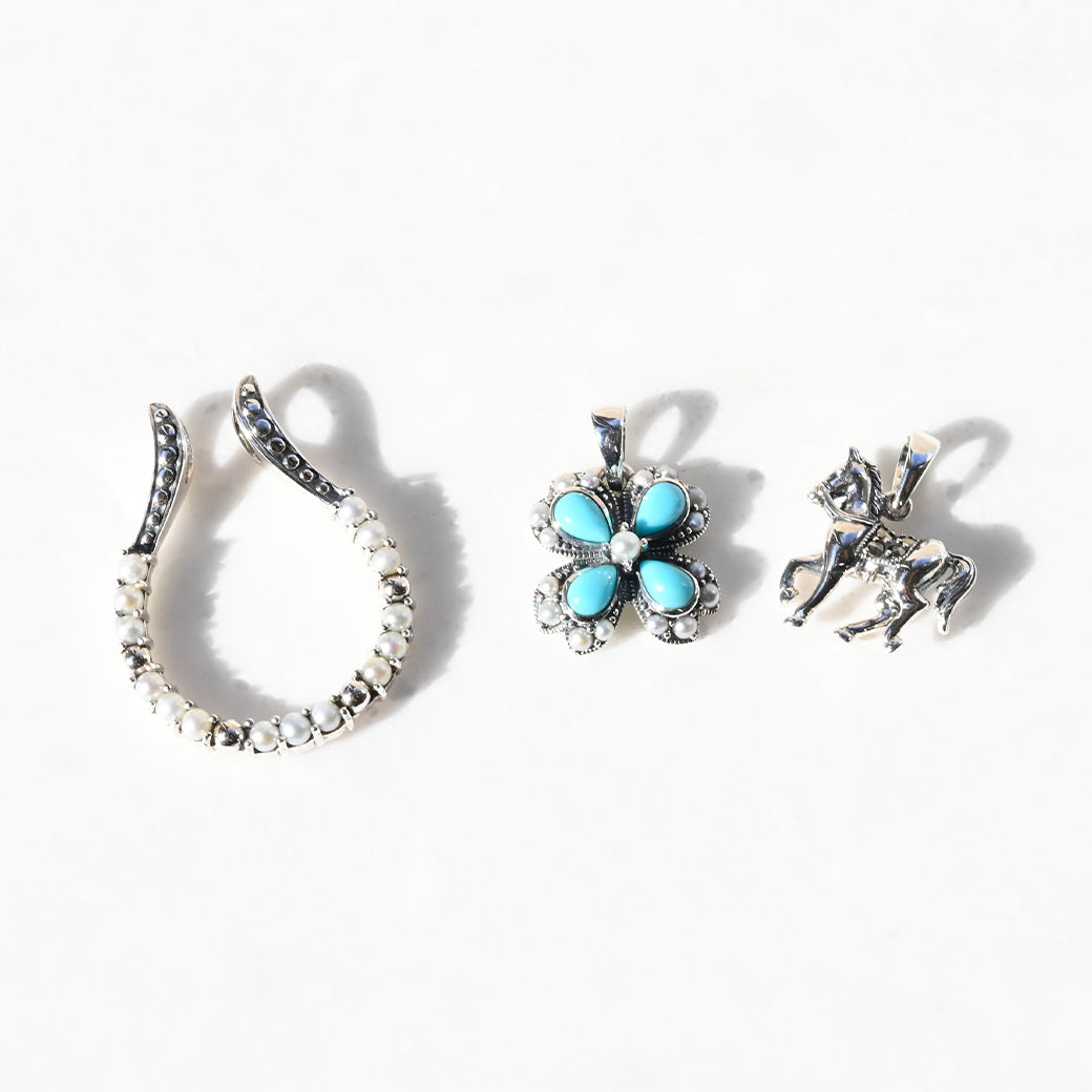 鮮やかなターコイズブルーのフラワーモチーフと、柔らかな輝きを放つパールを贅沢にあしらった、幸運のホースシュー型シルバーペンダント。クラシカルなマーカサイトの輝きがアクセントとなり、気品と華やかさを併せ持つデザインに仕上げられています。花、蹄鉄、馬――それぞれに幸運を意味する3つのチャームを自由に組み合わせ、自分だけのアレンジが楽しめる特別な一品。胸元に咲く小さな幸運の花「ブルームチャーム」が、日常を明るく彩ります。