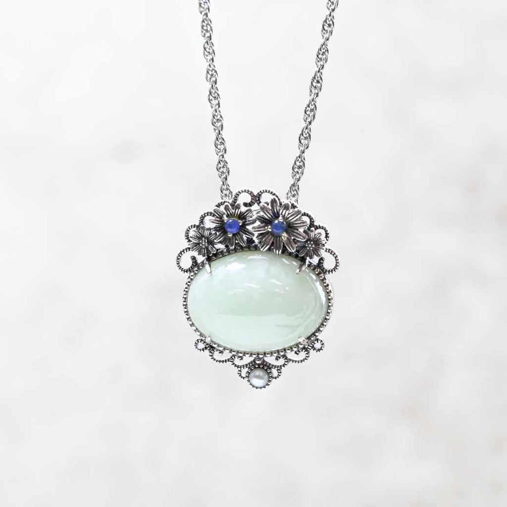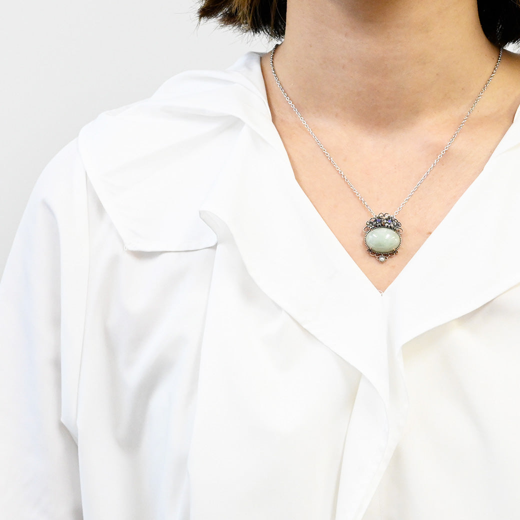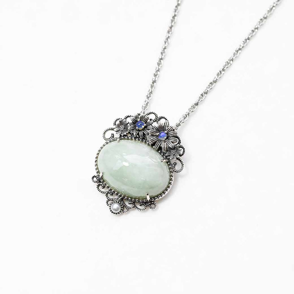 翡翠の穏やかなグリーンを中心に、オパールとブルーストーンが咲き誇るように配置された、クラシカルな雰囲気のフラワーブーケペンダント。