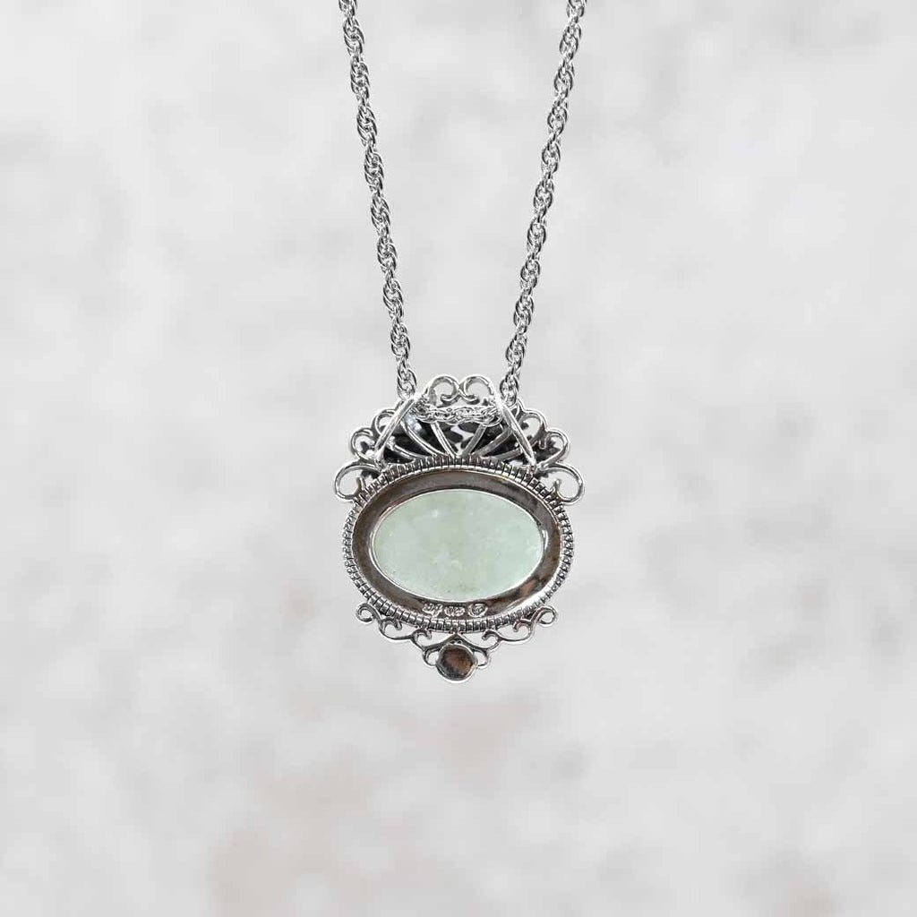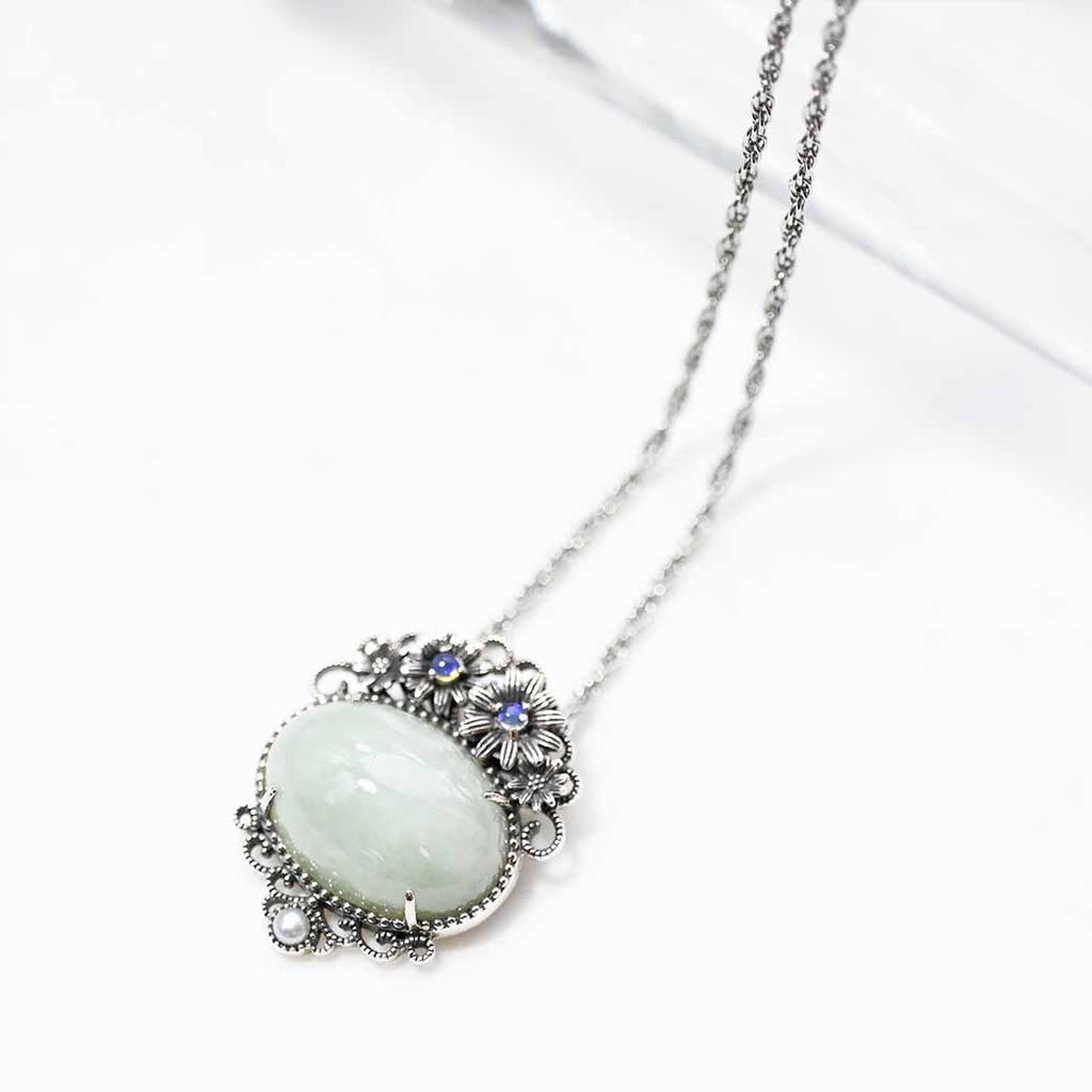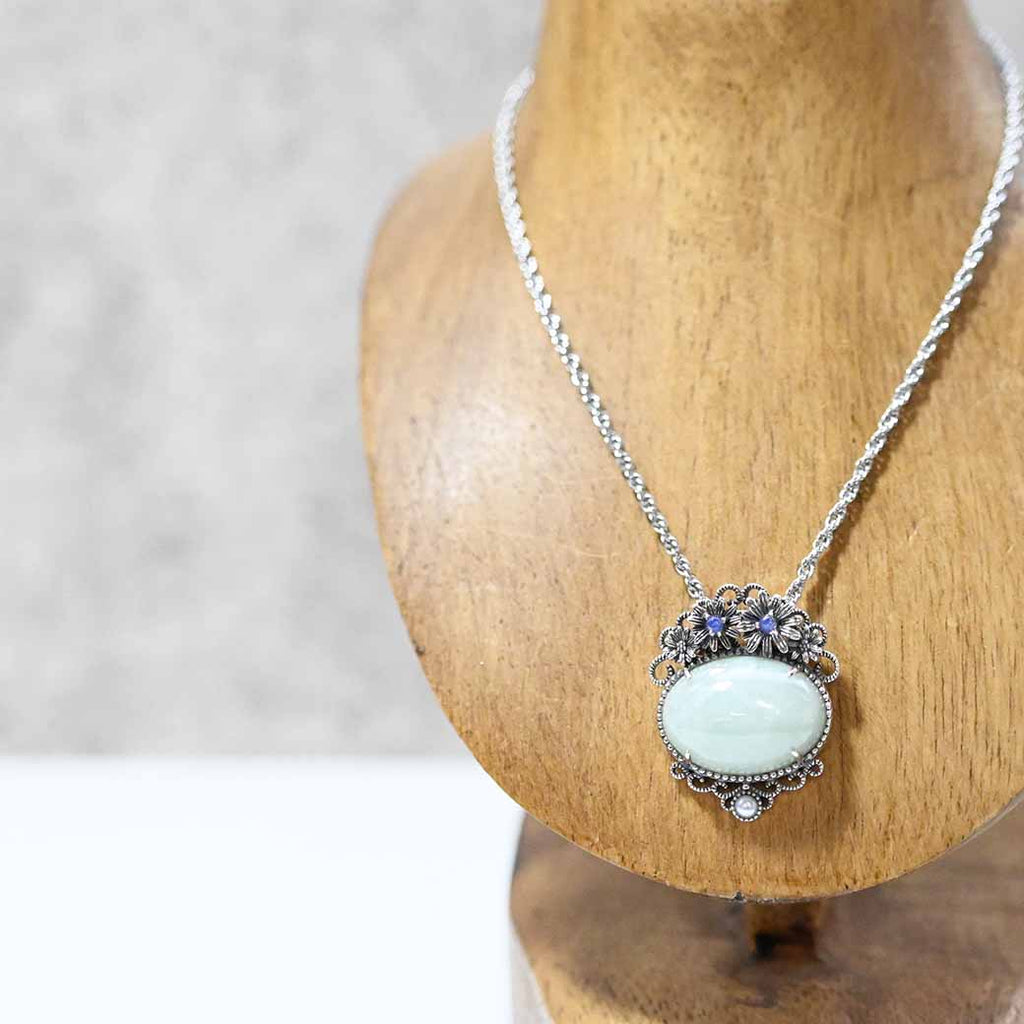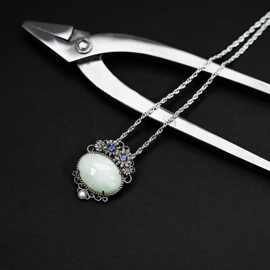 翡翠の穏やかなグリーンを中心に、オパールとブルーストーンが咲き誇るように配置された、クラシカルな雰囲気のフラワーブーケペンダント。