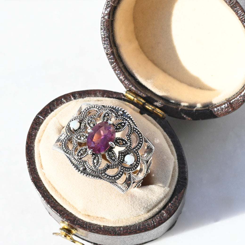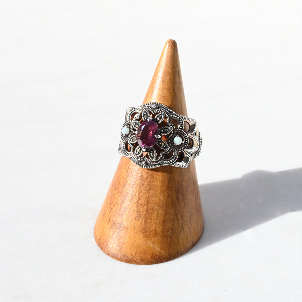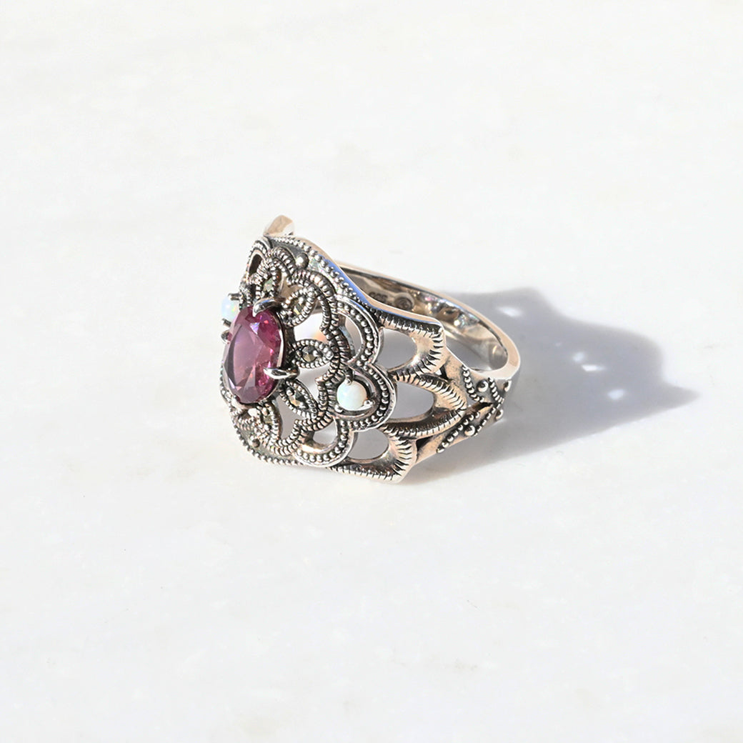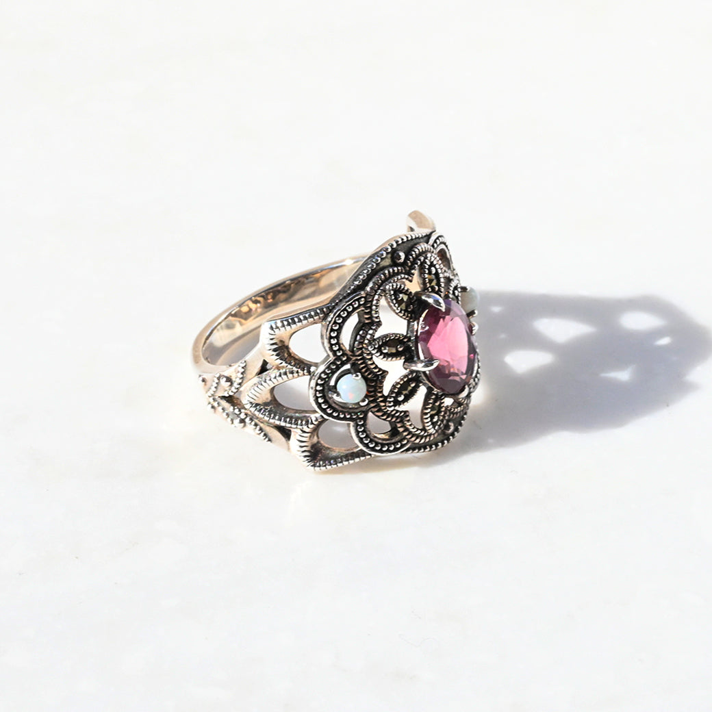 繊細で装飾性の高いデザインが印象的な、オーネイト リング。SILVER925の落ち着いた輝きに、クラシカルなマーカサイト、やわらかく幻想的にきらめくオパール、深みのある色合いのガーネットを組み合わせた存在感のある一本です。