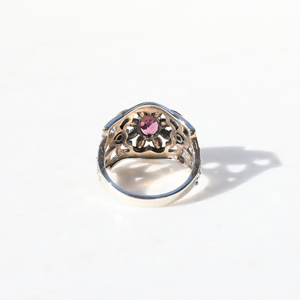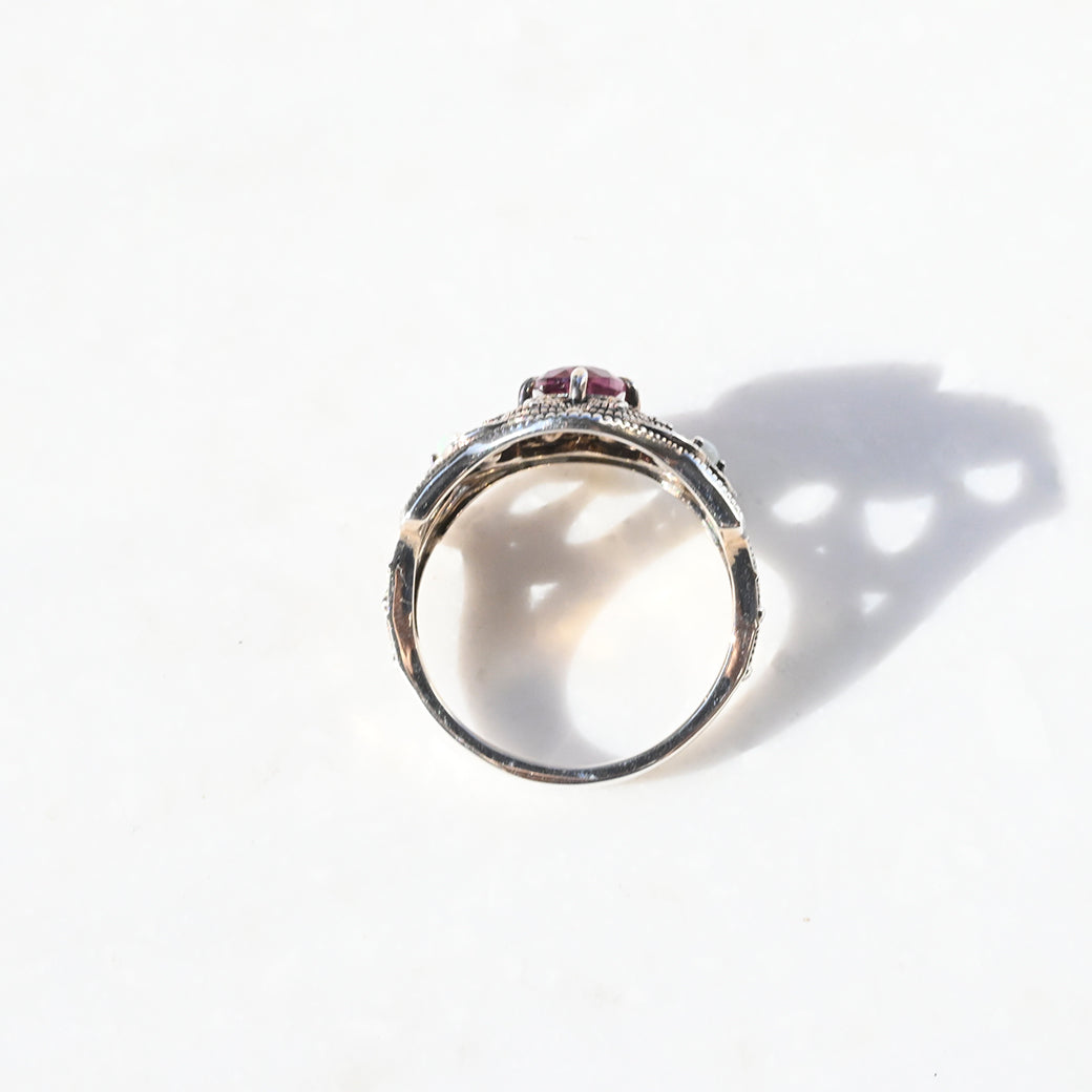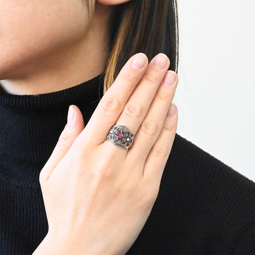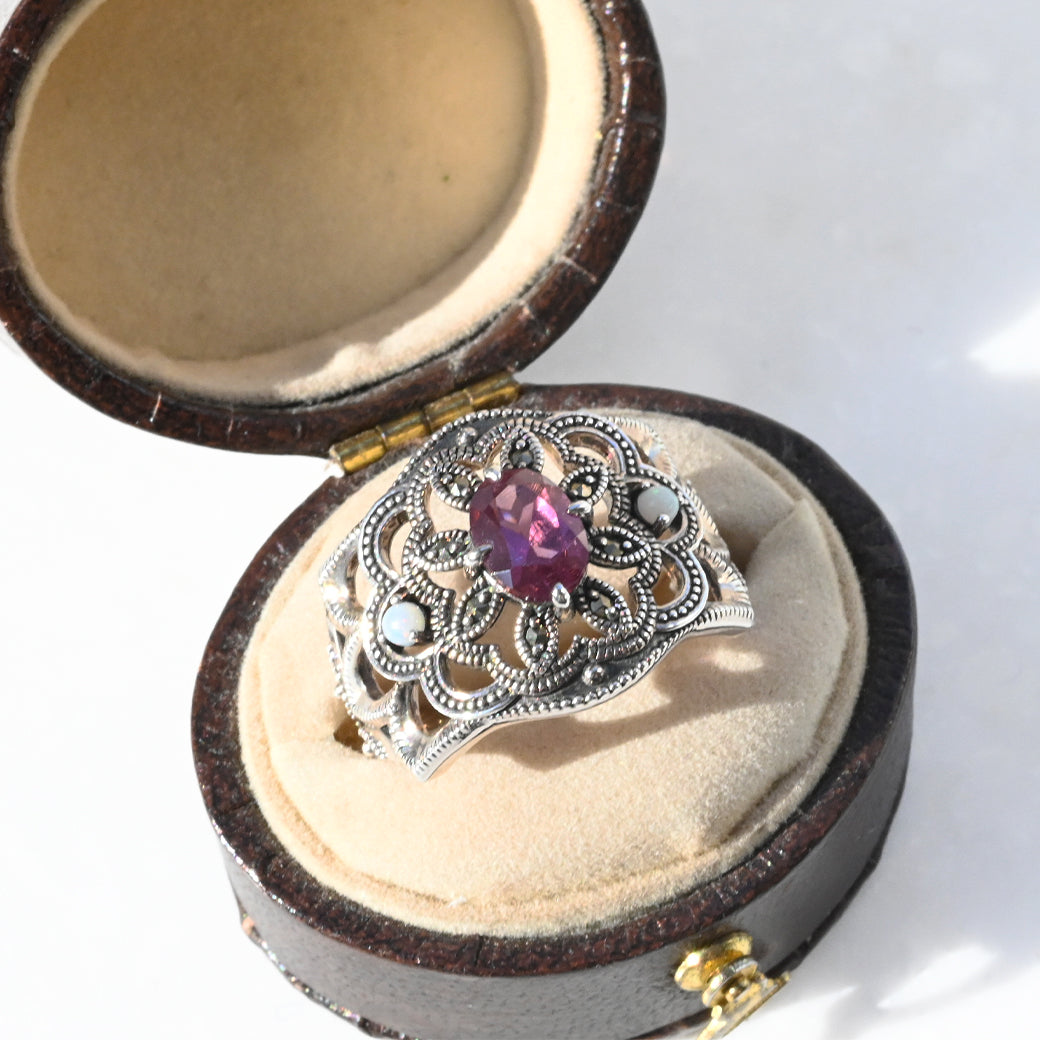 繊細で装飾性の高いデザインが印象的な、オーネイト リング。SILVER925の落ち着いた輝きに、クラシカルなマーカサイト、やわらかく幻想的にきらめくオパール、深みのある色合いのガーネットを組み合わせた存在感のある一本です。