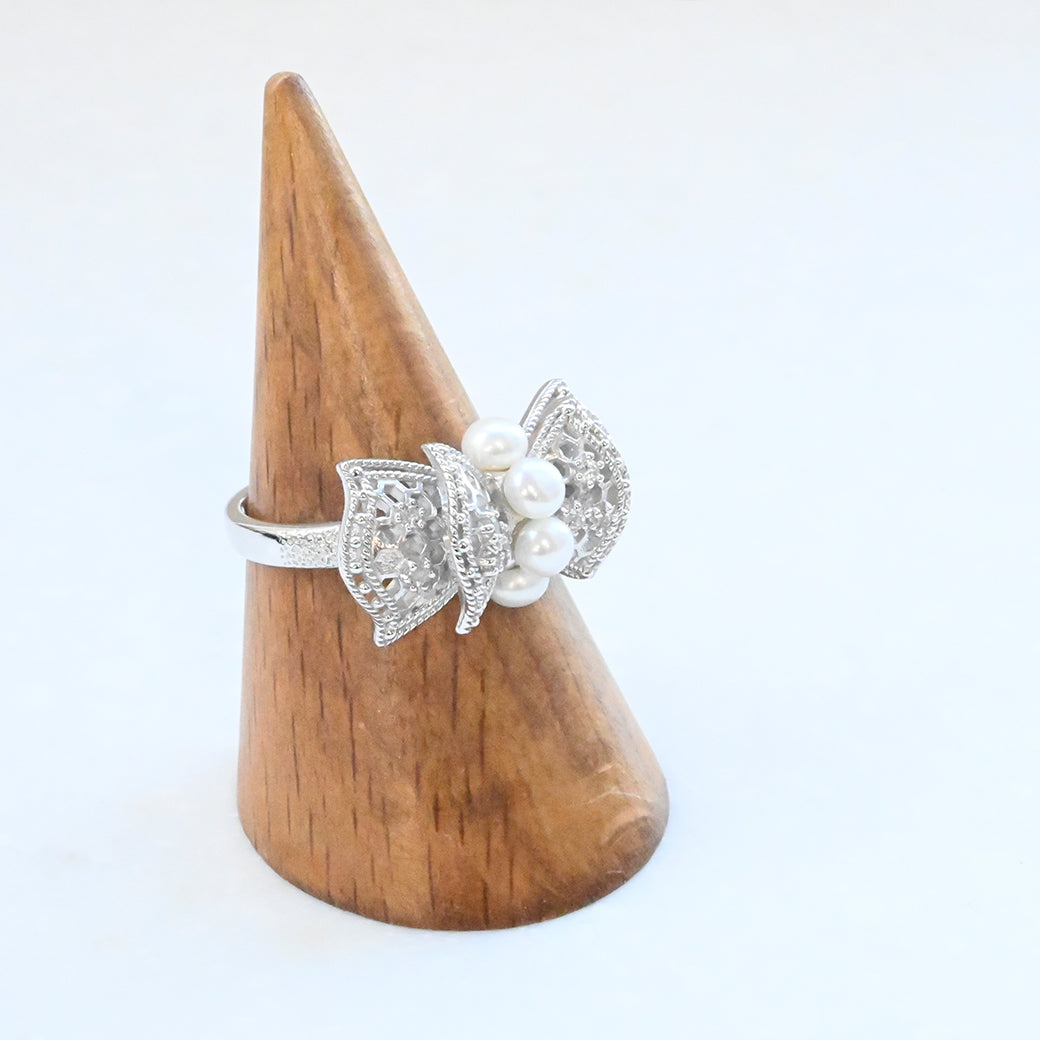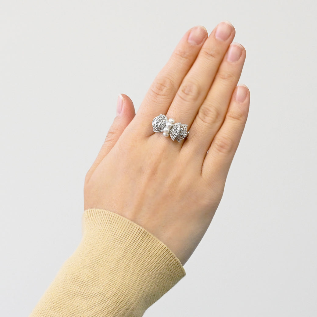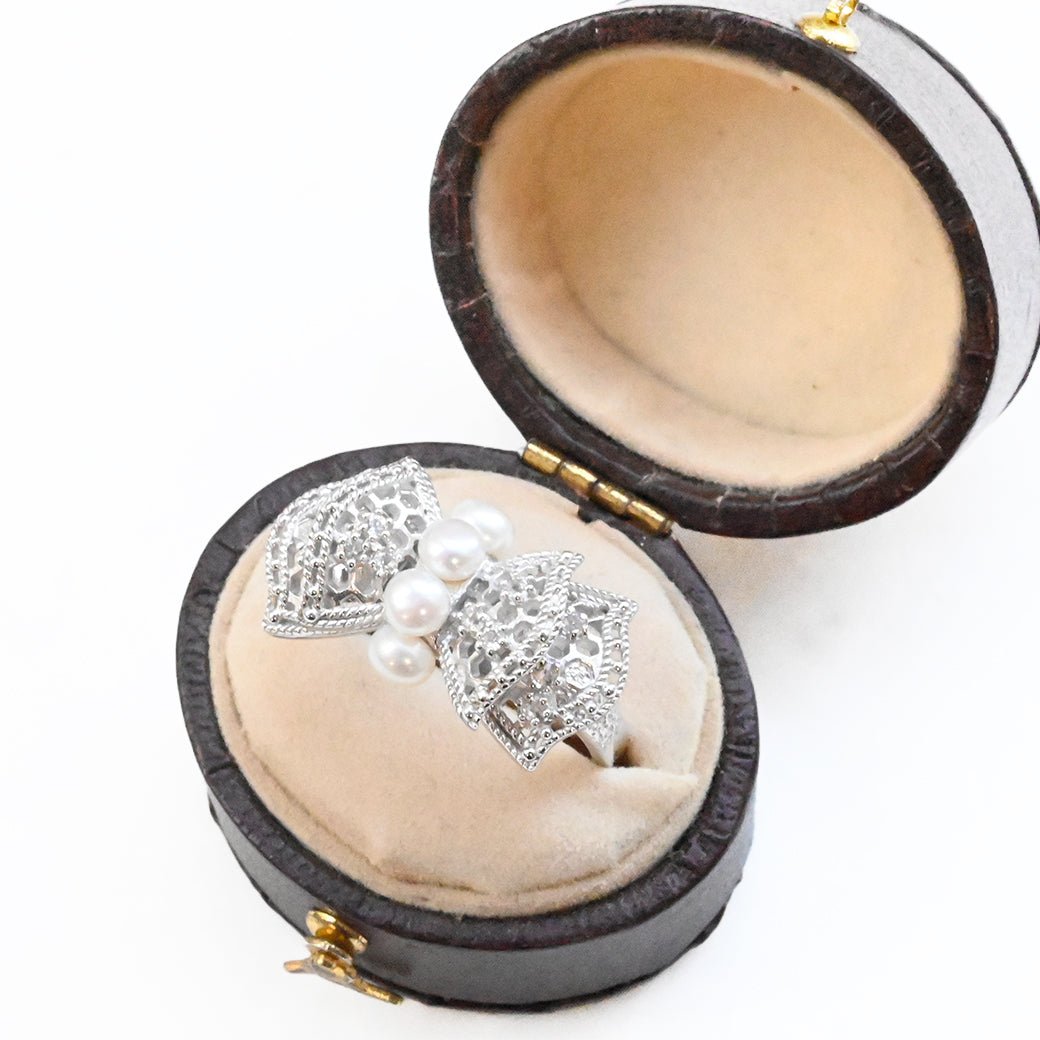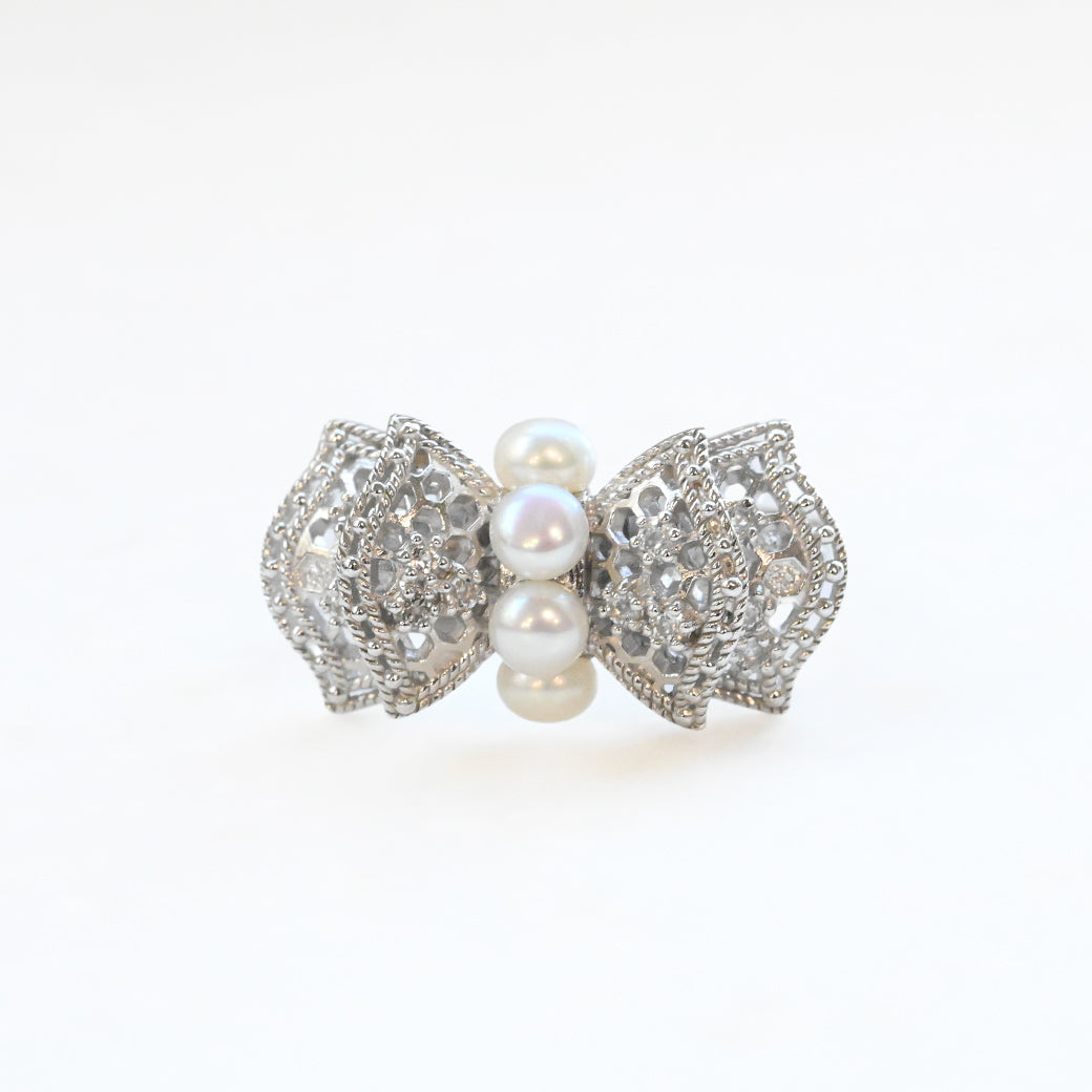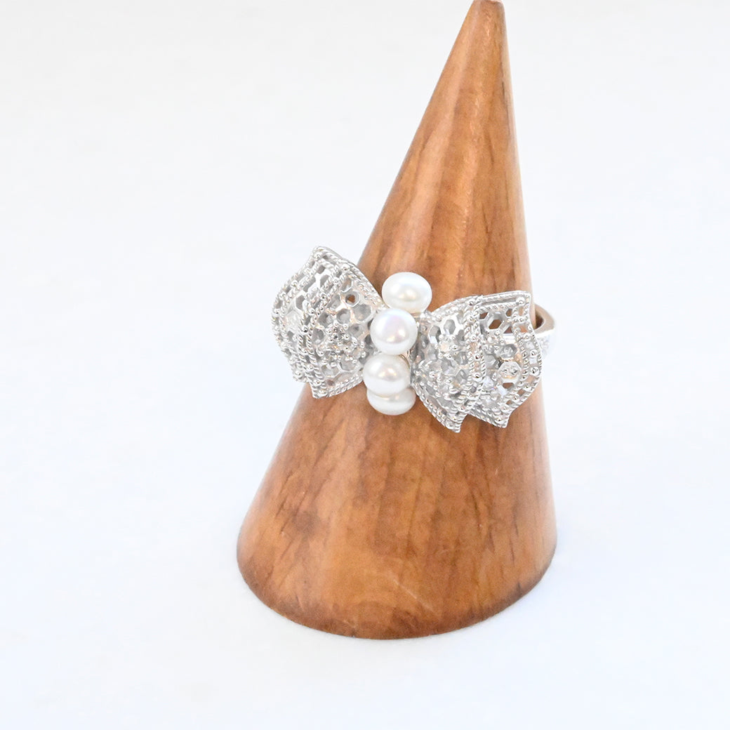 中央に並ぶ3粒のパールは、やさしい艶めきで指先に上品な存在感をもたらし、リボンの両翼には細やかな銀細工の中にトパーズのきらめきが光ります。立体的にデザインされたリボンのフォルムが、ジュエリーとしての完成度を一層高めています。