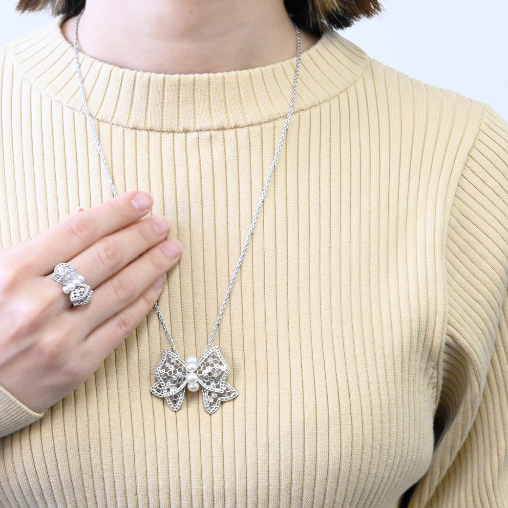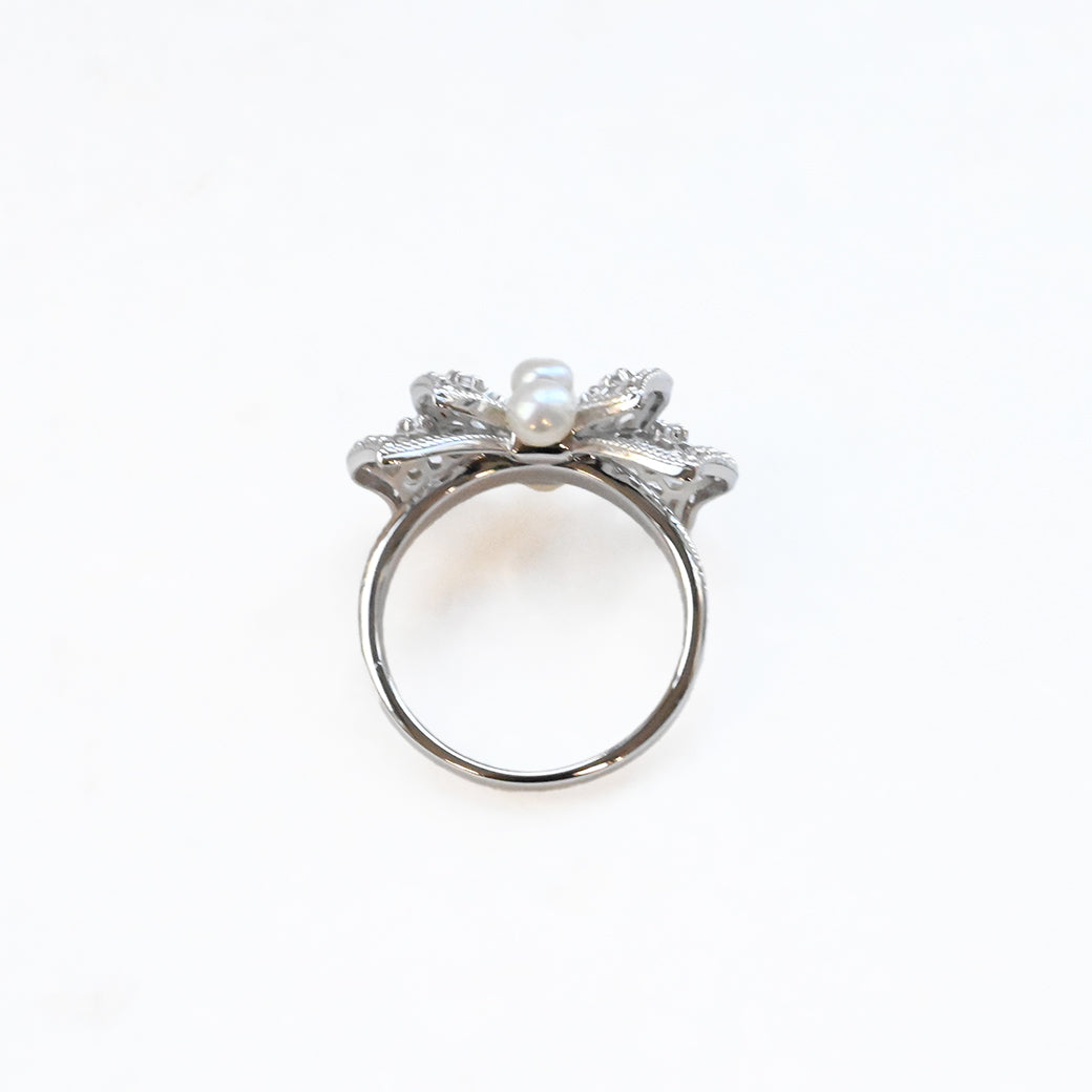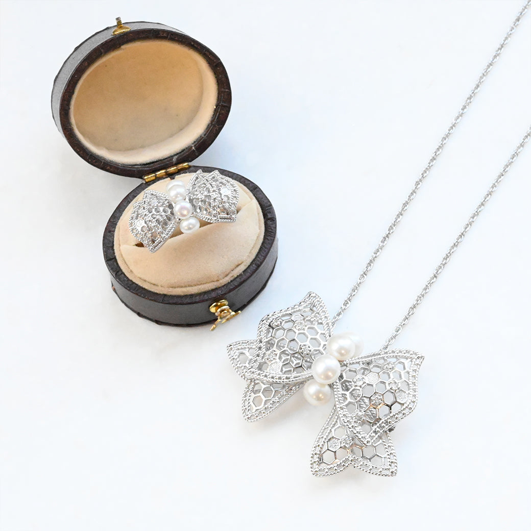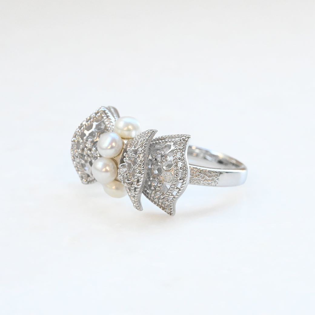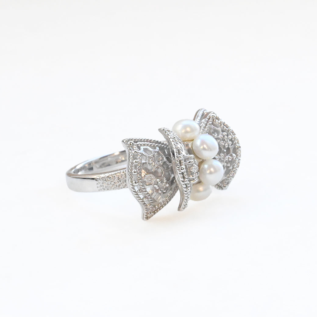 中央に並ぶ3粒のパールは、やさしい艶めきで指先に上品な存在感をもたらし、リボンの両翼には細やかな銀細工の中にトパーズのきらめきが光ります。立体的にデザインされたリボンのフォルムが、ジュエリーとしての完成度を一層高めています。