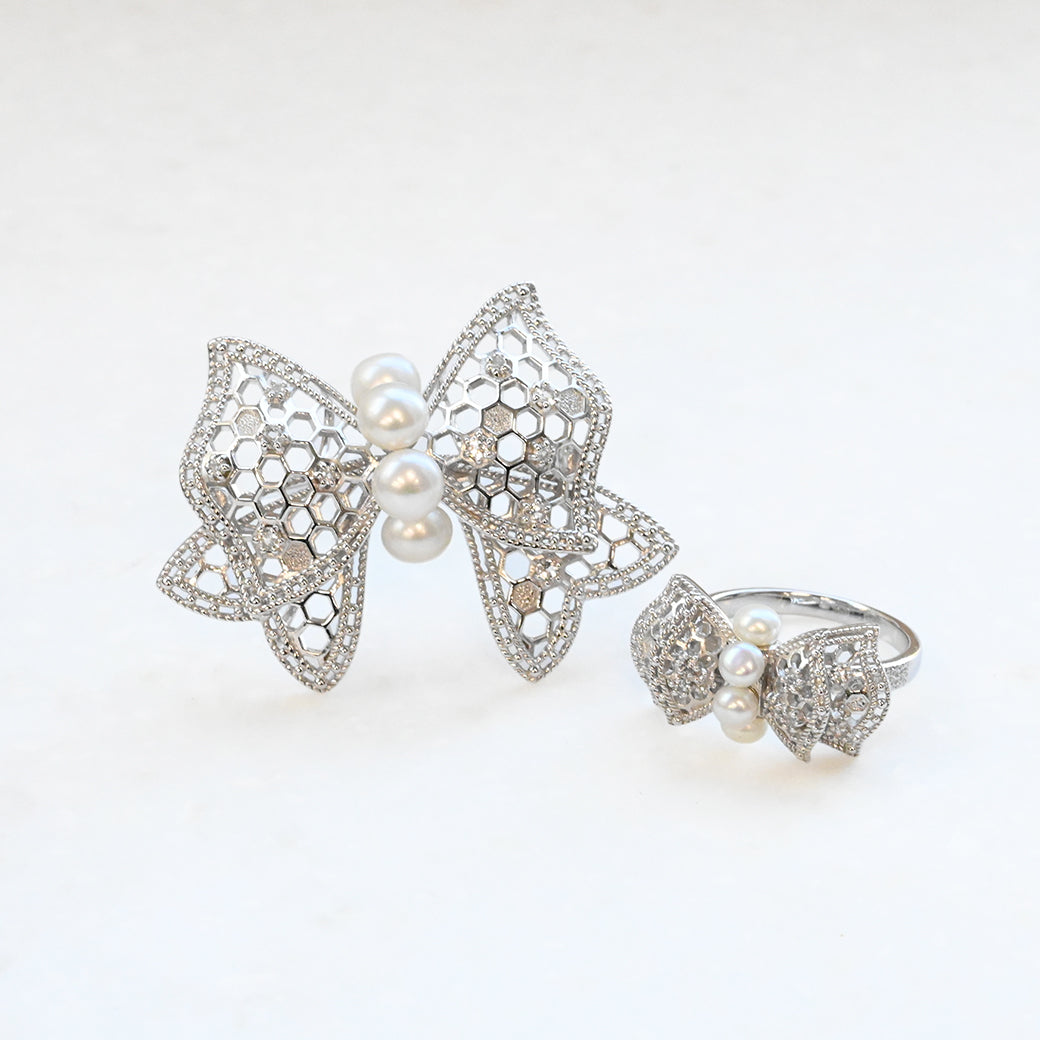 《ルバン・ミエル(蜂蜜のリボン)》――繊細な透かし模様と立体感のあるフォルムが印象的なリボンデザインに、淡水パールとホワイトトパーズの輝きを添えた、クラシカルで可憐なリングです。