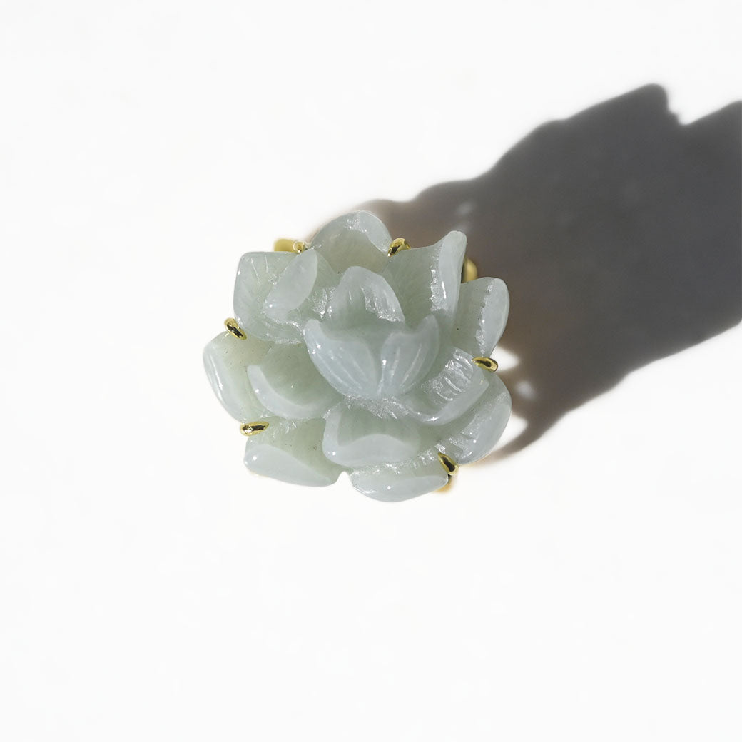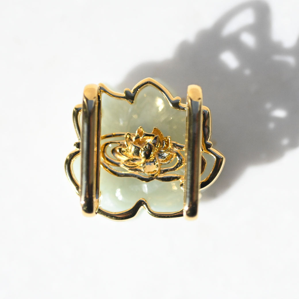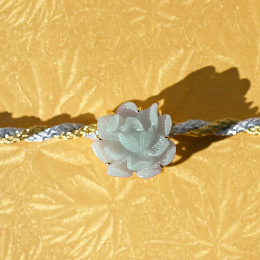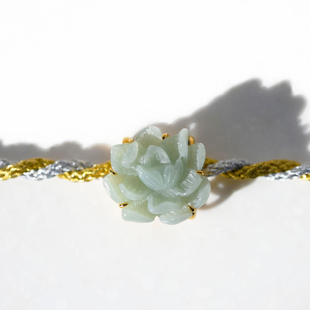 気品あふれる淡い緑色の翡翠を、繊細な蓮の花のモチーフに彫刻した帯留めです。蓮は古来より「清らかさ」や「再生」の象徴とされ、日本の和装にもよく調和する縁起の良いデザインです。高品質なSILVER 925製の金具により、しっかりとした装着感と上品な輝きを兼ね備えています。