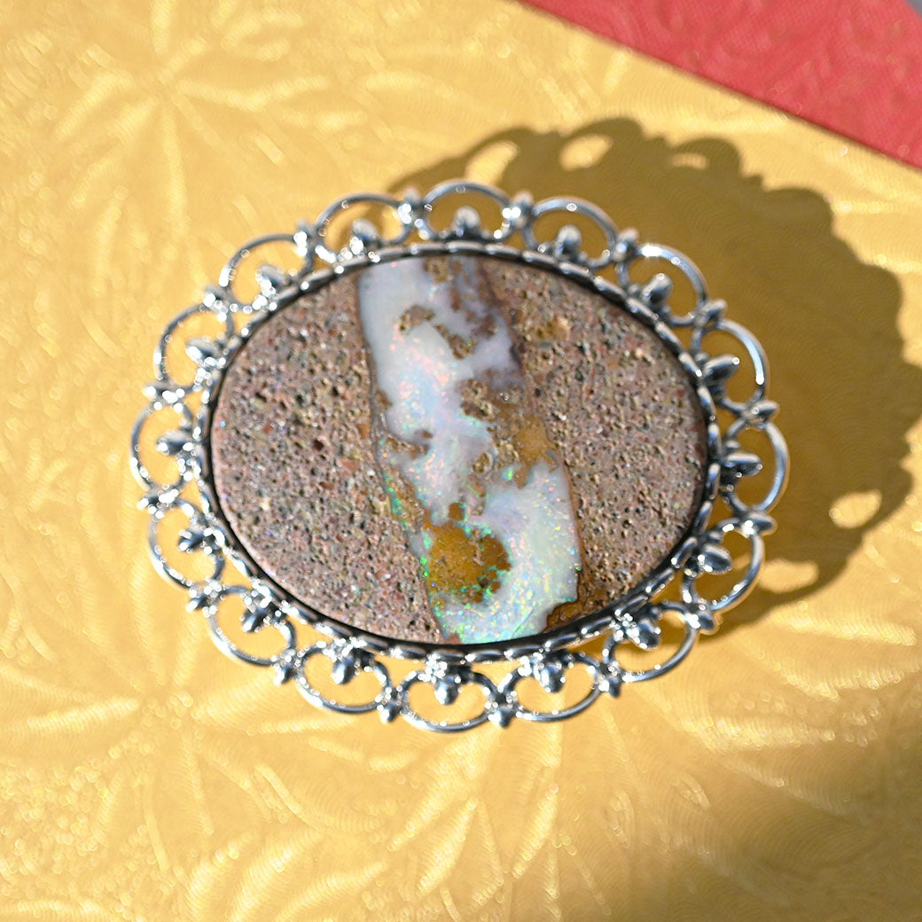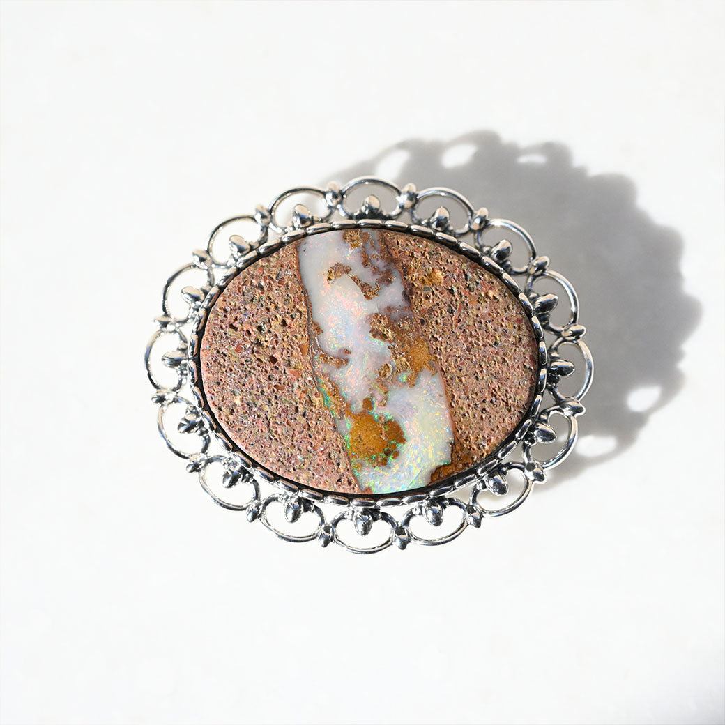 〈素材〉シルバー925〈石〉ボルダーオパール〈モチーフサイズ〉最大縦約43mm×横約50mm〈帯留め金具の内径〉18mm×5mm