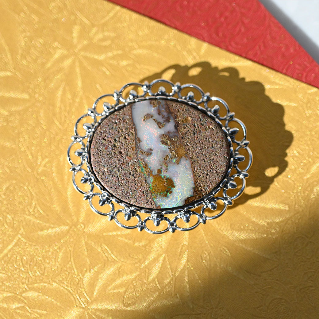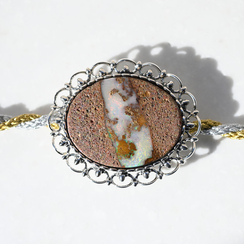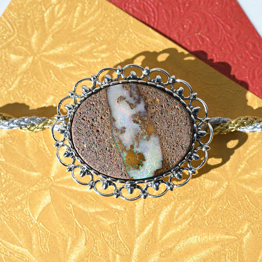 まるで自然が描いた抽象画——ボルダーオパールアート帯留めは、大地のぬくもりと静かな輝きを帯元に宿す、和装のためのアートピースです。