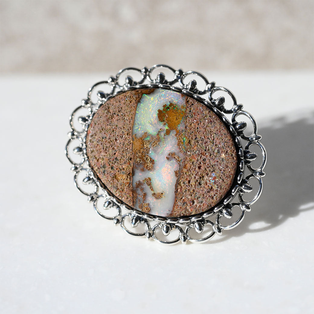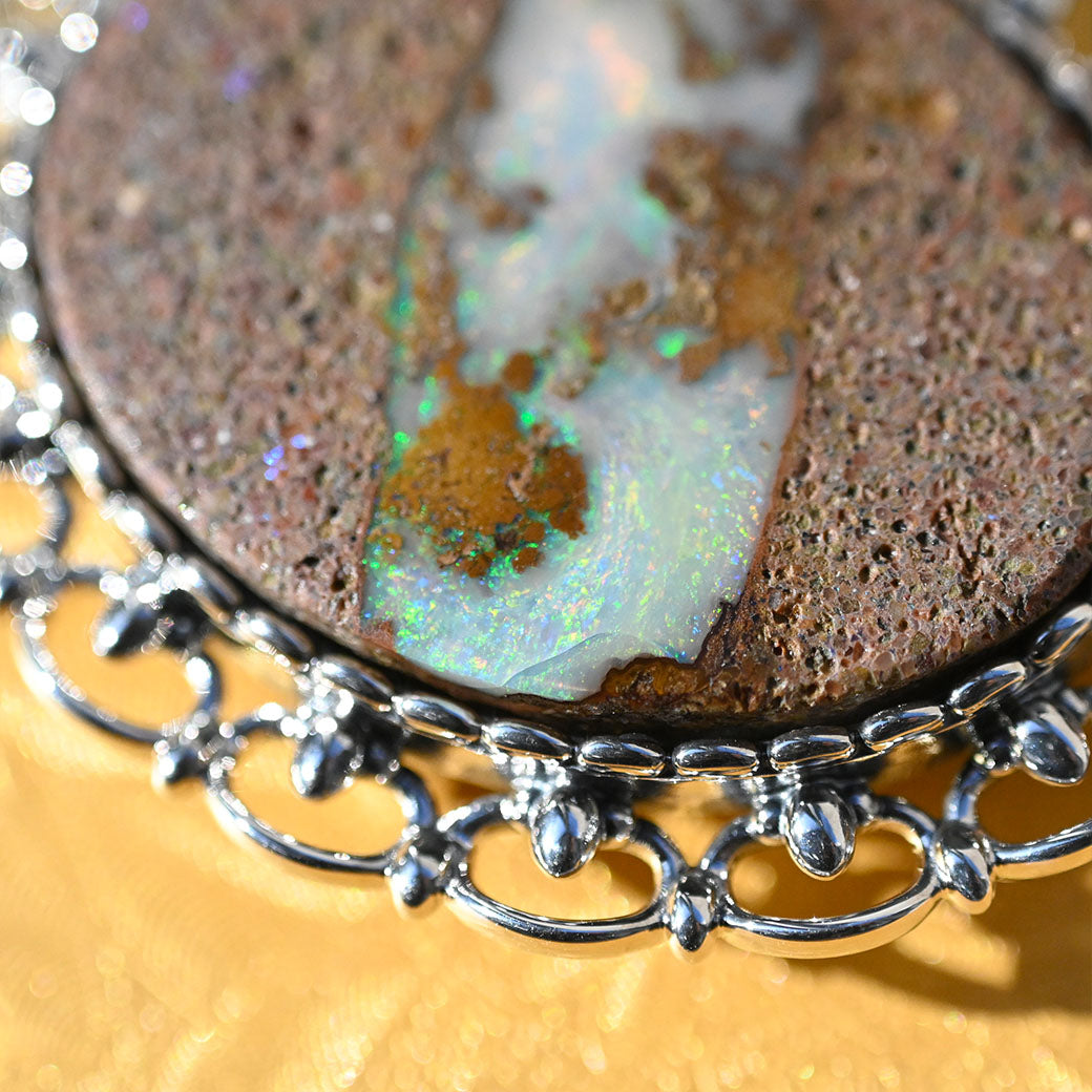 ひとつとして同じ模様のないボルダーオパールは、オーストラリアの大地が長い時をかけて育んだ天然石。その中に浮かぶ虹色の輝きは、まるで宵空に瞬く星のように幻想的です。