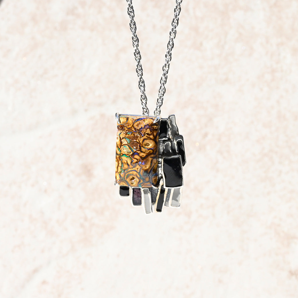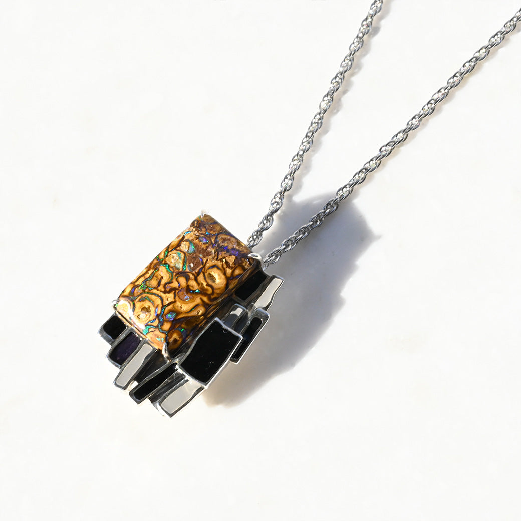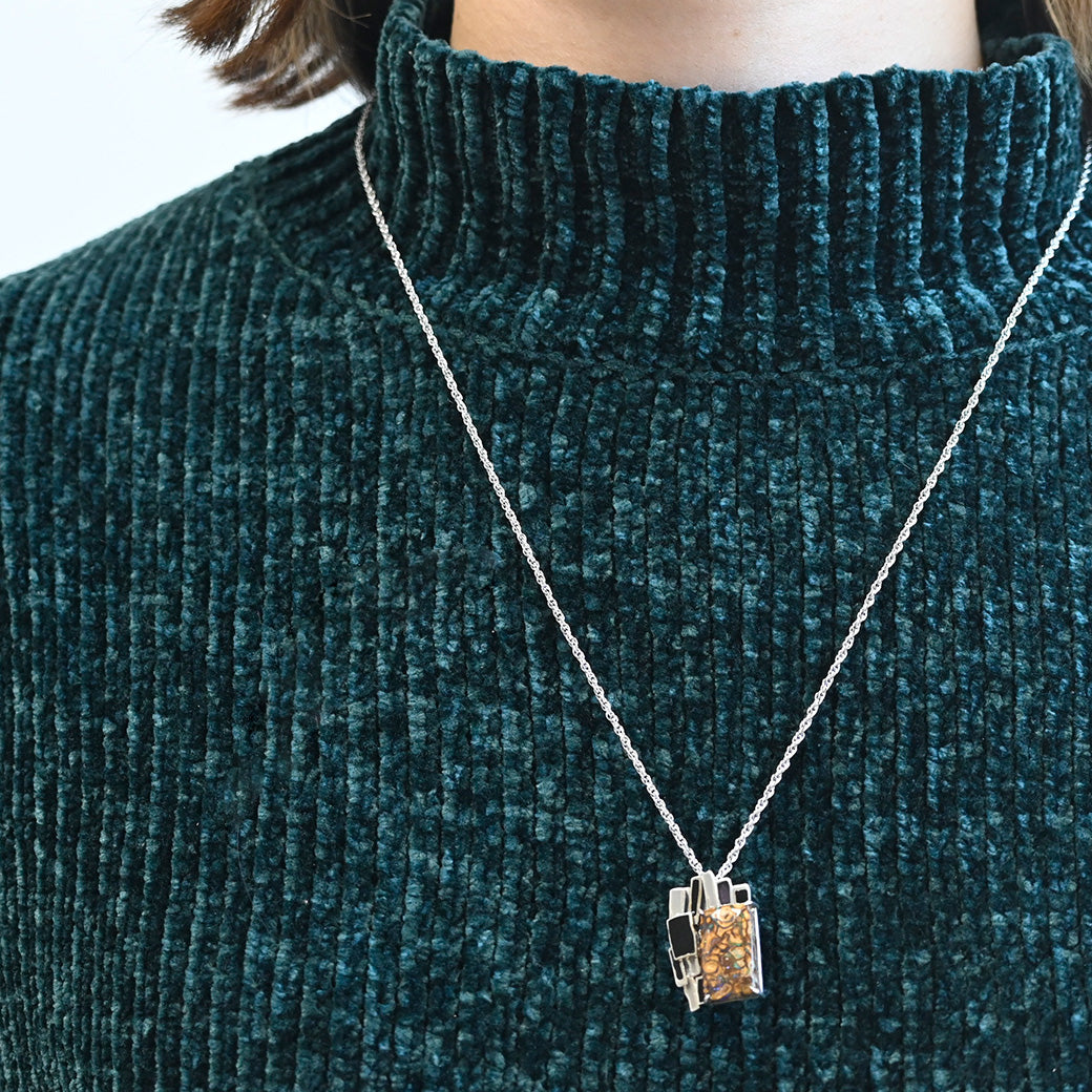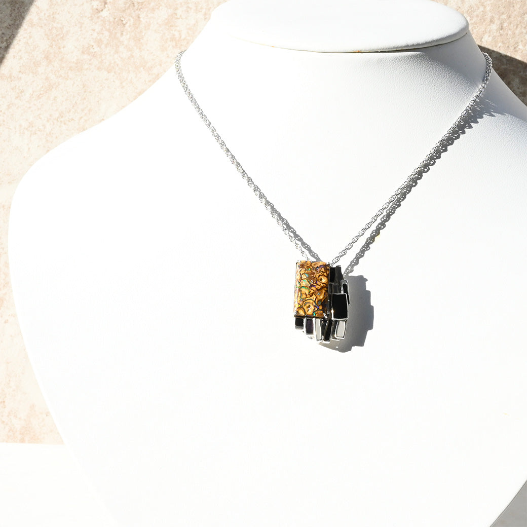 金箔と装飾美の象徴ともいえるクリムトの傑作《接吻》から着想を得た、唯一無二のペンダント。アーティスティックなピクチャーオパールの独特な模様と、幾何学的なエナメル装飾が融合し、まるで絵画を身にまとうかのような感覚に。