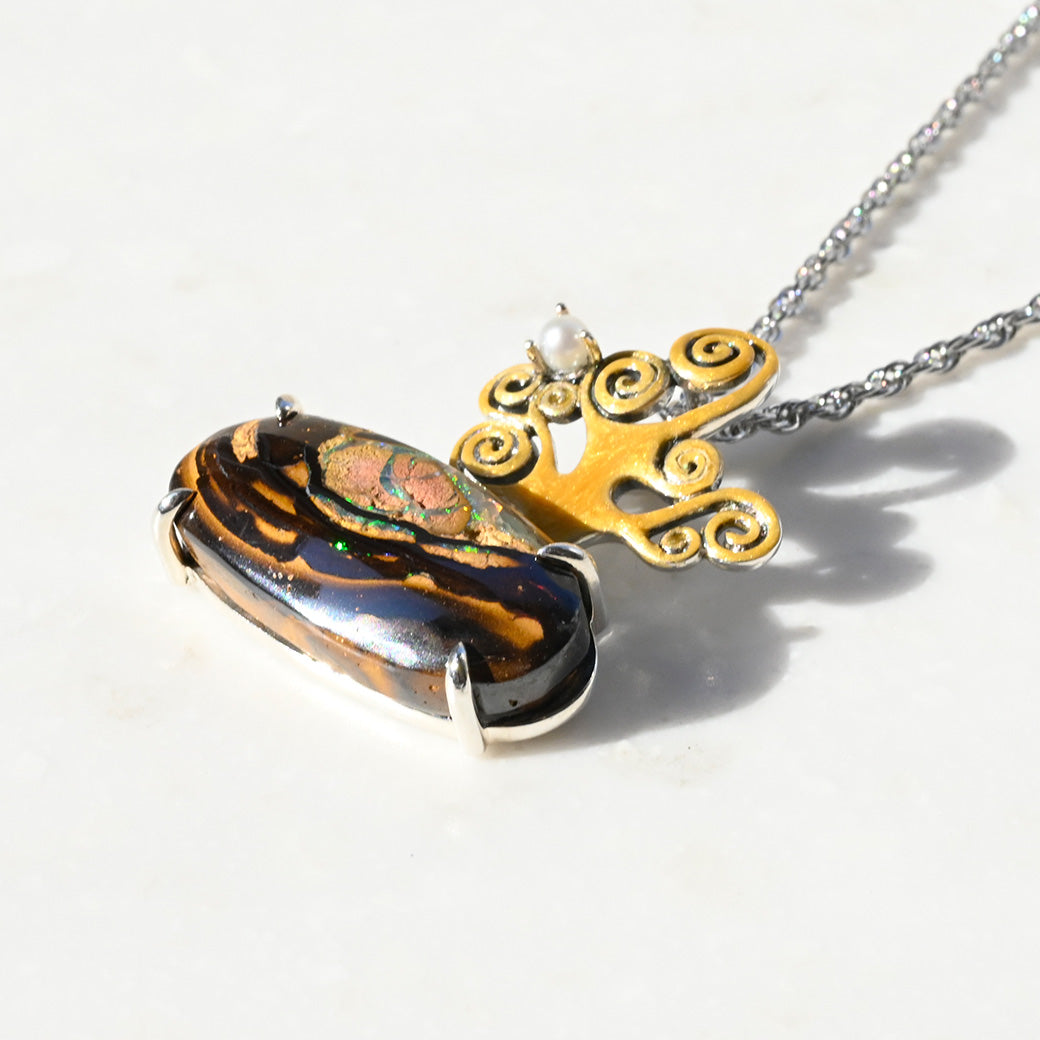 地層のように深い表情を持つピクチャーオパールは、大地のエネルギーと宇宙的な広がりを思わせます。アクセントにはパールを添え、自然と生命の調和を象徴しています。