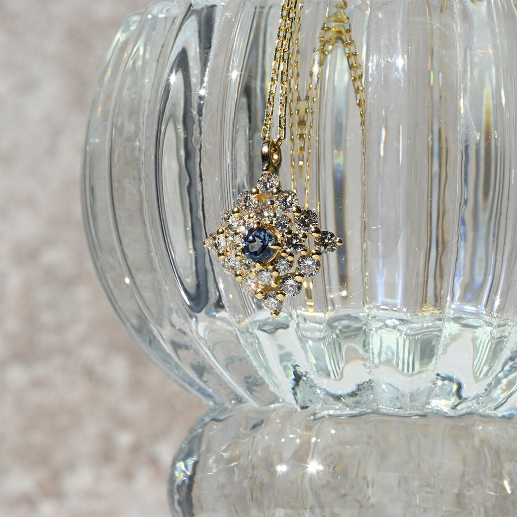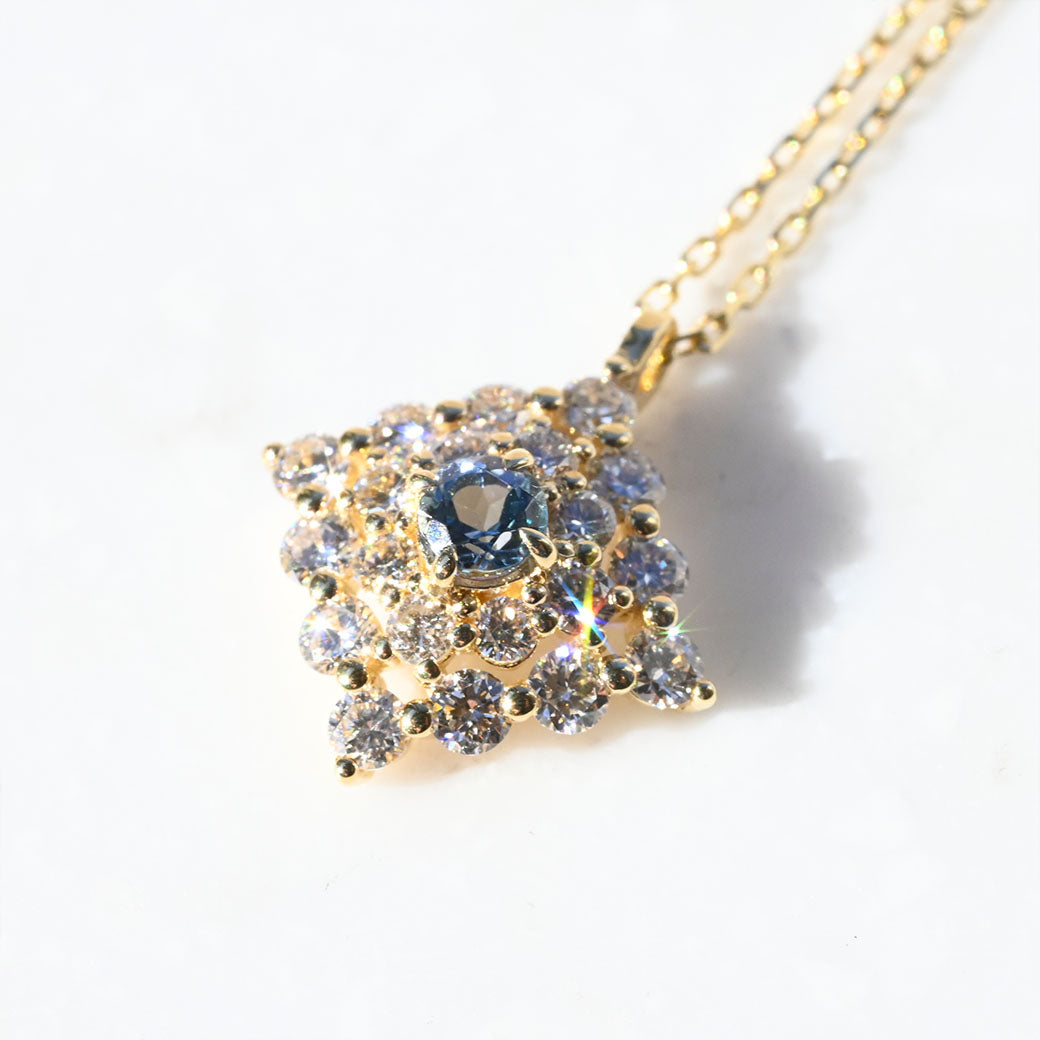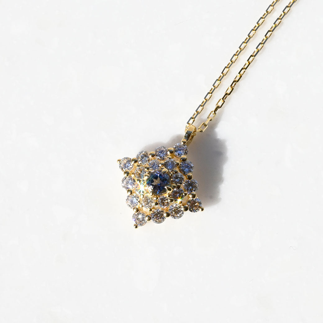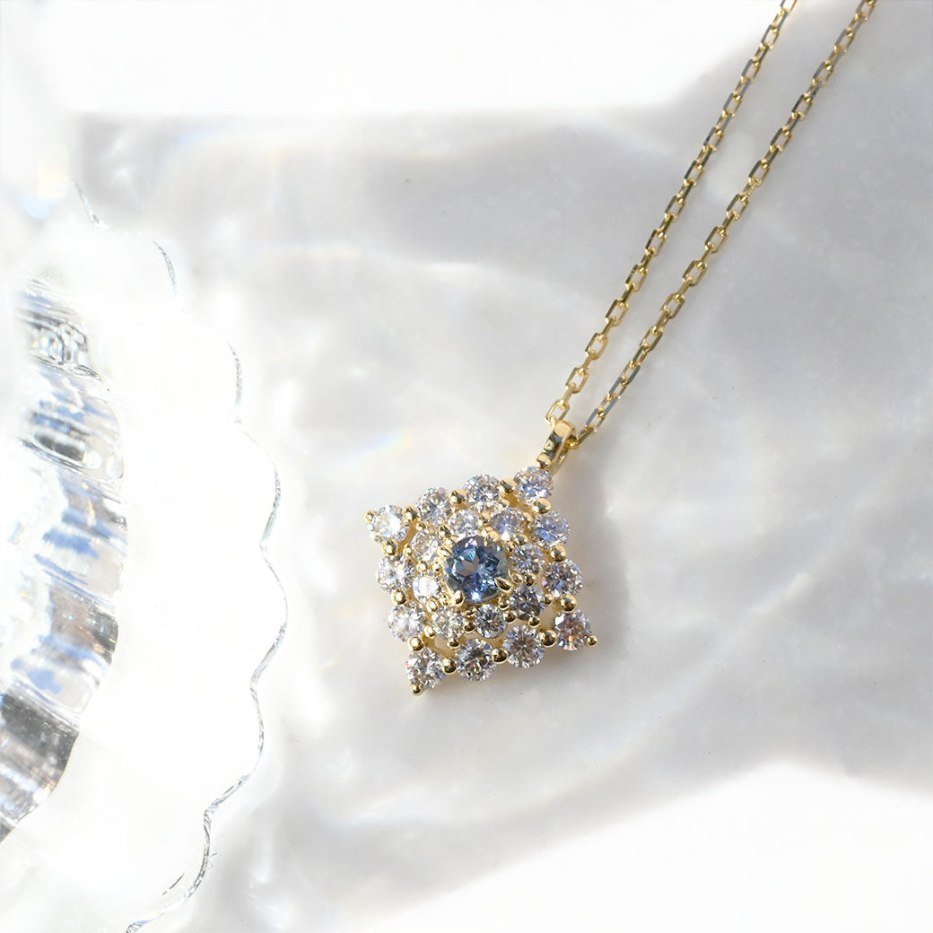 神秘的なブルーグリーンの輝きを放つ希少石・コーネルピンを主役に据えた、ラグジュアリーなペンダント「Étoile Mystique(エトワール・ミスティーク)」。「神秘の星」を意味するその名の通り、センターで輝くコーネルピンは、角度によって色彩が変化する多色性を持ち、まるで宇宙に瞬く星のような幻想的な表情を見せてくれます。