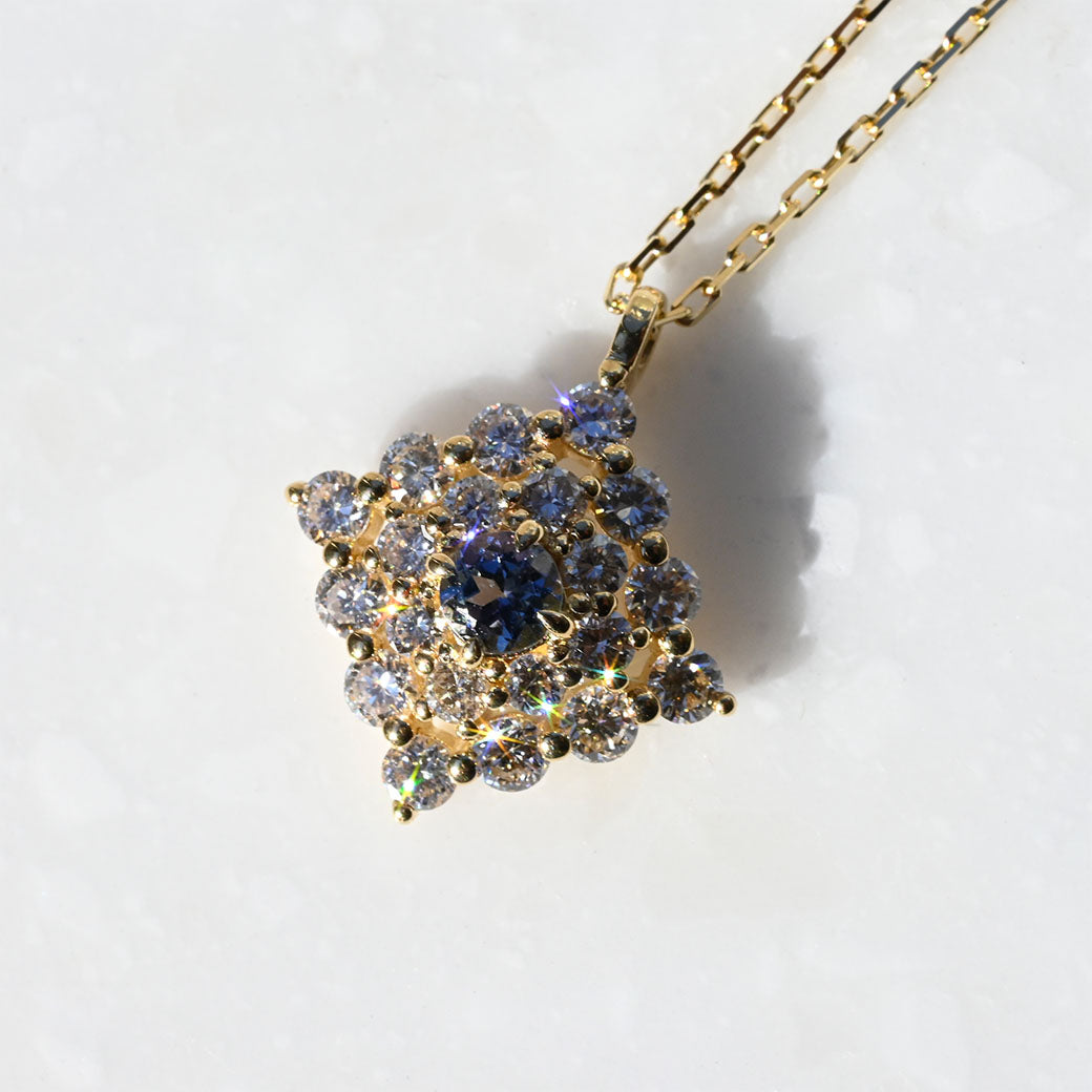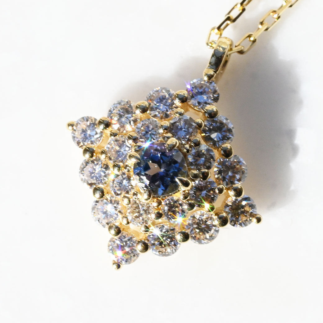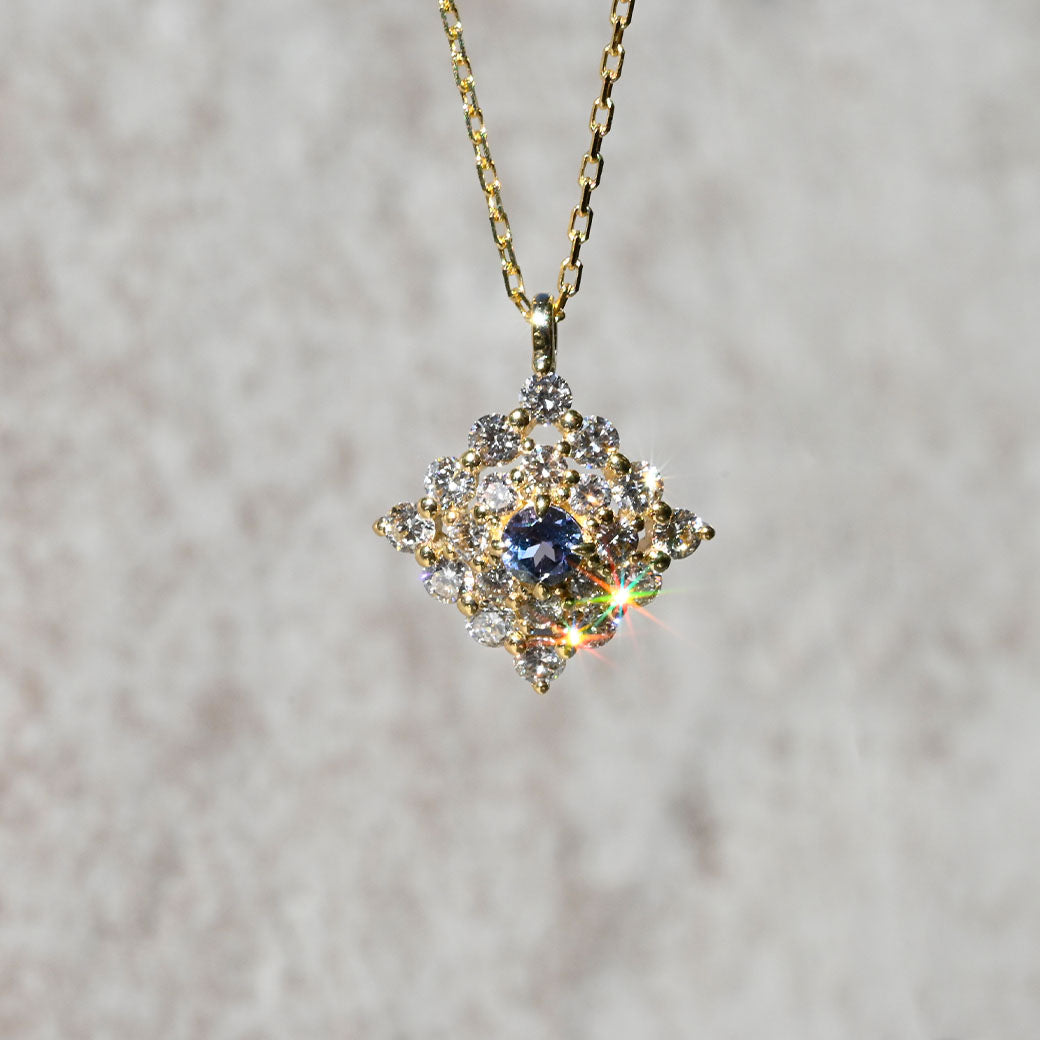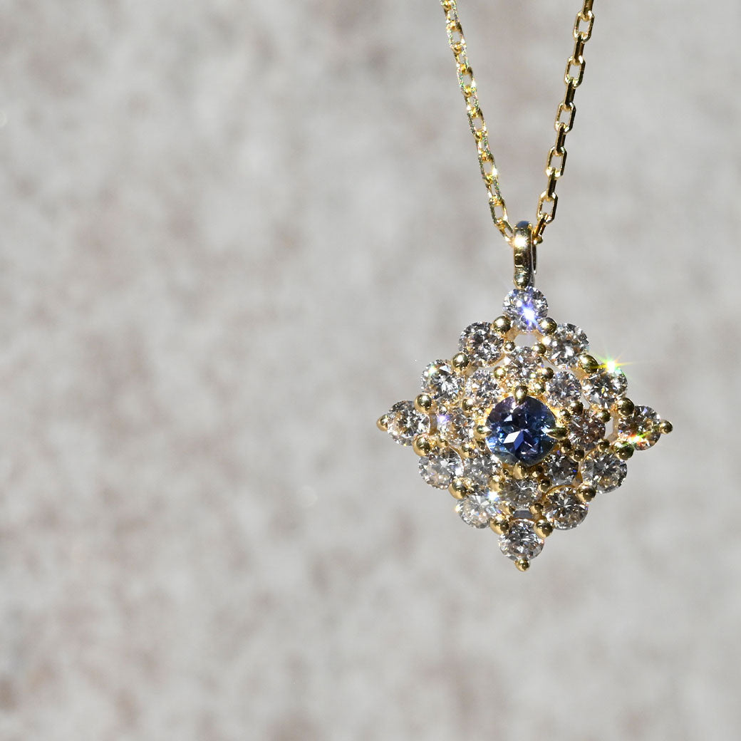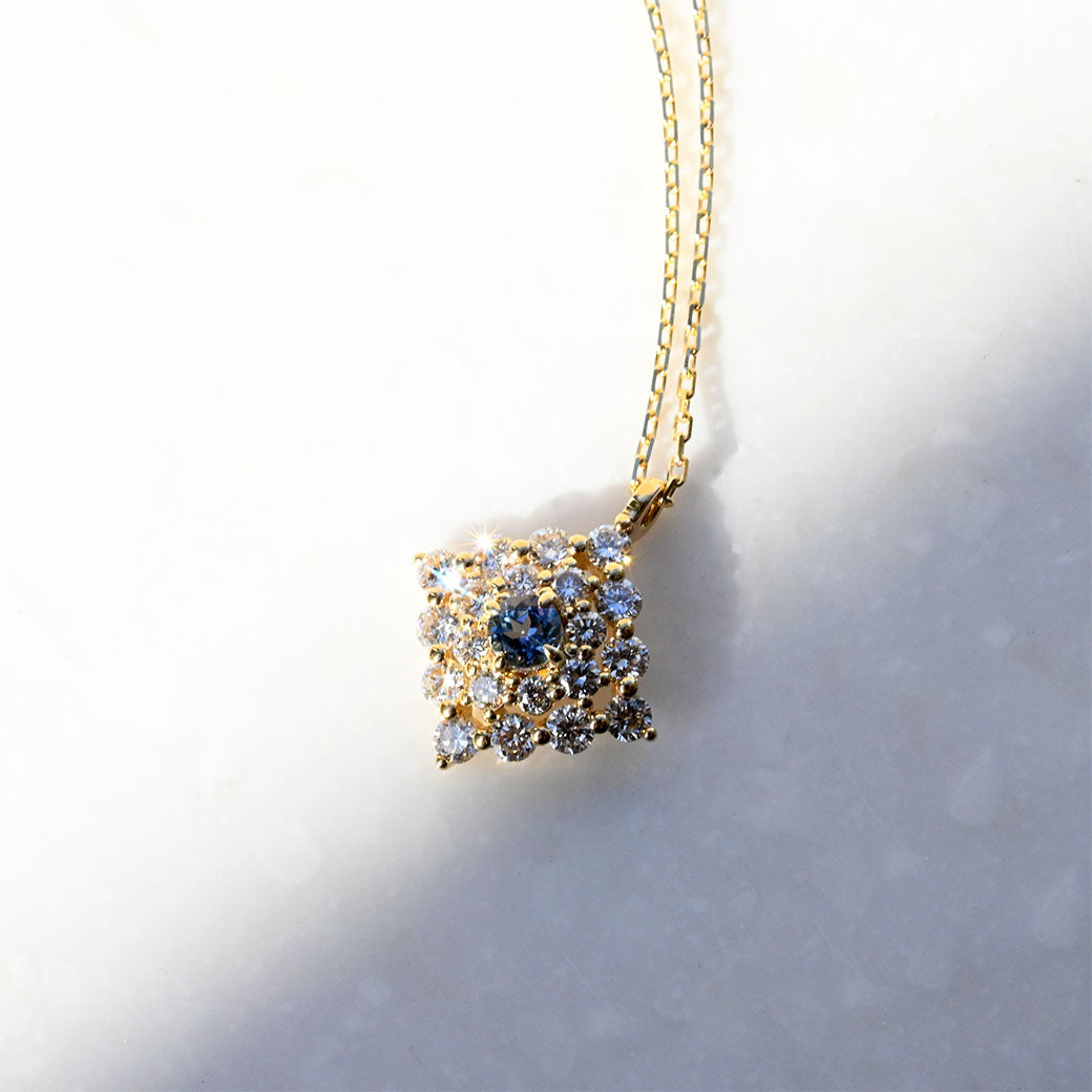 神秘的なブルーグリーンの輝きを放つ希少石・コーネルピンを主役に据えた、ラグジュアリーなペンダント「Étoile Mystique(エトワール・ミスティーク)」。「神秘の星」を意味するその名の通り、センターで輝くコーネルピンは、角度によって色彩が変化する多色性を持ち、まるで宇宙に瞬く星のような幻想的な表情を見せてくれます。
