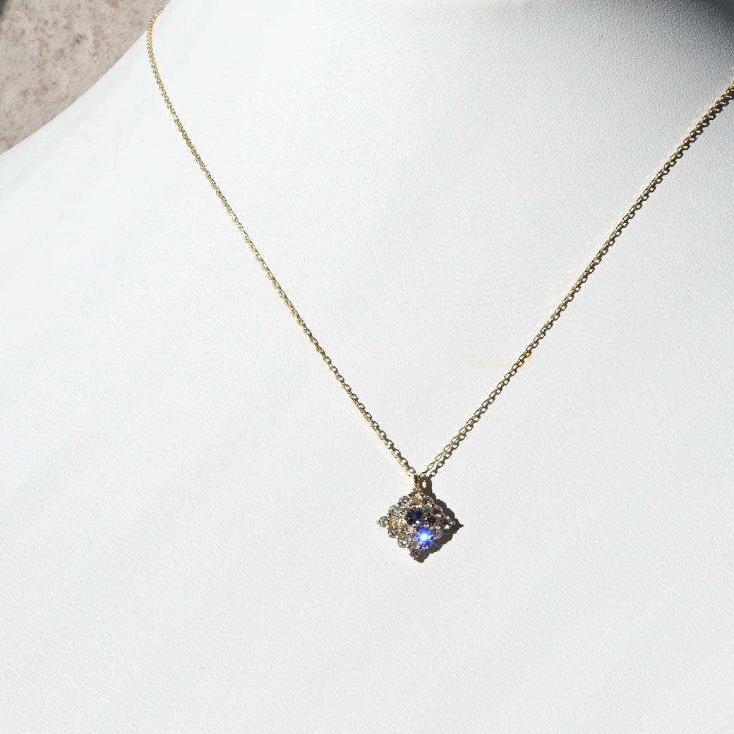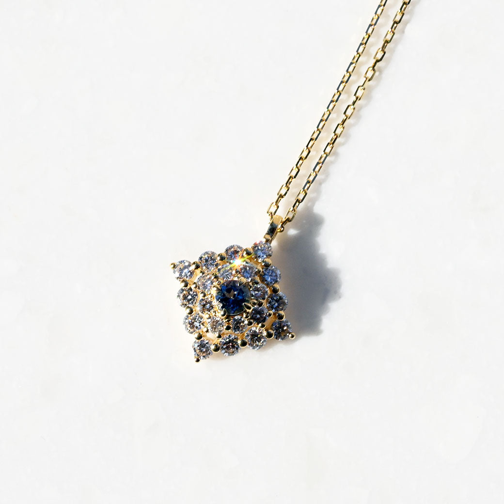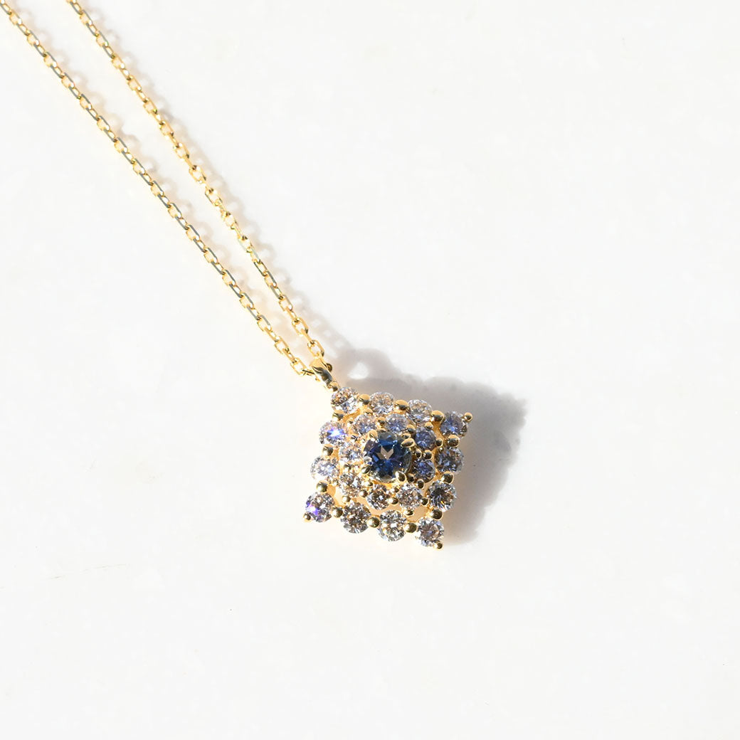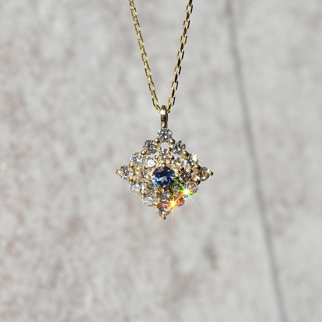 神秘的なブルーグリーンの輝きを放つ希少石・コーネルピンを主役に据えた、ラグジュアリーなペンダント「Étoile Mystique(エトワール・ミスティーク)」。「神秘の星」を意味するその名の通り、センターで輝くコーネルピンは、角度によって色彩が変化する多色性を持ち、まるで宇宙に瞬く星のような幻想的な表情を見せてくれます。