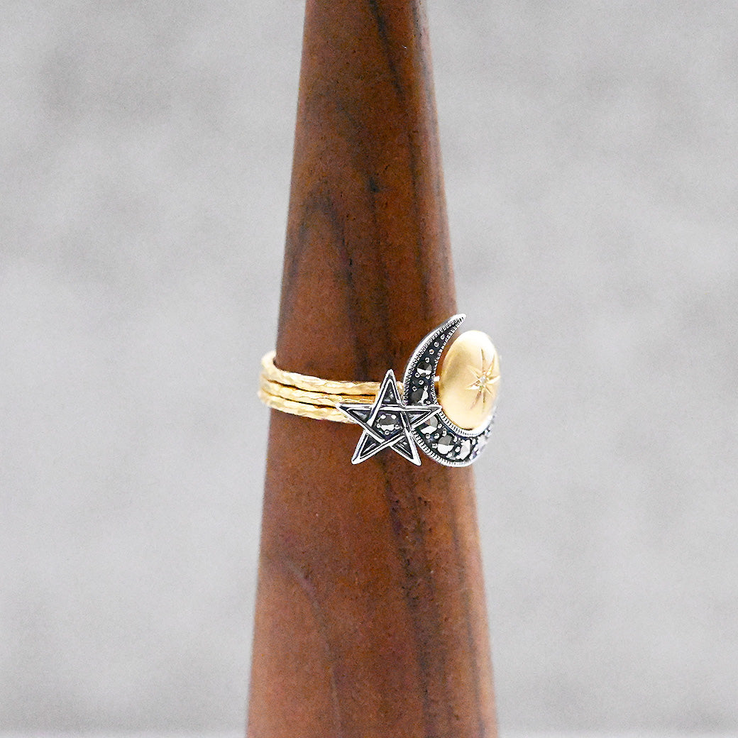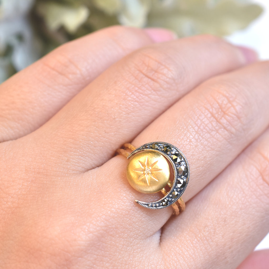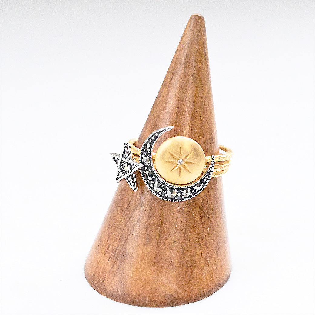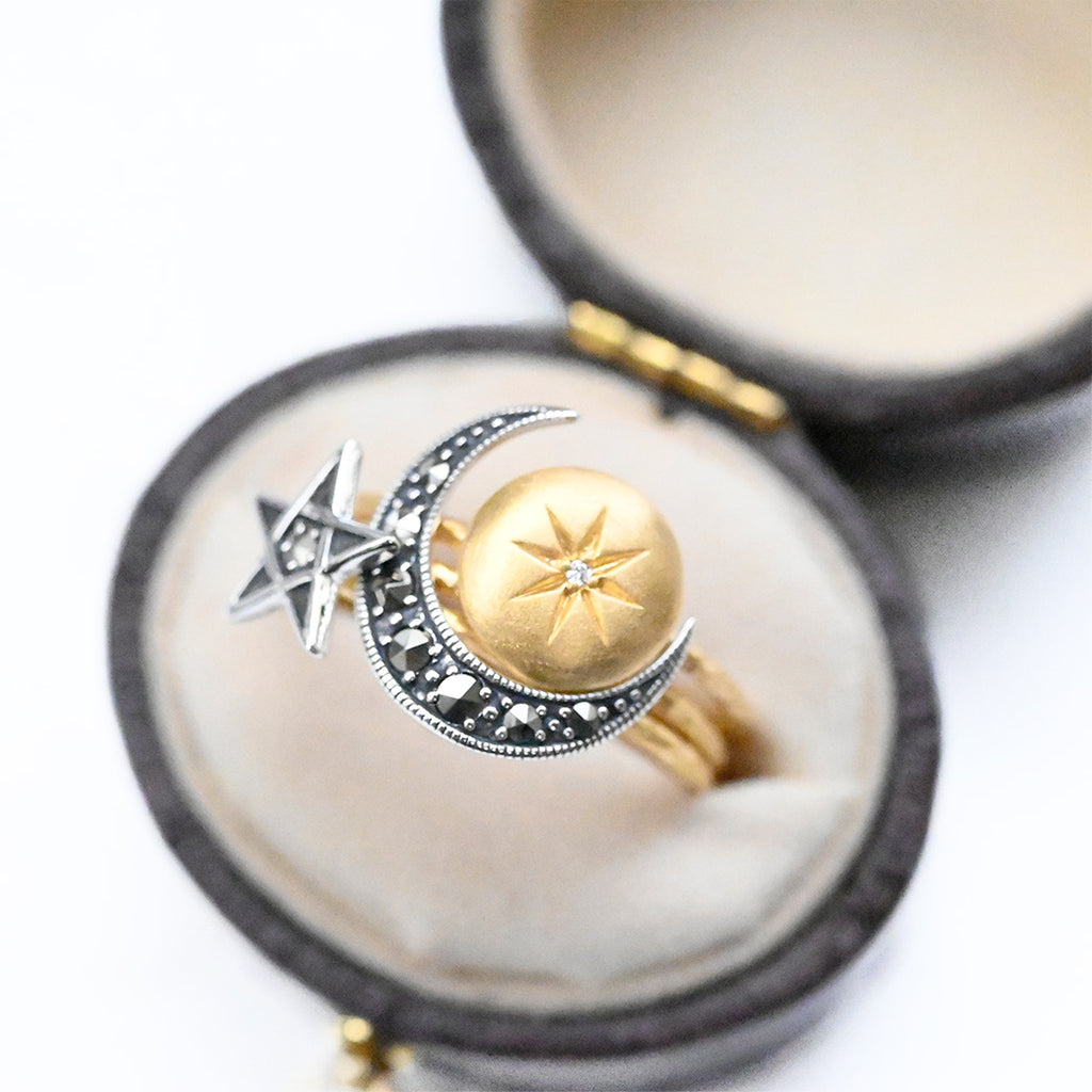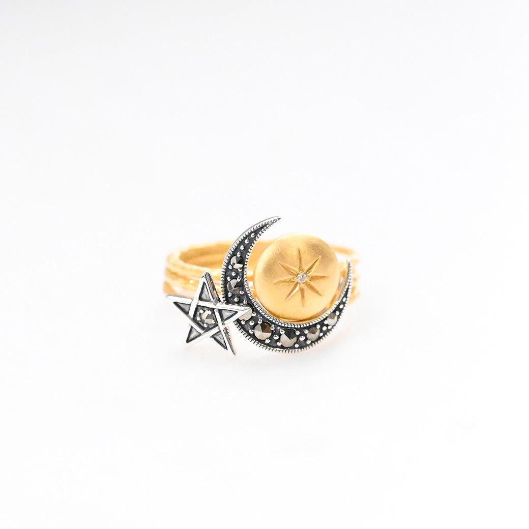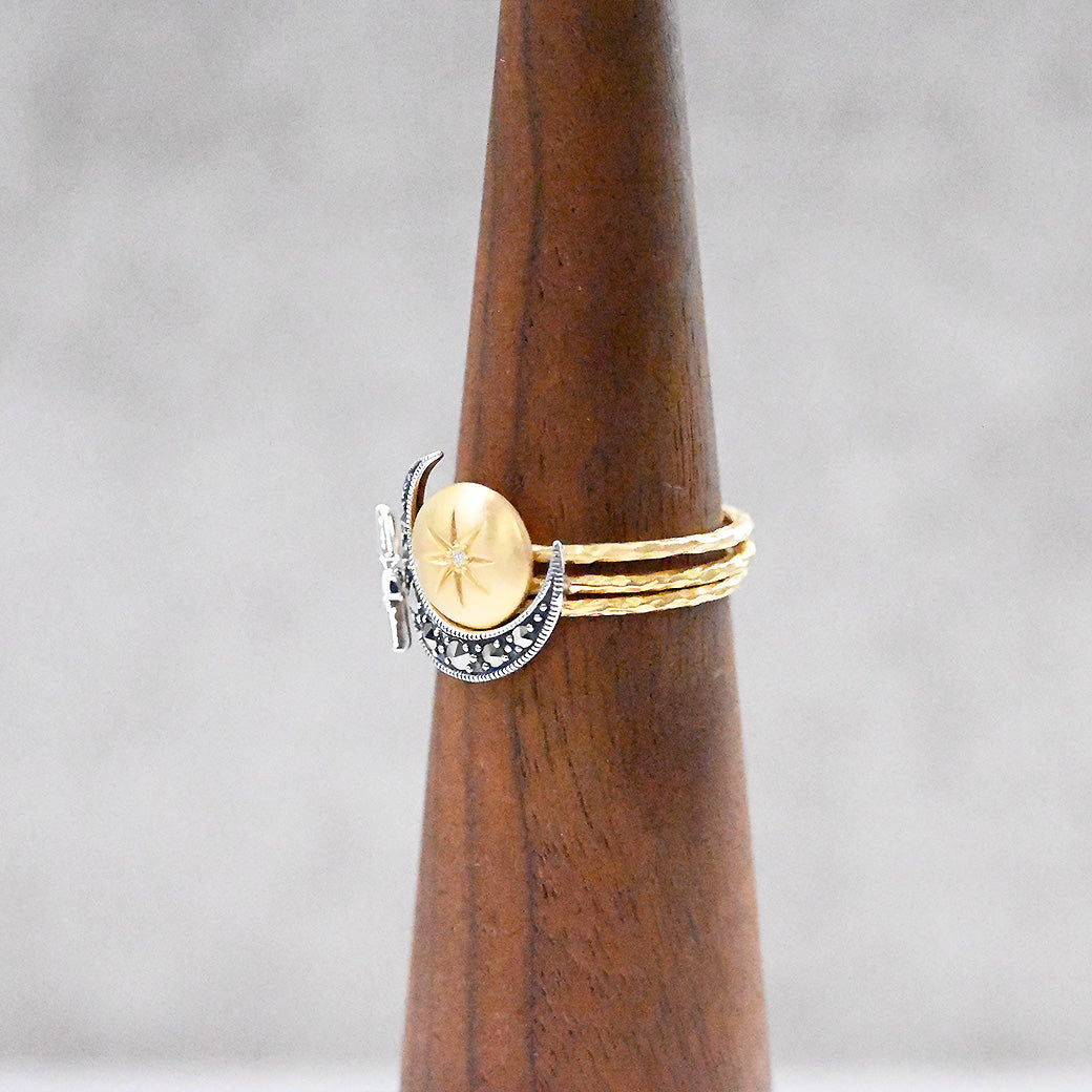 ■DETAIL〈素材〉SV925+(ゴールドメッキ)※いぶしのテクスチャーをいれています。〈石〉ダイヤモンド、マルカジット〈サイズ調整〉不可