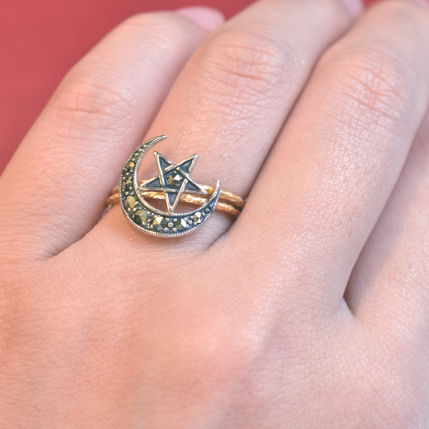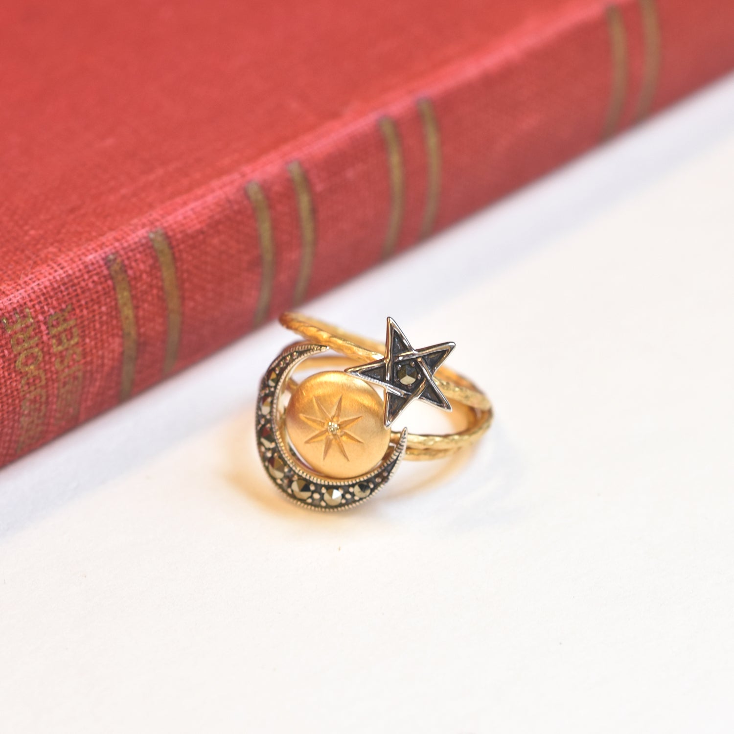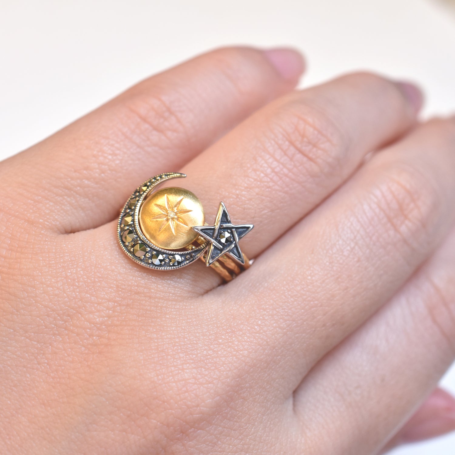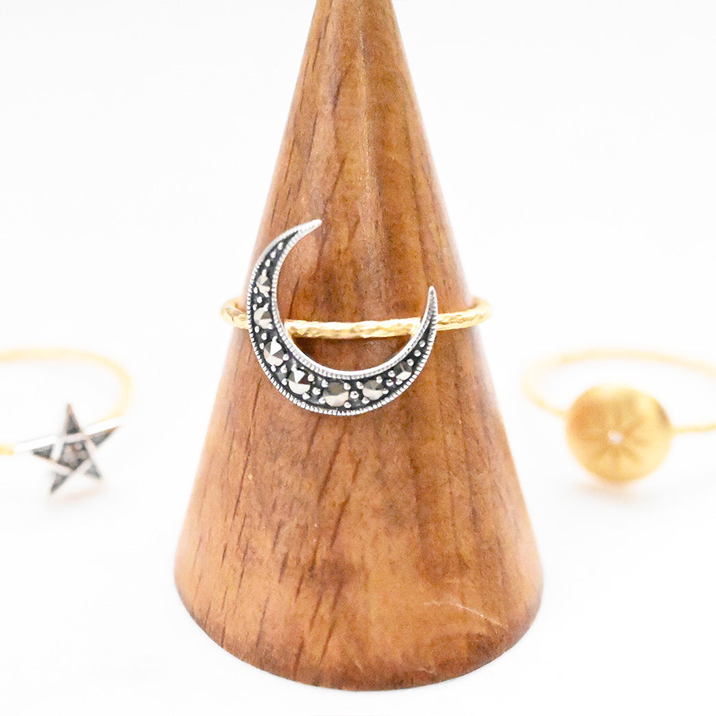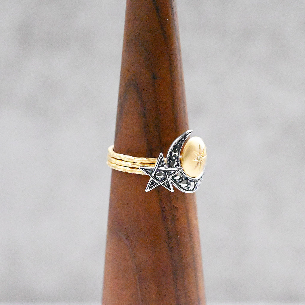 ■DETAIL〈素材〉SV925+(ゴールドメッキ)※いぶしのテクスチャーをいれています。〈石〉ダイヤモンド、マルカジット〈サイズ調整〉不可