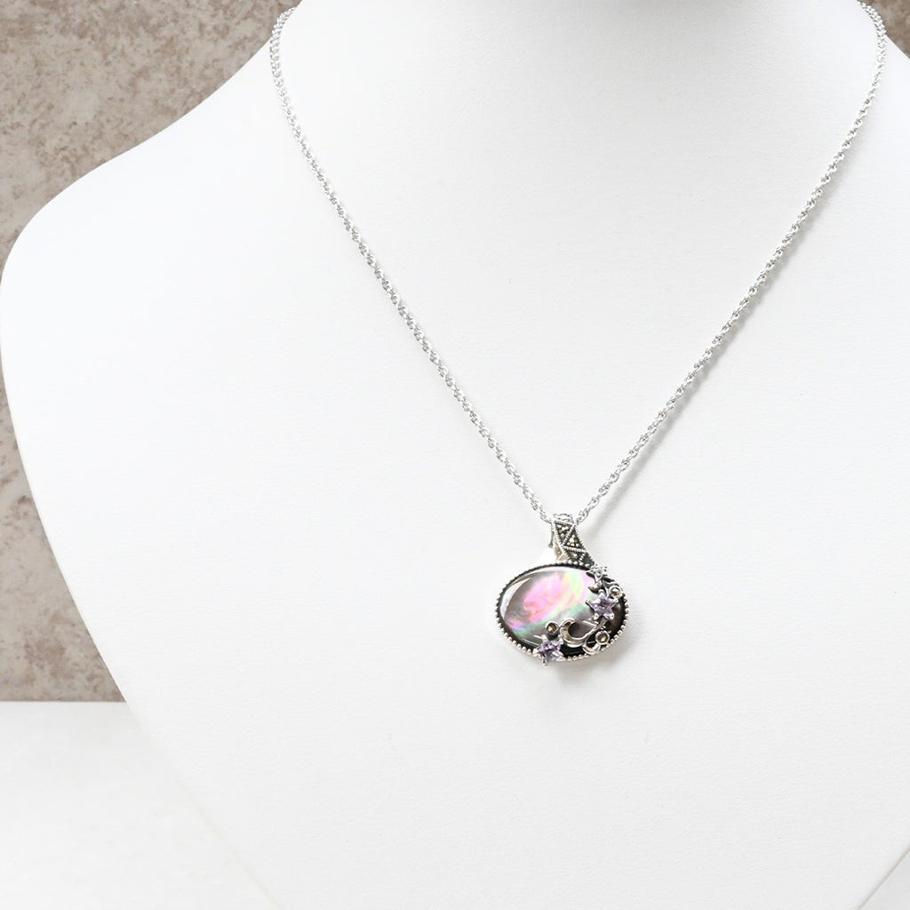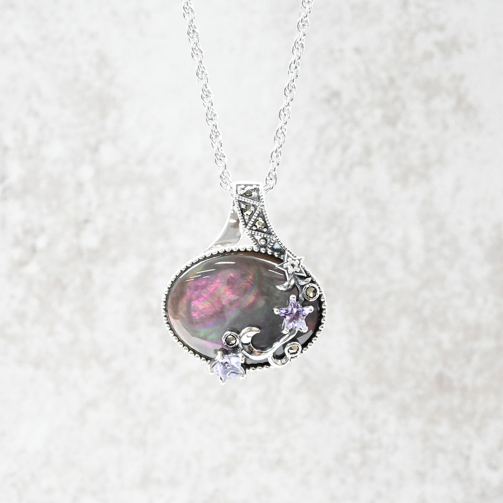■DETAIL〈素材〉シルバー925〈石〉黒蝶貝、アメシスト、ホワイトトパーズ、マルカジット〈モチーフサイズ〉最大縦約27mm×横約22mm(バチカン含む)※ブローチペンダント、ペンダントと表記がございますものは、真鍮サービスチェーンをお付けします。(リング、イヤリング、ピアス、K18、K10商品には付属しません。)■ご購入前にご確認ください※天然石を使用している為、色や形に多少の個体差があること、また、ブラウザによって実際の色味に若干差が出ますことをご了承ください。※撮影小物は付属いたしません。※商品の仕様変更、石変更は承っておりません。※ご注文後のお客様都合による返品・交換(サイズやイメージ違いなど)は承っておりません。不良品のみ返品を承ります。詳しくはこちら※着け心地や重さ等、その他ご不明な点はチャットにてお問い合わせくださいませ。