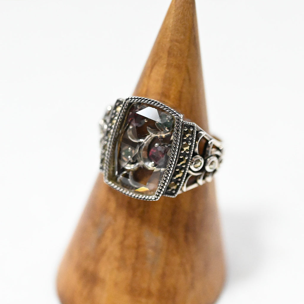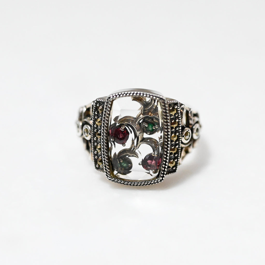 ■DETAIL〈素材〉シルバー925〈石〉クォーツ、エメラルド、マルカジット、ローズガーネット〈モチーフサイズ〉縦約16mm×横約20mm※ブローチペンダント、ペンダントと表記がございますものは、真鍮サービスチェーンをお付けします。(リング、イヤリング、ピアス、K18、K10商品には付属しません。)■ご購入前にご確認ください※天然石を使用している為、色や形に多少の個体差があること、また、ブラウザによって実際の色味に若干差が出ますことをご了承ください。※撮影小物は付属いたしません。※商品の仕様変更、石変更は承っておりません。※ご注文後のお客様都合による返品・交換(サイズやイメージ違いなど)は承っておりません。不良品のみ返品を承ります。詳しくはこちら※着け心地や重さ等、その他ご不明な点はチャットにてお問い合わせくださいませ。