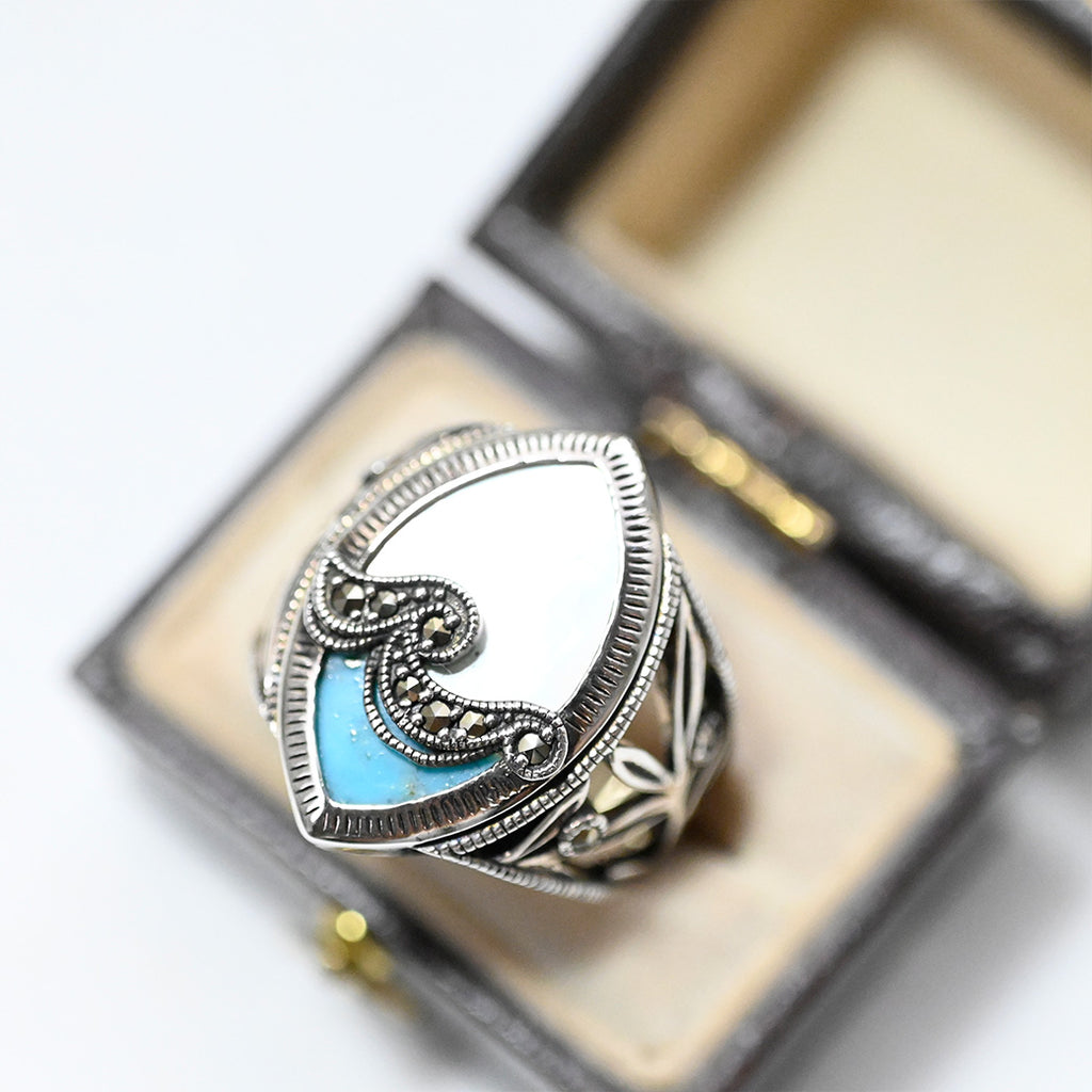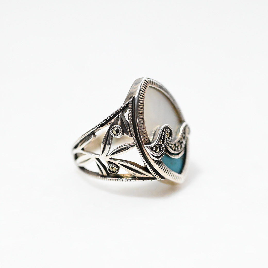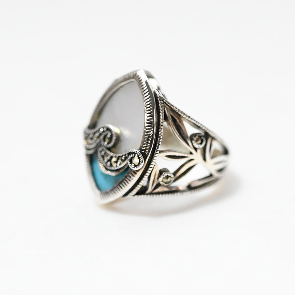■DETAIL〈素材〉シルバー925〈石〉白蝶貝、トルコ石(ターコイズ)マルカジット〈モチーフサイズ〉最大縦約17mm×横約22mm※ブローチペンダント、ペンダントと表記がございますものは、真鍮サービスチェーンをお付けします。(リング、イヤリング、ピアス、K18、K10商品には付属しません。)■ご購入前にご確認ください※天然石を使用している為、色や形に多少の個体差があること、また、ブラウザによって実際の色味に若干差が出ますことをご了承ください。※撮影小物は付属いたしません。※商品の仕様変更、石変更は承っておりません。※ご注文後のお客様都合による返品・交換(サイズやイメージ違いなど)は承っておりません。不良品のみ返品を承ります。詳しくはこちら※着け心地や重さ等、その他ご不明な点はチャットにてお問い合わせくださいませ。