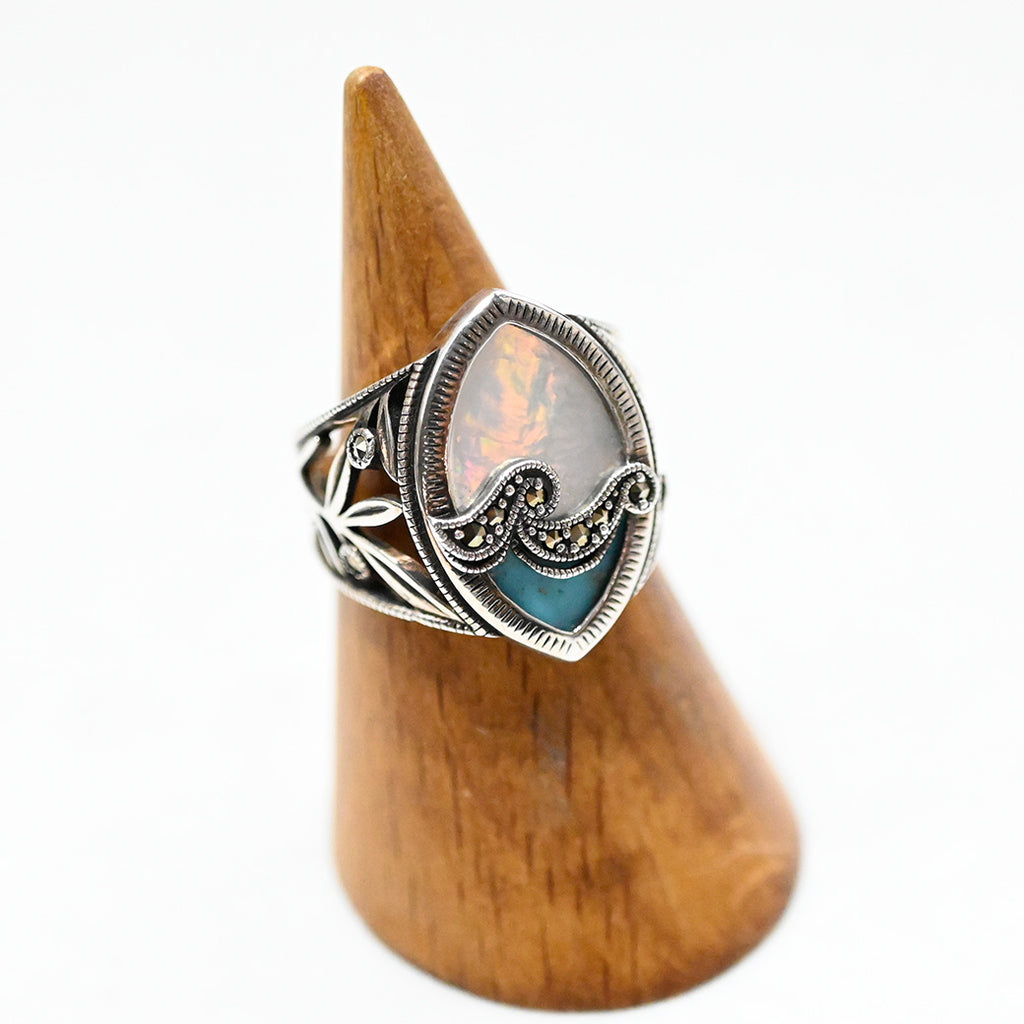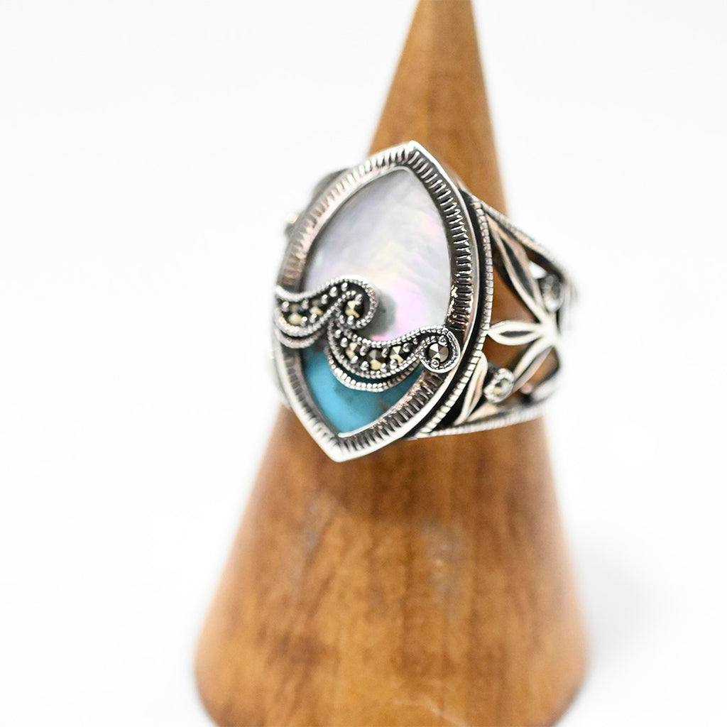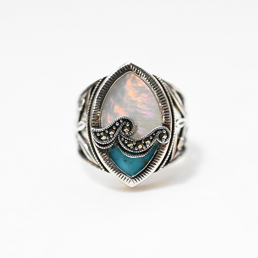 ■DETAIL〈素材〉シルバー925〈石〉白蝶貝、トルコ石(ターコイズ)マルカジット〈モチーフサイズ〉最大縦約17mm×横約22mm※ブローチペンダント、ペンダントと表記がございますものは、真鍮サービスチェーンをお付けします。(リング、イヤリング、ピアス、K18、K10商品には付属しません。)■ご購入前にご確認ください※天然石を使用している為、色や形に多少の個体差があること、また、ブラウザによって実際の色味に若干差が出ますことをご了承ください。※撮影小物は付属いたしません。※商品の仕様変更、石変更は承っておりません。※ご注文後のお客様都合による返品・交換(サイズやイメージ違いなど)は承っておりません。不良品のみ返品を承ります。詳しくはこちら※着け心地や重さ等、その他ご不明な点はチャットにてお問い合わせくださいませ。
