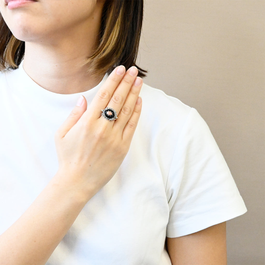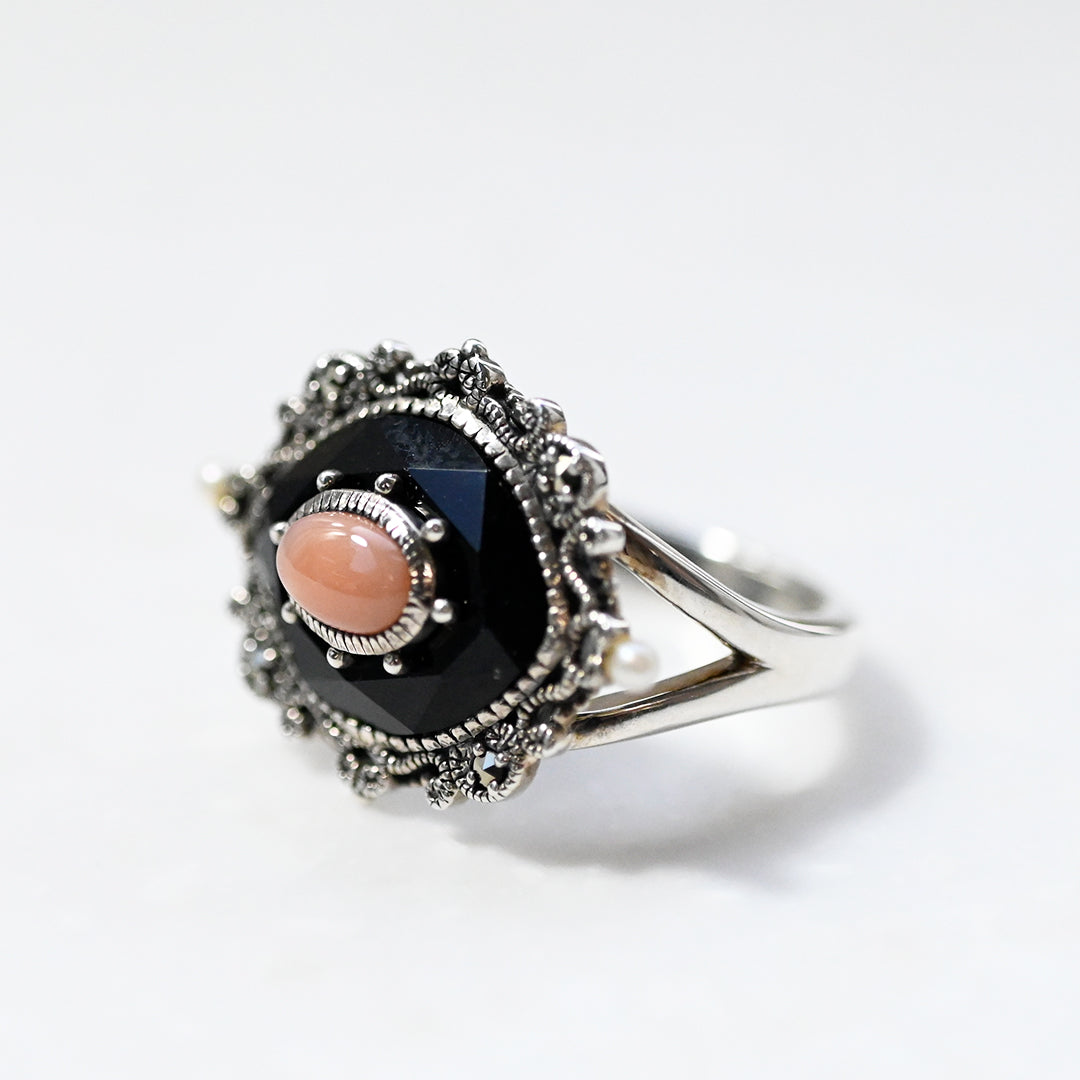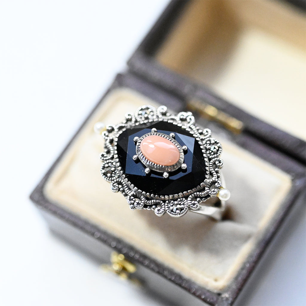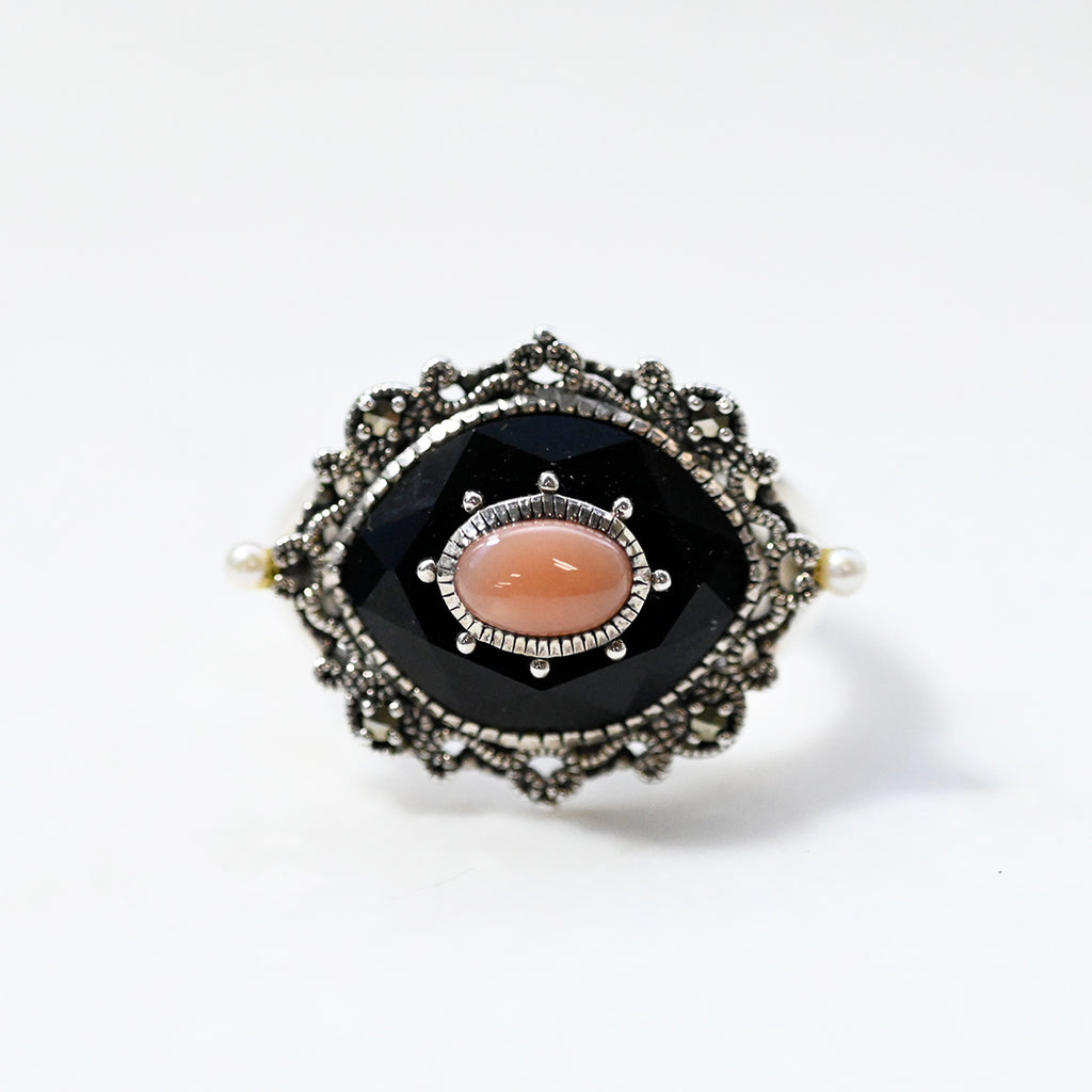 ■DETAIL〈素材〉シルバー925〈石〉オニキス、サンゴ、シードパール、マルカジット〈モチーフサイズ〉最大縦約17mm×最大横約22mm※ブローチペンダント、ペンダントと表記がございますものは、真鍮サービスチェーンをお付けします。(リング、イヤリング、ピアス、K18、K10商品には付属しません。)■ご購入前にご確認ください※天然石を使用している為、色や形に多少の個体差があること、また、ブラウザによって実際の色味に若干差が出ますことをご了承ください。※撮影小物は付属いたしません。※商品の仕様変更、石変更は承っておりません。※ご注文後のお客様都合による返品・交換(サイズやイメージ違いなど)は承っておりません。不良品のみ返品を承ります。詳しくはこちら※着け心地や重さ等、その他ご不明な点はチャットにてお問い合わせくださいませ。