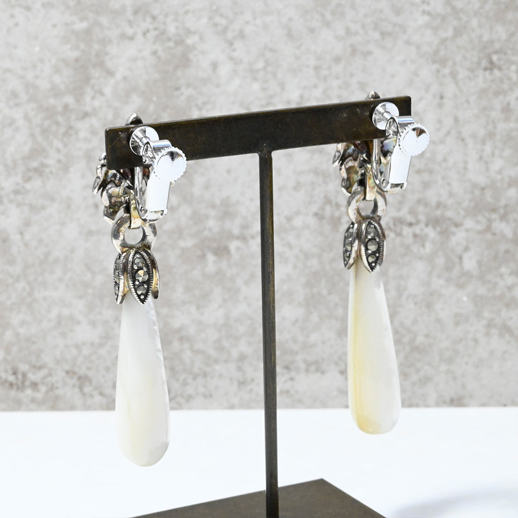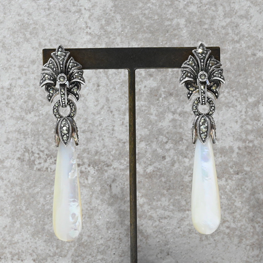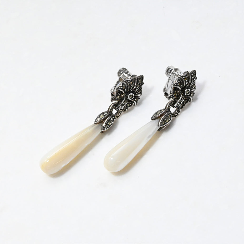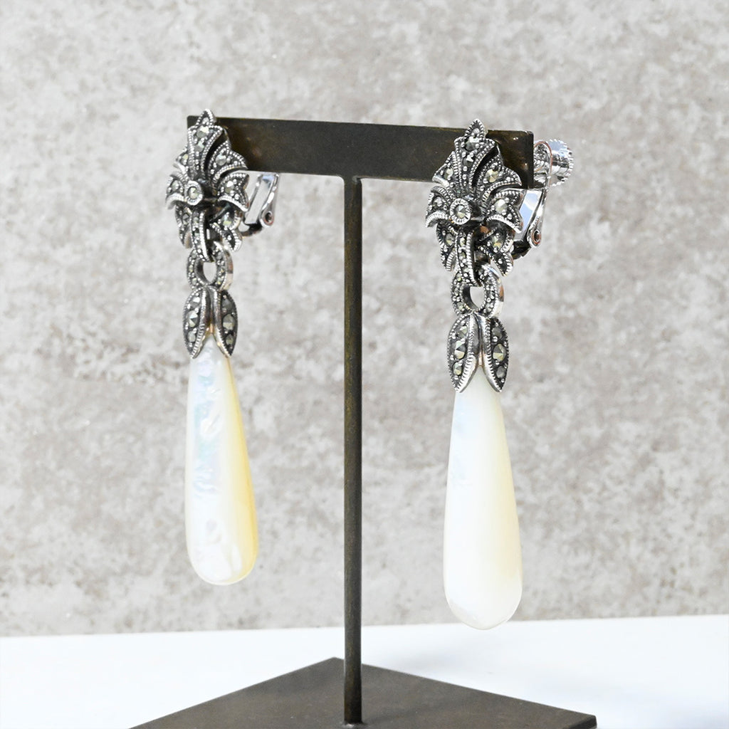 ■DETAIL〈素材〉シルバー925〈石〉白蝶貝(マザーオブパール)、マルカジット〈モチーフサイズ〉最大縦約55mm×横約13mm(イヤリング金具部分含む)※ブローチペンダント、ペンダントと表記がございますものは、真鍮サービスチェーンをお付けします。(リング、イヤリング、ピアス、K18、K10商品には付属しません。)■ご購入前にご確認ください※天然石を使用している為、色や形に多少の個体差があること、また、ブラウザによって実際の色味に若干差が出ますことをご了承ください。※撮影小物は付属いたしません。※商品の仕様変更、石変更は承っておりません。※ご注文後のお客様都合による返品・交換(サイズやイメージ違いなど)は承っておりません。不良品のみ返品を承ります。詳しくはこちら※着け心地や重さ等、その他ご不明な点はチャットにてお問い合わせくださいませ。