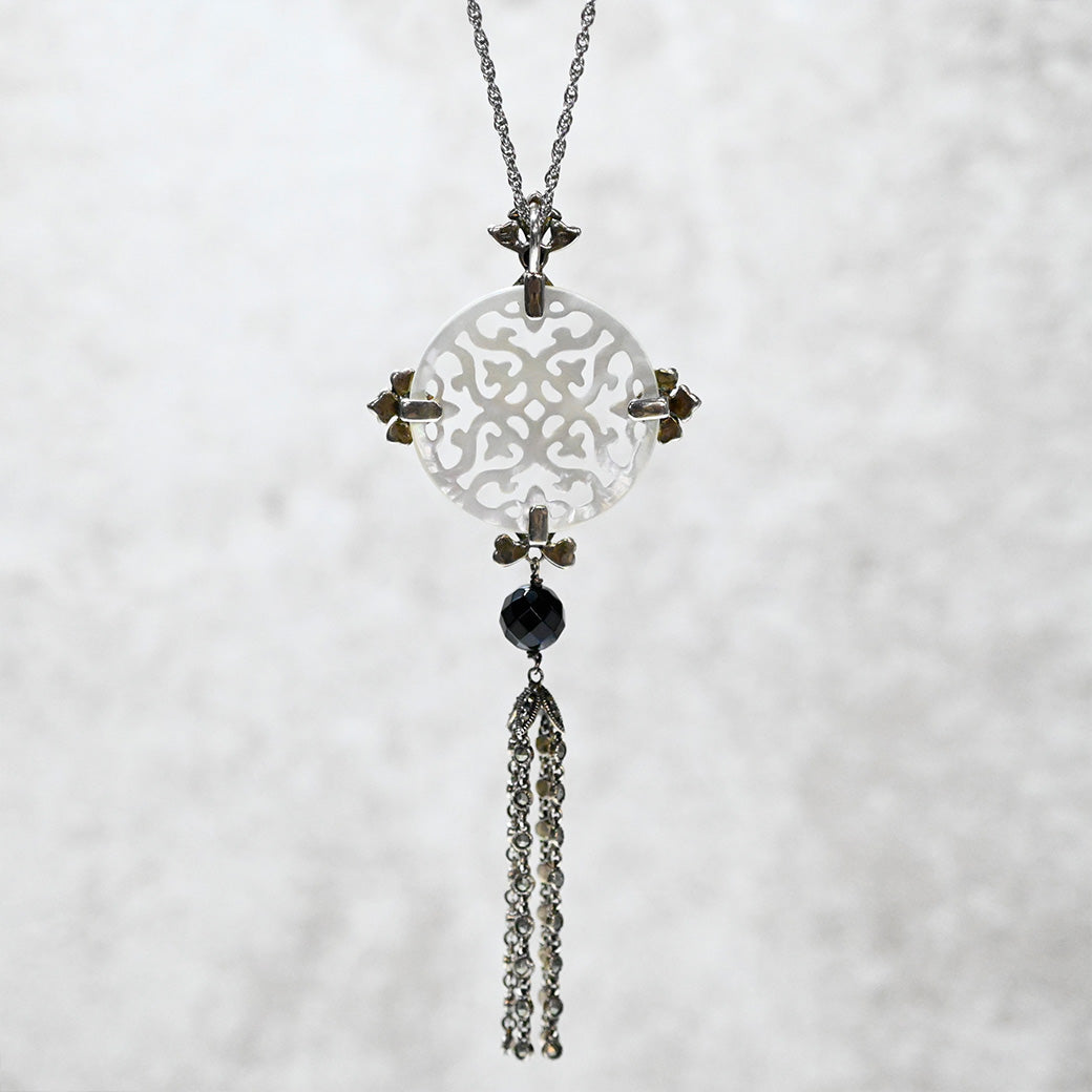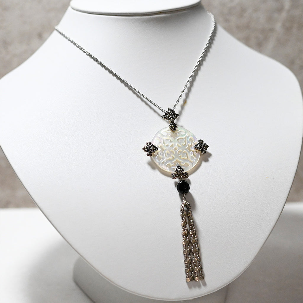 ■DETAIL〈素材〉シルバー925〈石〉オニキス、白蝶貝、マルカジット〈モチーフサイズ〉縦約105mm×横約41mm■ご購入前にご確認ください※天然石を使用している為、色や形に多少の個体差があること、また、ブラウザによって実際の色味に若干差が出ますことをご了承ください。※撮影小物は付属いたしません。※商品の仕様変更、石変更は承っておりません。※ご注文後のお客様都合による返品・交換(サイズやイメージ違いなど)は承っておりません。不良品のみ返品を承ります。詳しくはこちら※着け心地や重さ等、その他ご不明な点はチャットにてお問い合わせくださいませ。