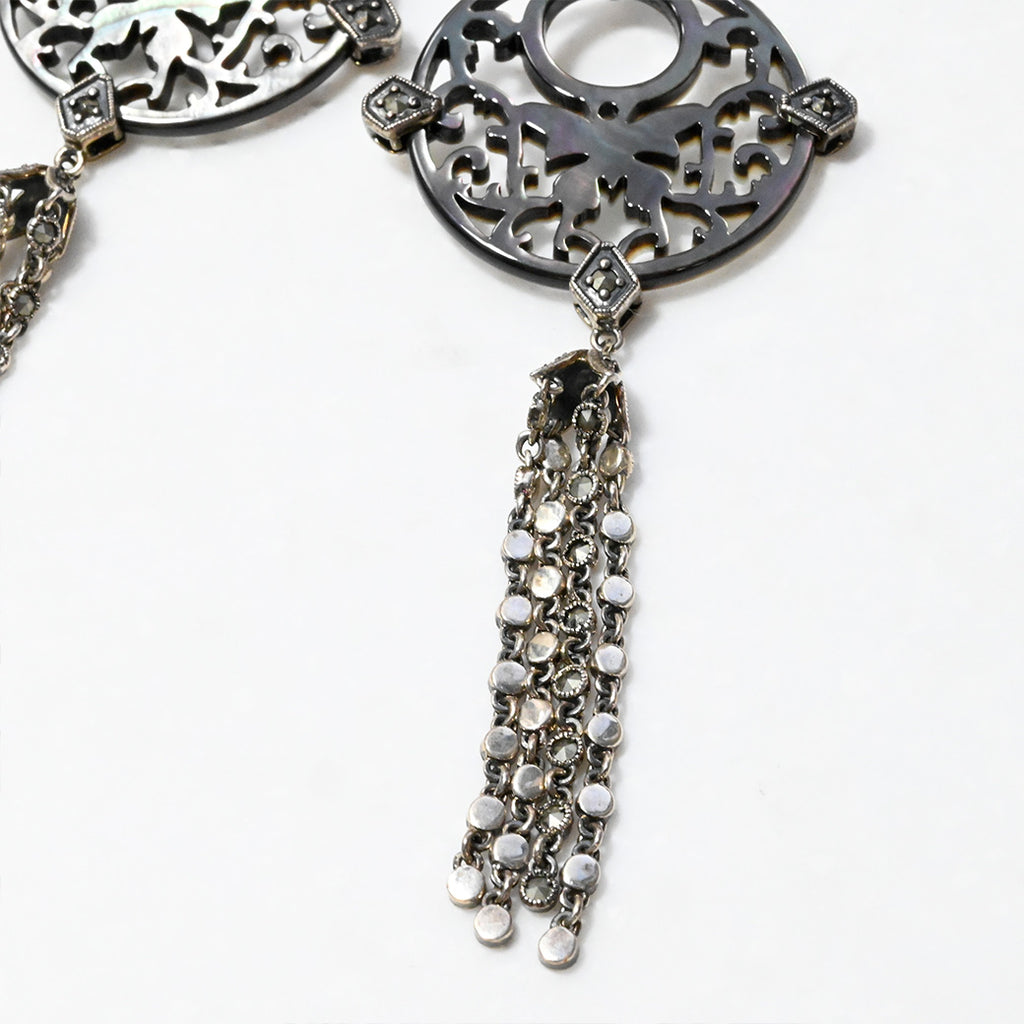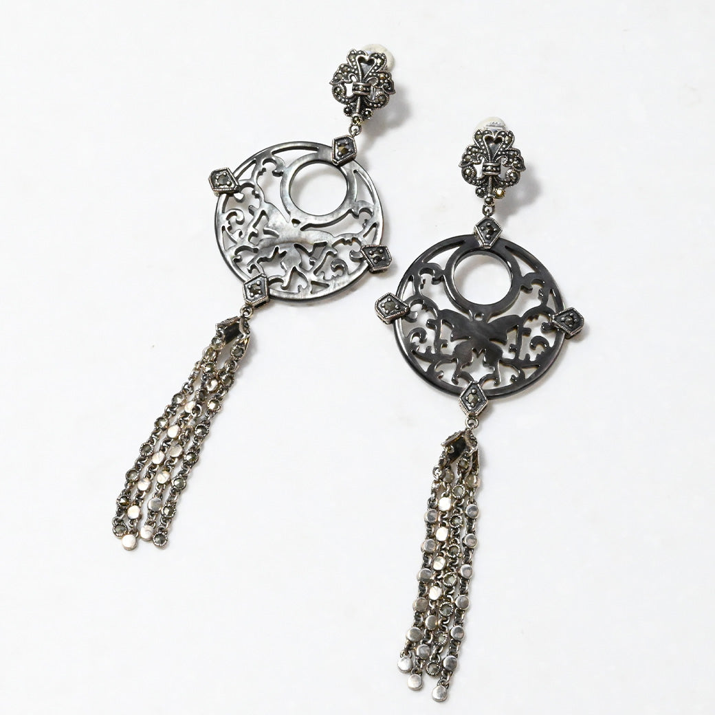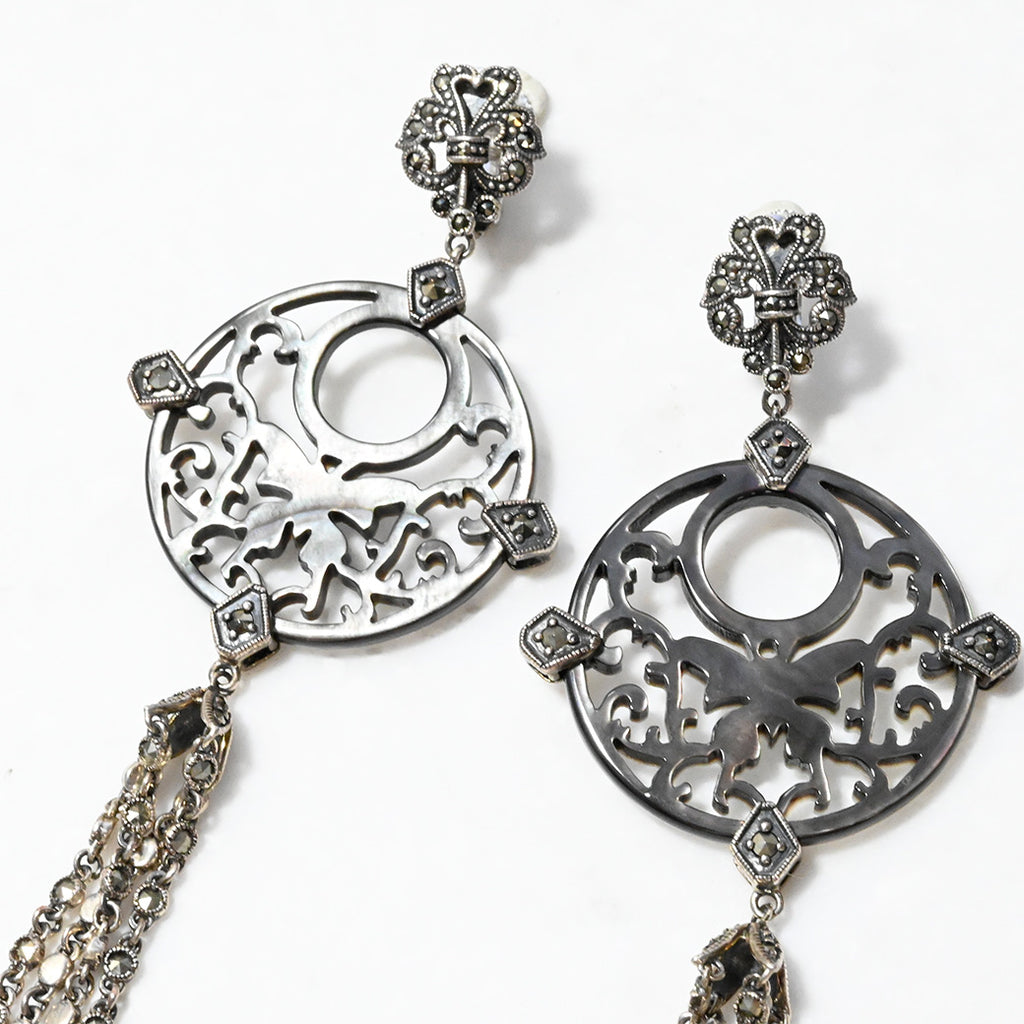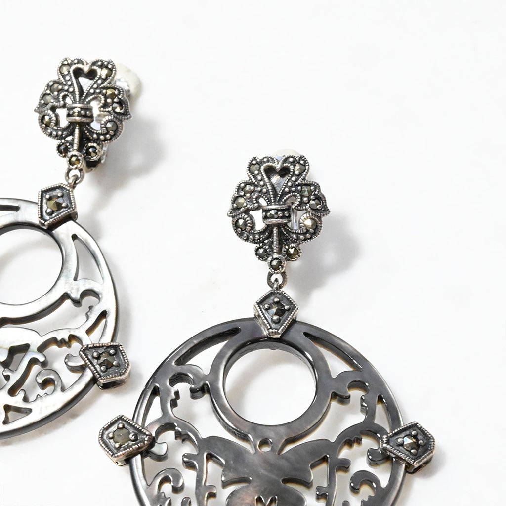 ■DETAIL〈素材〉シルバー925〈石〉ブラックマザーオブパール、マルカジット〈モチーフサイズ〉最大縦約100mm×横約36mm〈イヤリングタイプ〉バネ式※ブローチペンダント、ペンダントと表記がございますものは、真鍮サービスチェーンをお付けします。(リング、イヤリング、ピアス、K18、K10商品には付属しません。)■ご購入前にご確認ください※天然石を使用している為、色や形に多少の個体差があること、また、ブラウザによって実際の色味に若干差が出ますことをご了承ください。※撮影小物は付属いたしません。※商品の仕様変更、石変更は承っておりません。※ご注文後のお客様都合による返品・交換(サイズやイメージ違いなど)は承っておりません。不良品のみ返品を承ります。詳しくはこちら※着け心地や重さ等、その他ご不明な点はチャットにてお問い合わせくださいませ。