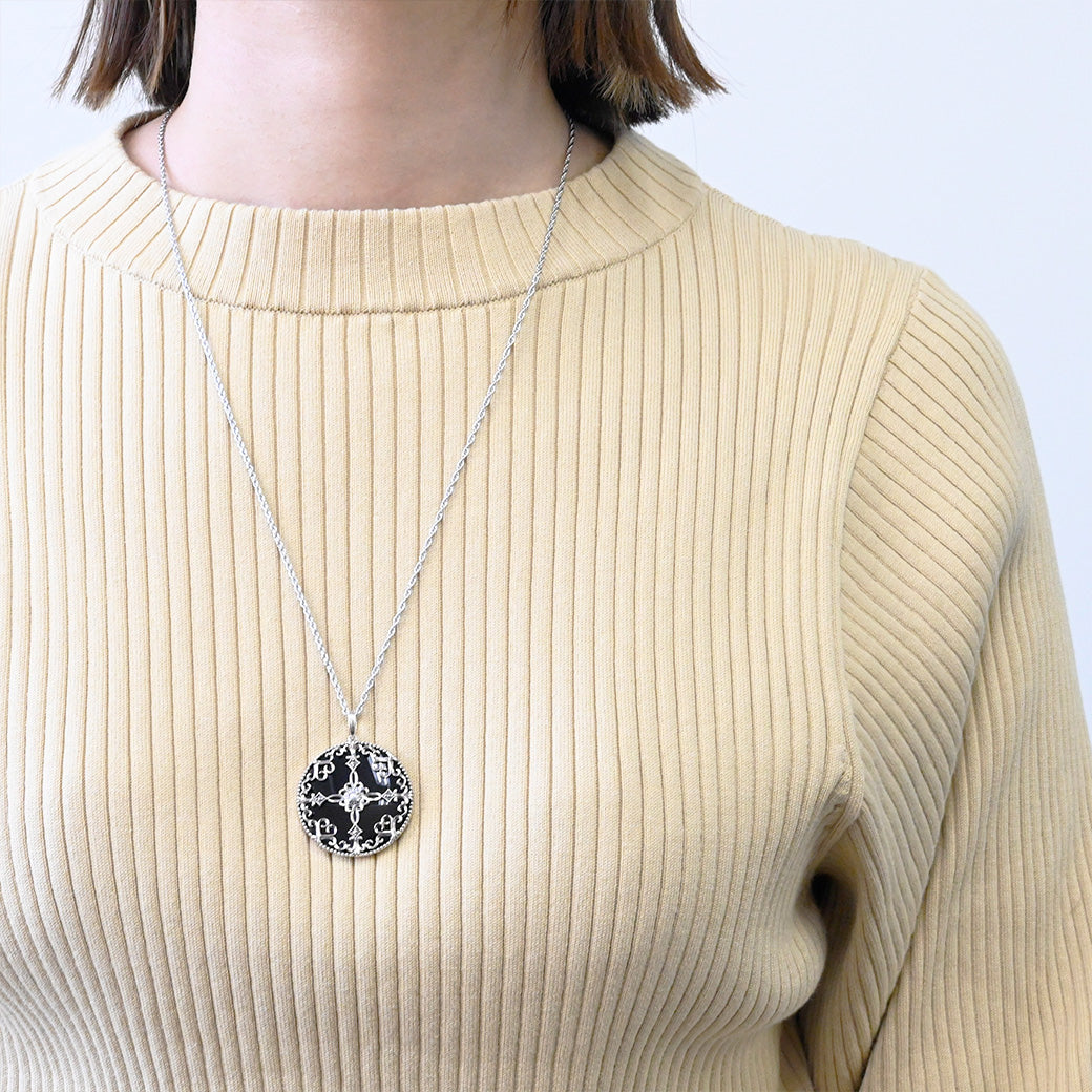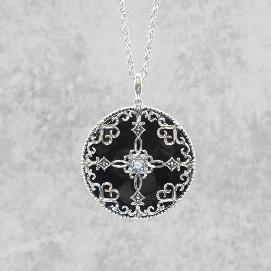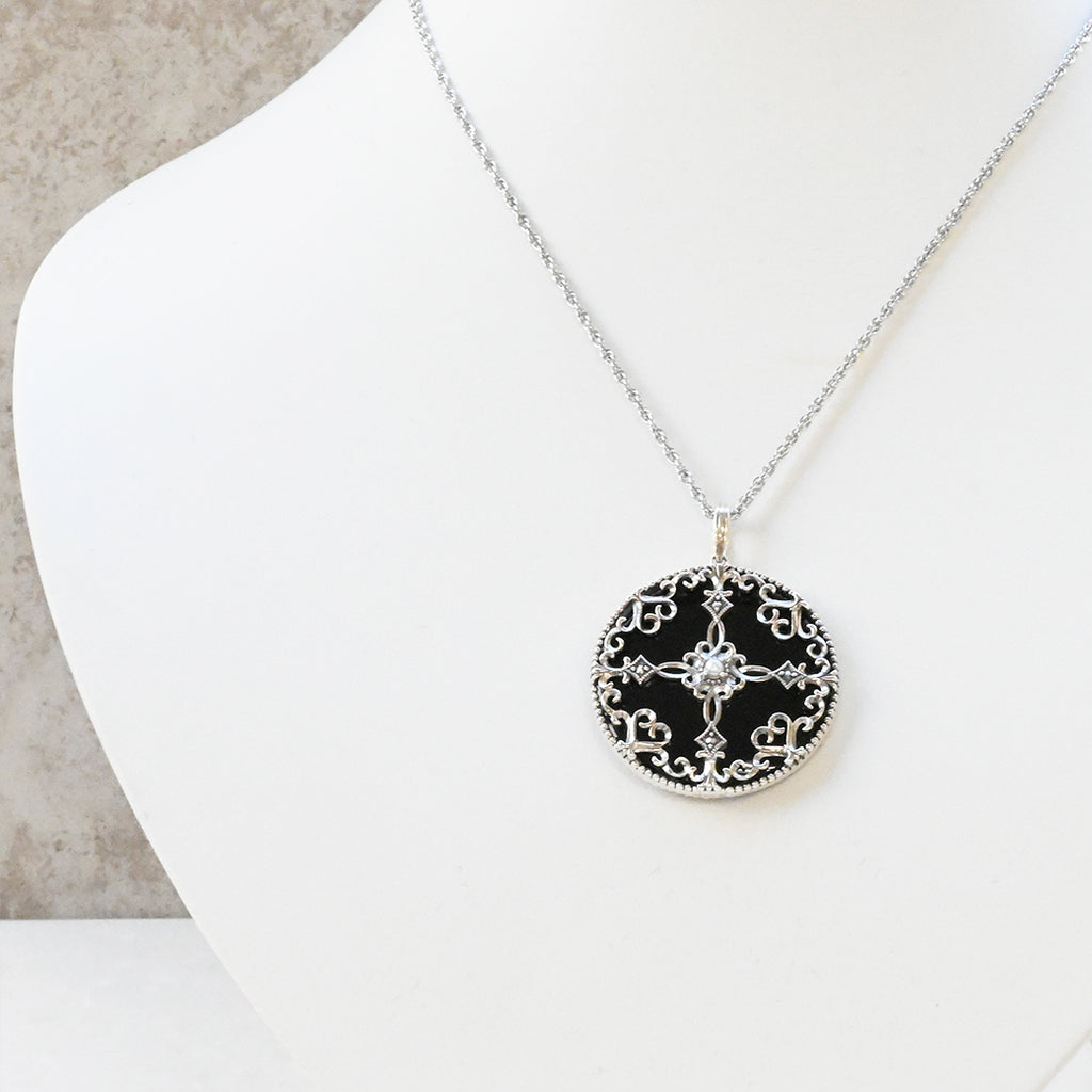 漆黒のオニキスを背景に、精緻なシルバーの透かし模様がクロスを描く、存在感あふれるラウンドペンダント。