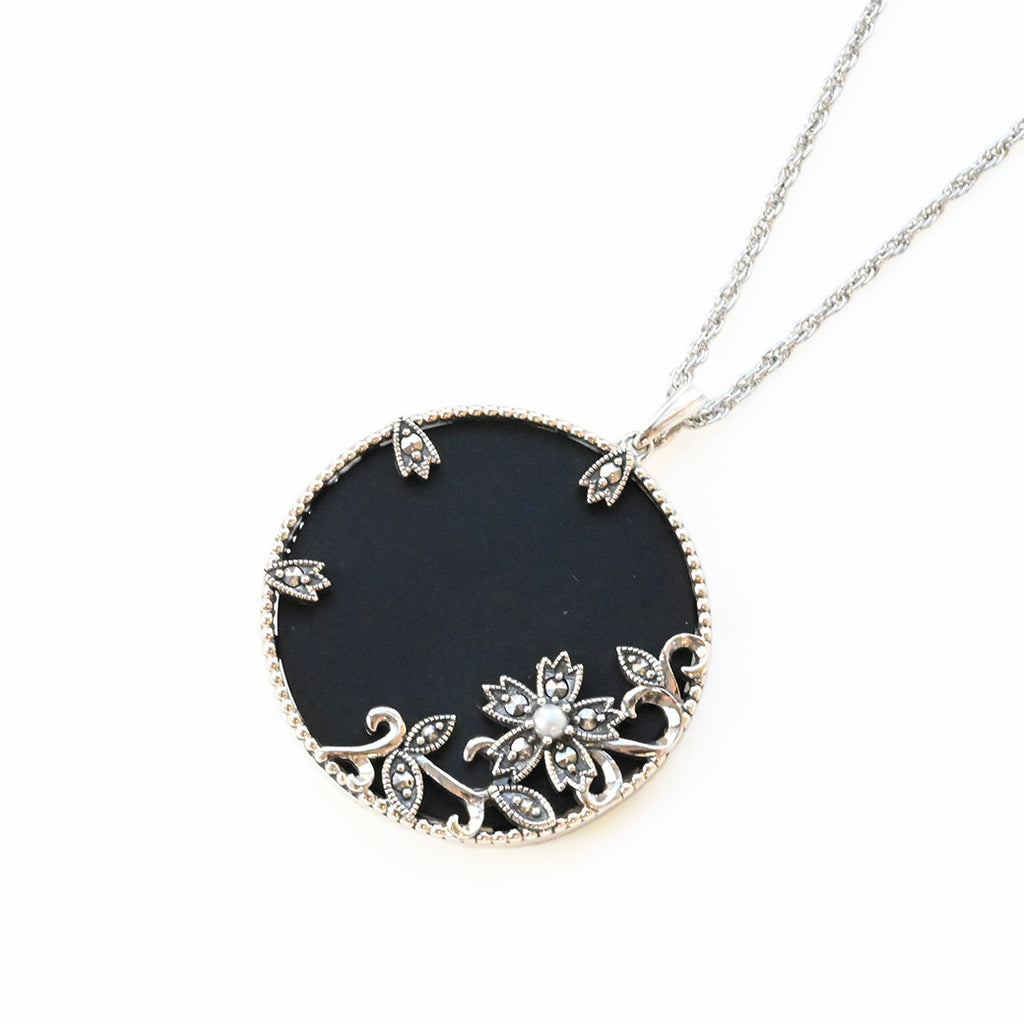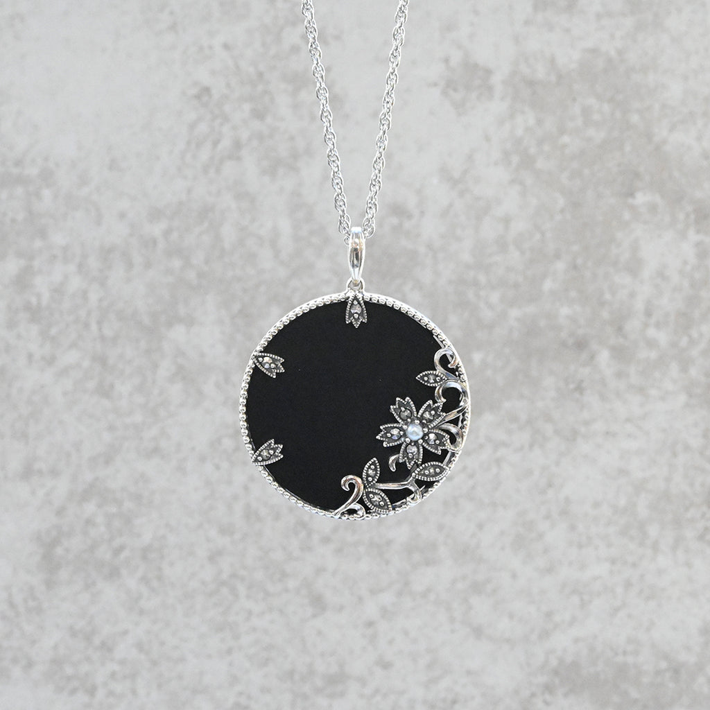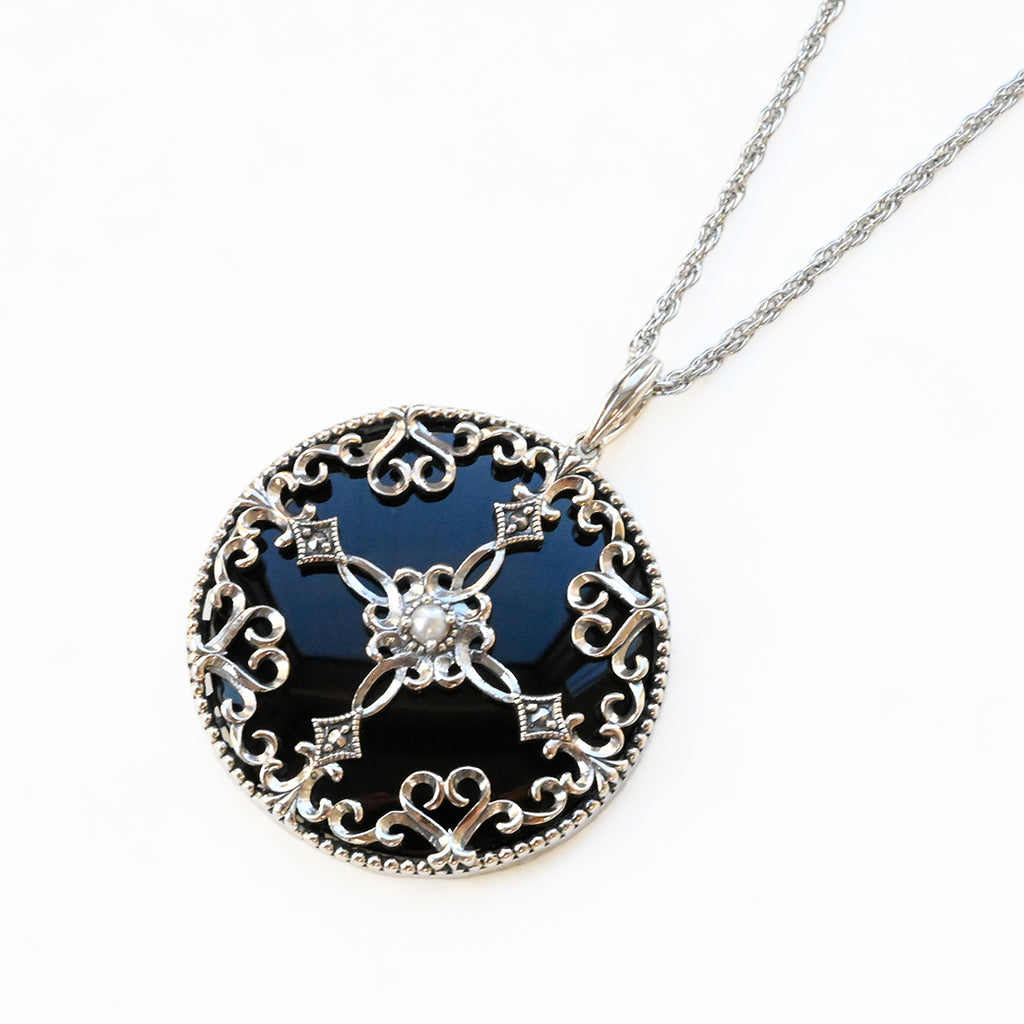 漆黒のオニキスを背景に、精緻なシルバーの透かし模様がクロスを描く、存在感あふれるラウンドペンダント。