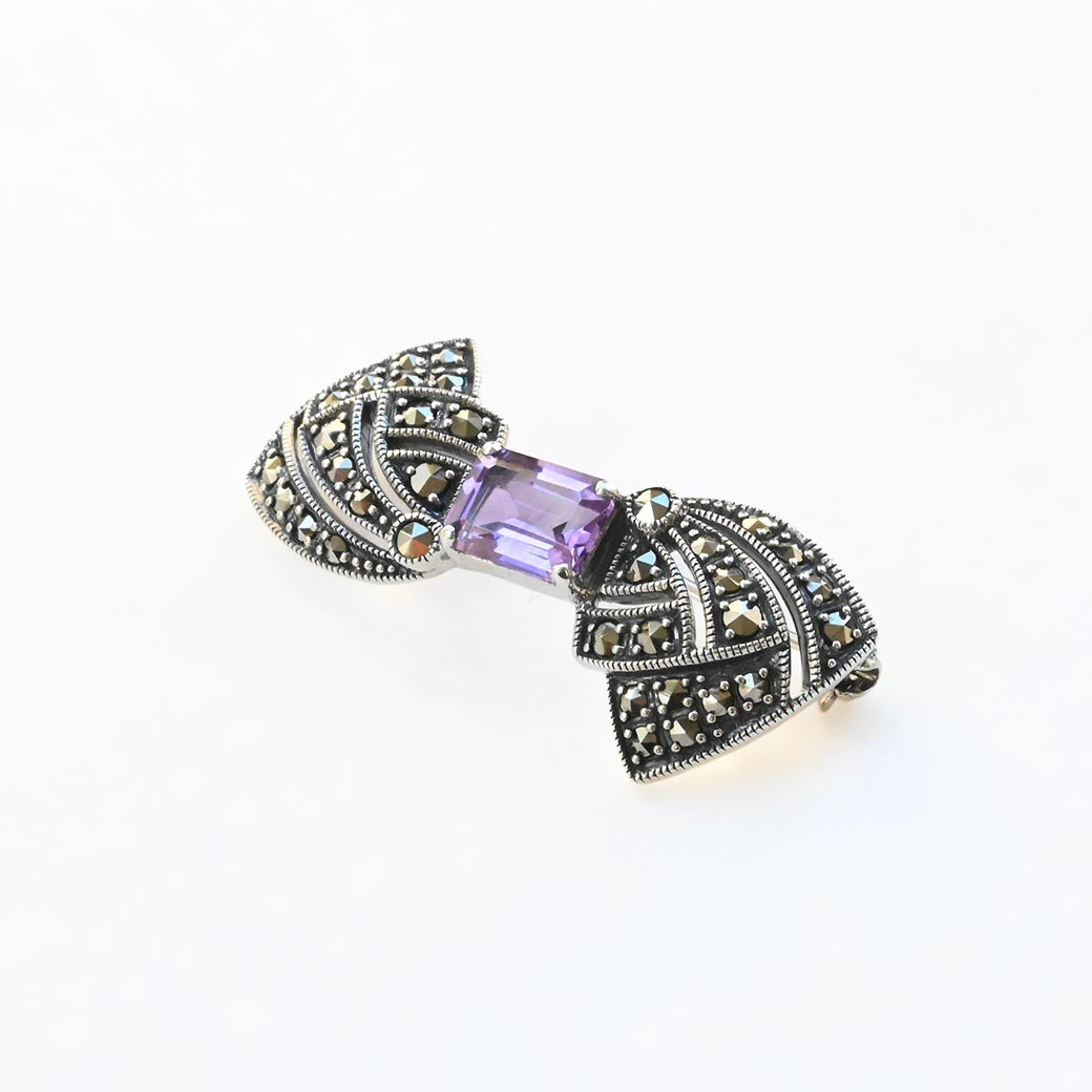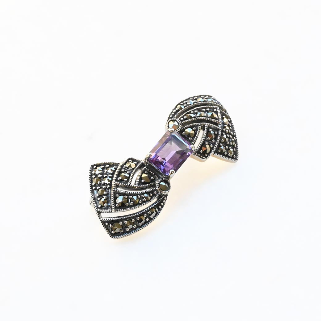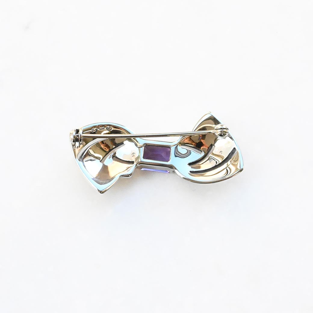 洗練されたシルエットに、静かに華やぐ美しさ。中心のアメジストがアクセントとなった、リボンモチーフのシルバーブローチです。