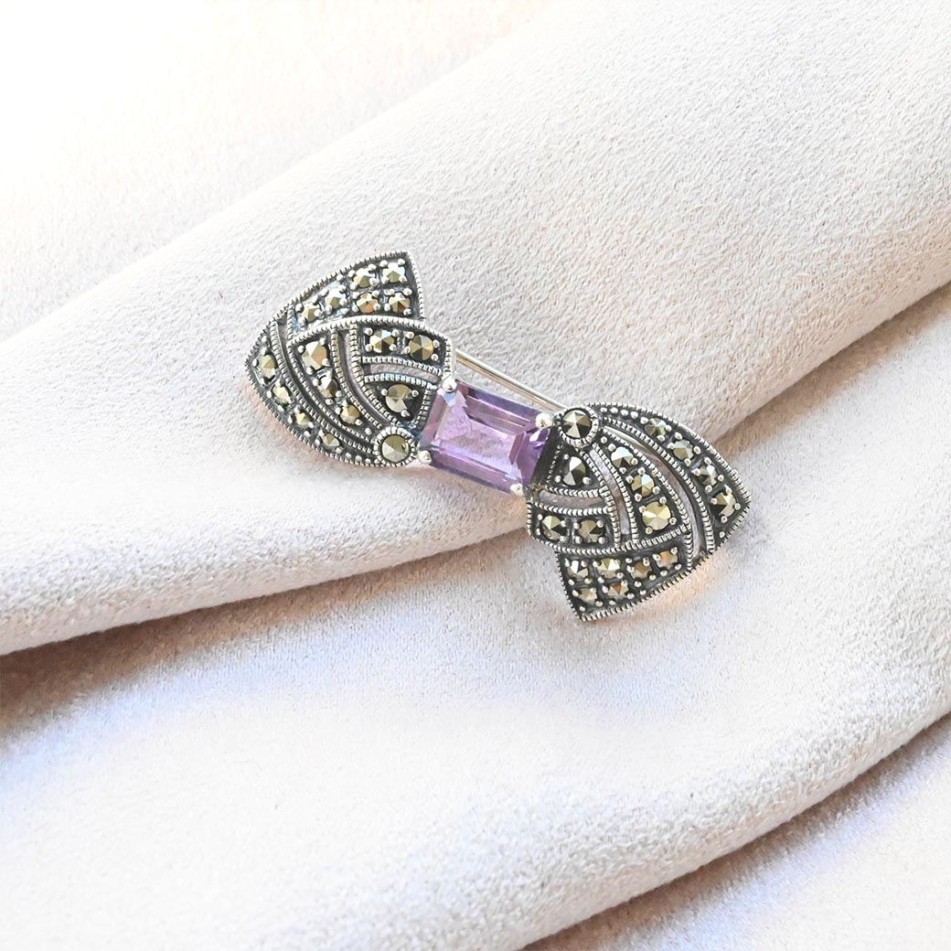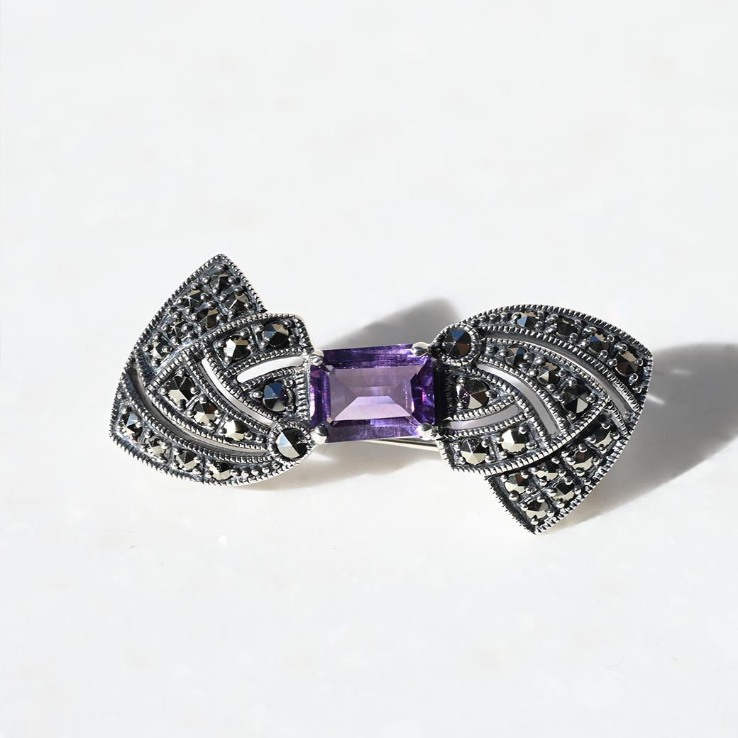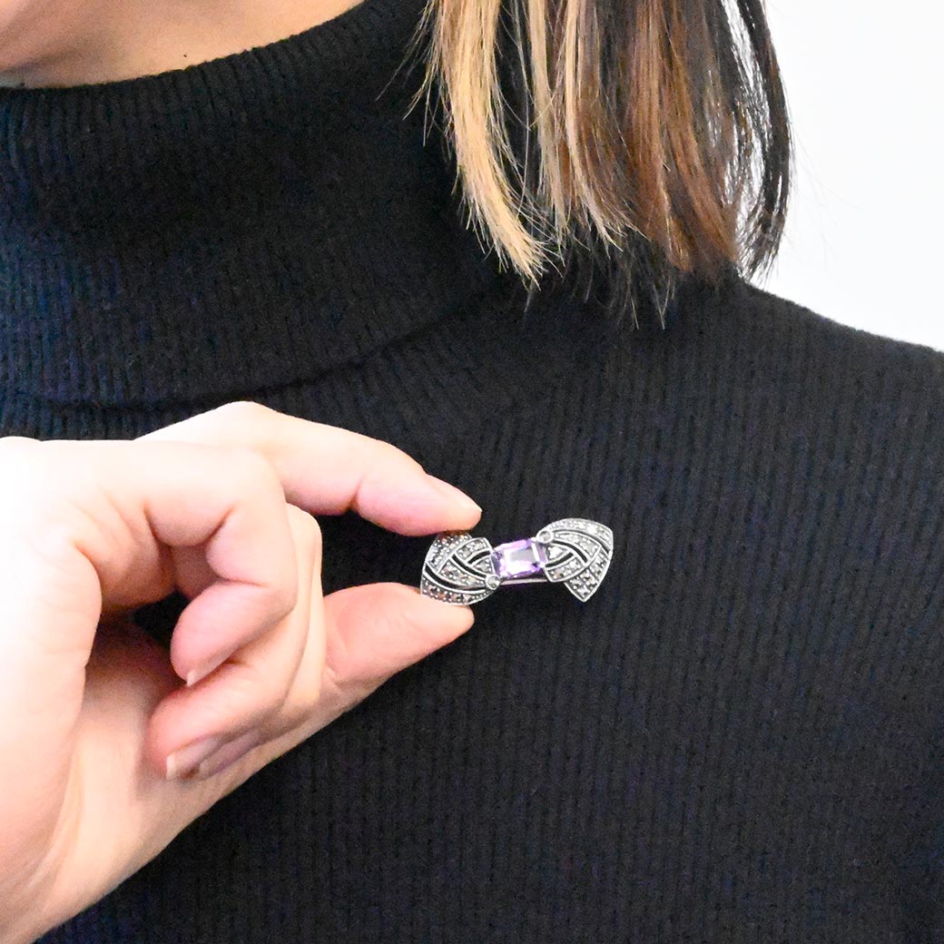 洗練されたシルエットに、静かに華やぐ美しさ。中心のアメジストがアクセントとなった、リボンモチーフのシルバーブローチです。