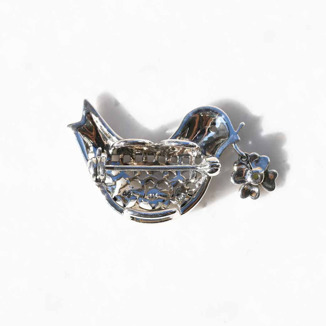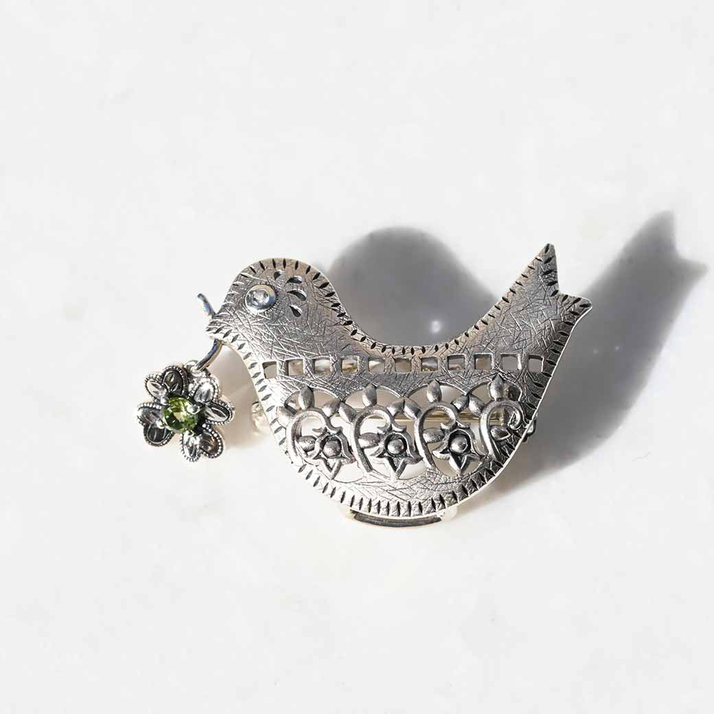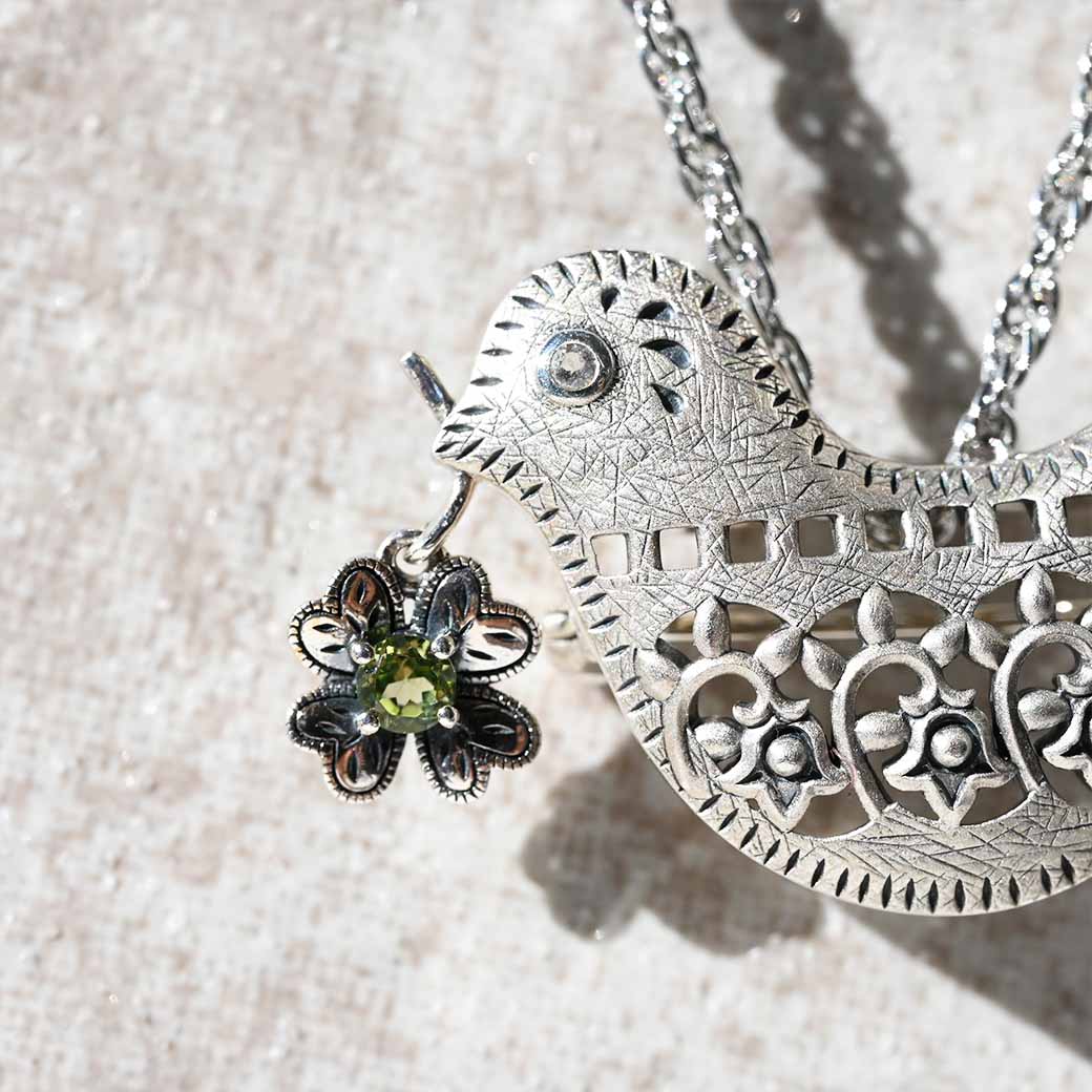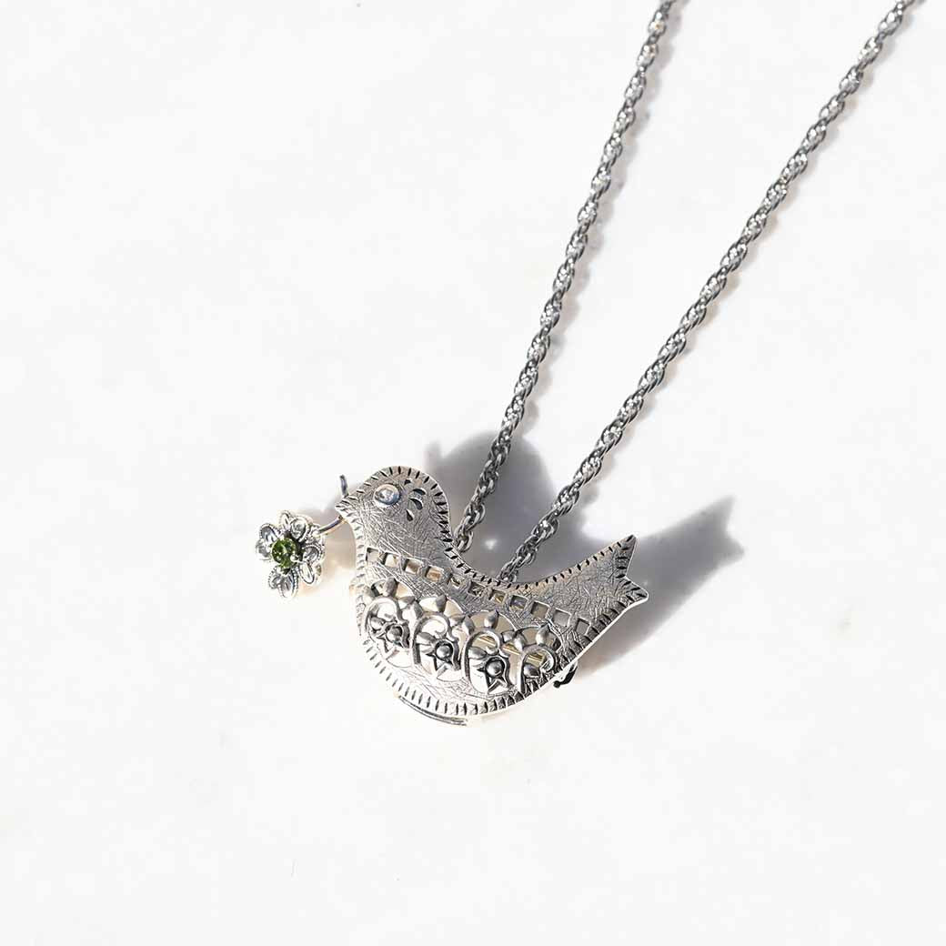 平和と幸福を象徴する鳩をモチーフにした、心温まるシルバーブローチペンダントです。くちばしに咥えた四つ葉のクローバーを思わせるペリドットが優しく揺れ、動くたびに爽やかなグリーンが輝いて幸運を運んでくれるようなデザインです。