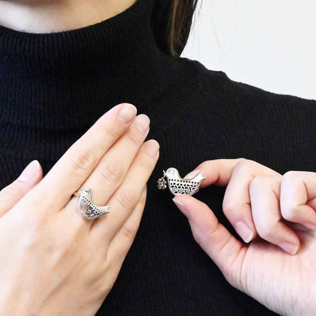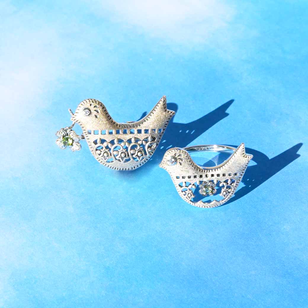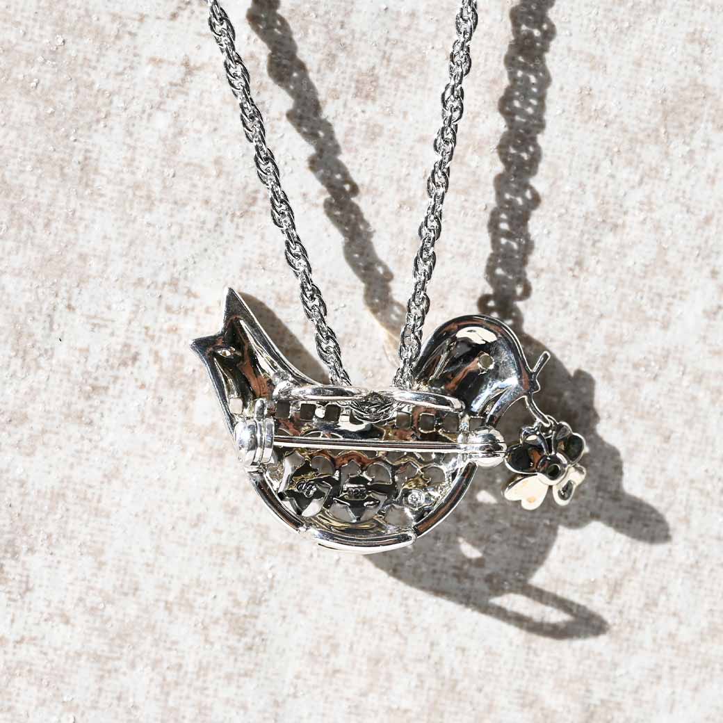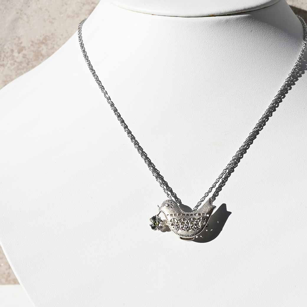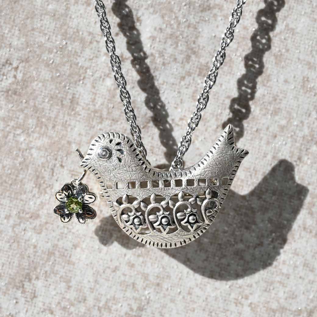 平和と幸福を象徴する鳩をモチーフにした、心温まるシルバーブローチペンダントです。くちばしに咥えた四つ葉のクローバーを思わせるペリドットが優しく揺れ、動くたびに爽やかなグリーンが輝いて幸運を運んでくれるようなデザインです。