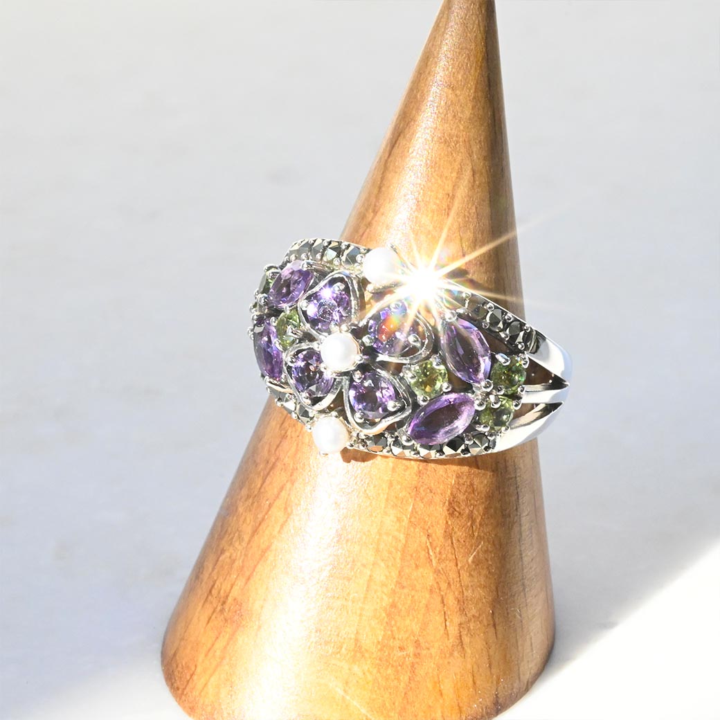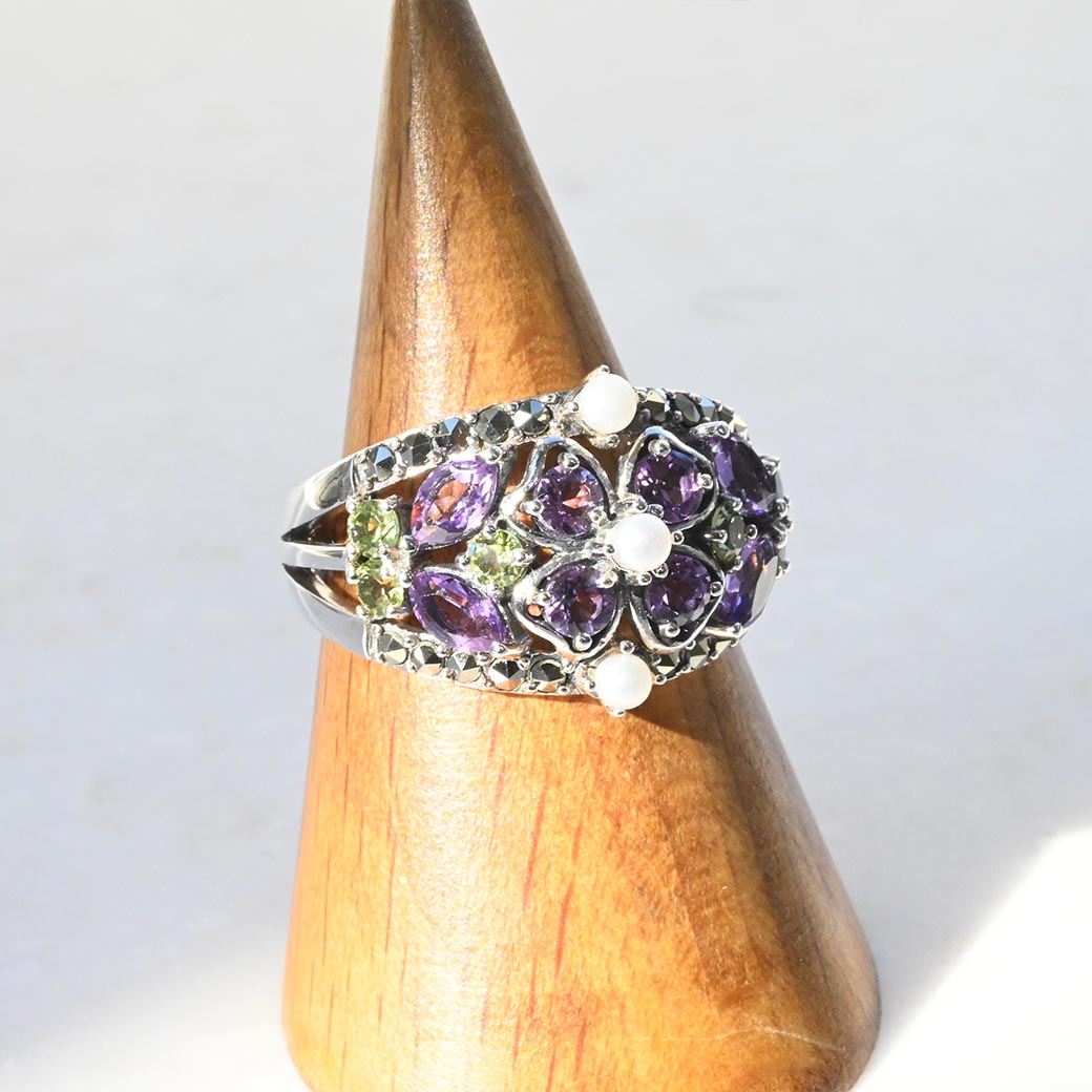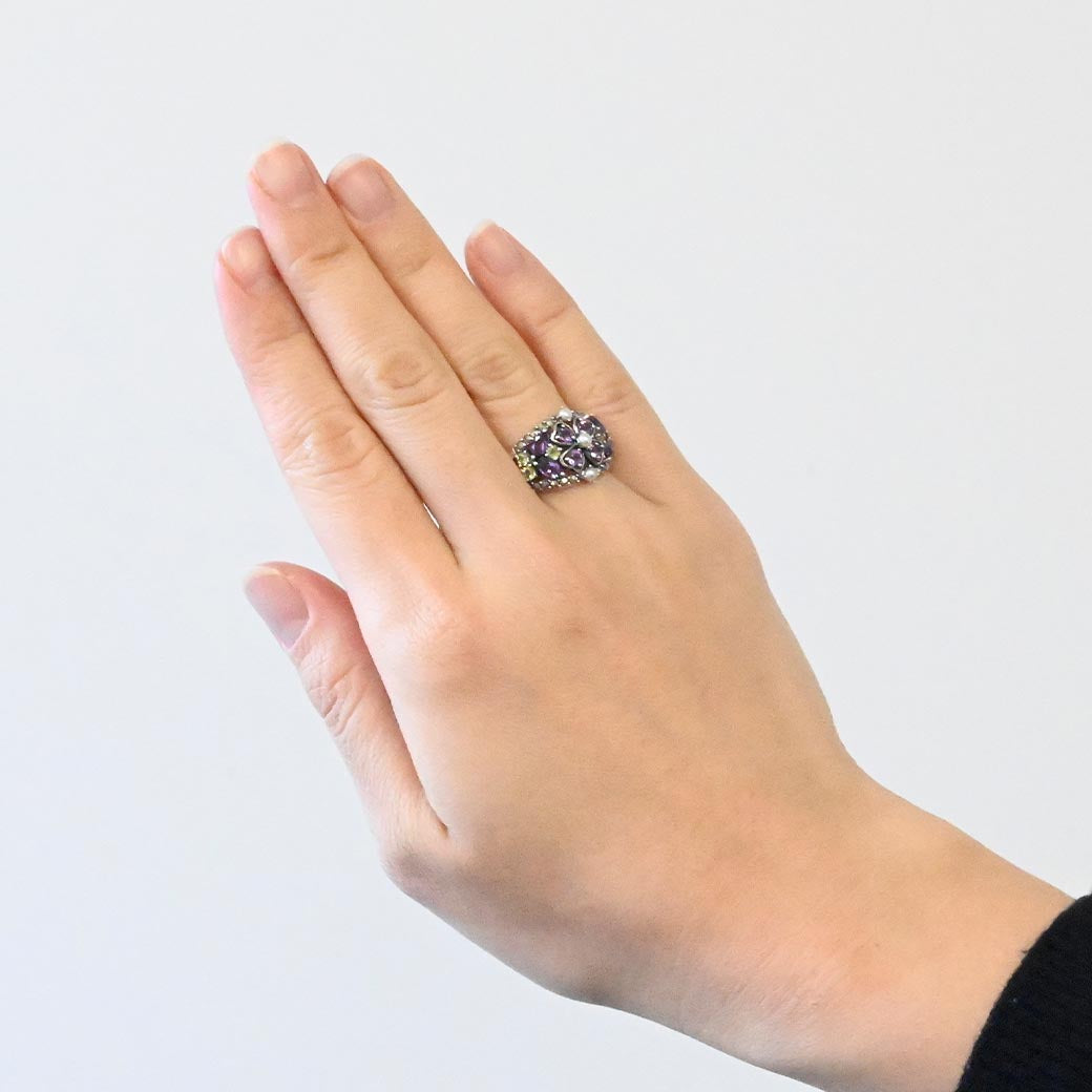 まるで花束がそのままリングになったような、色彩と造形のハーモニーが美しいデザイン。アメジストが、中央に向かって花びらのように配置され、周囲には清らかなパールと爽やかなペリドットがリズムを添えています。
