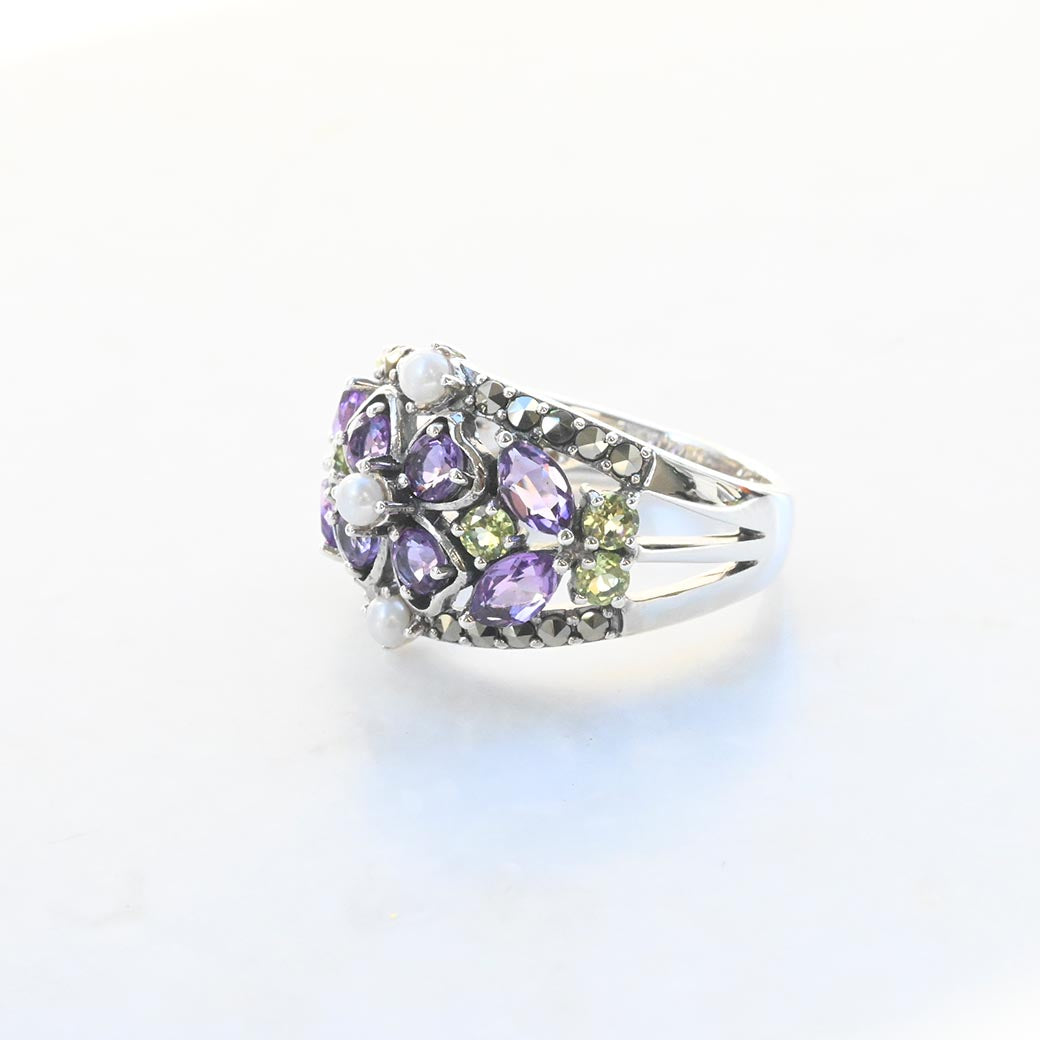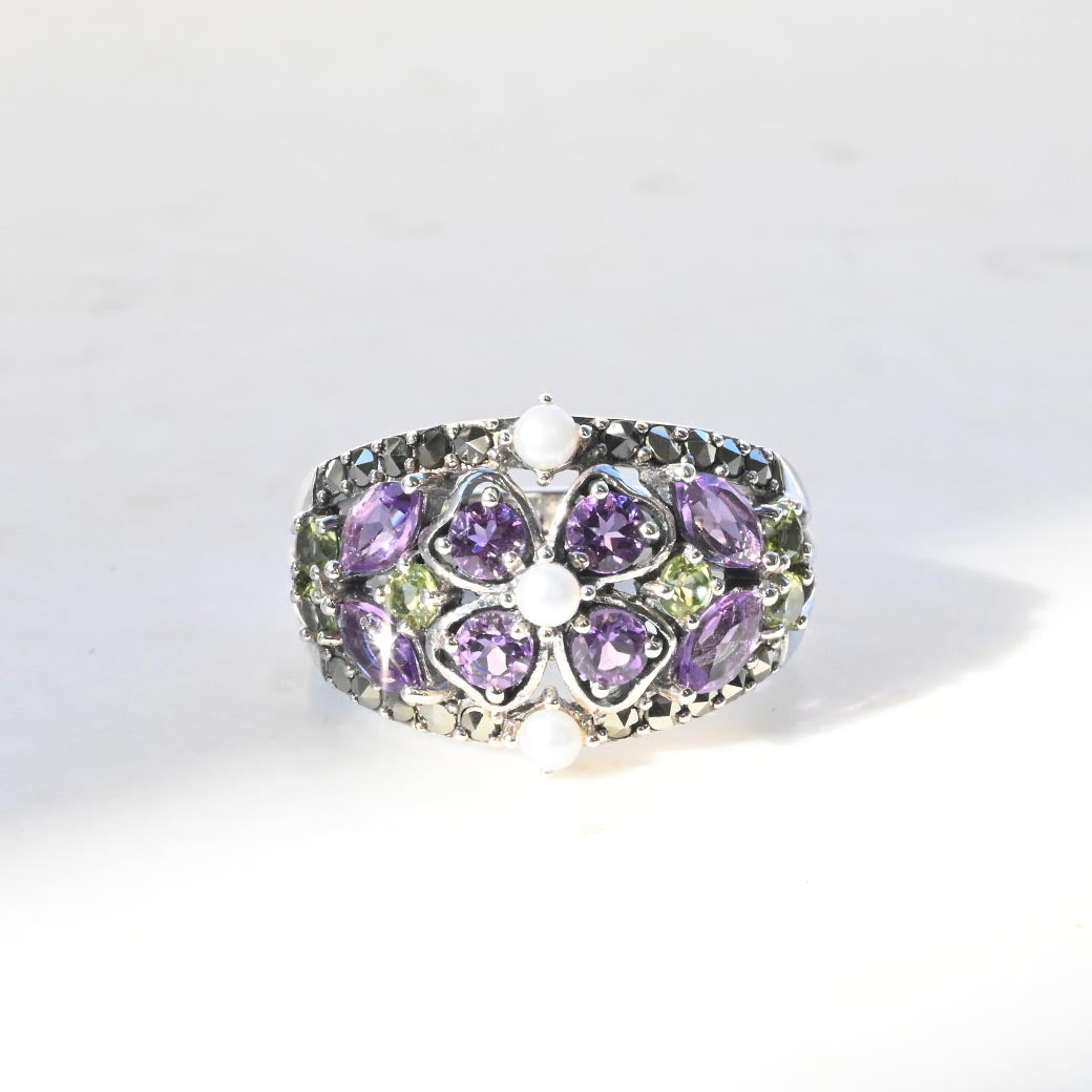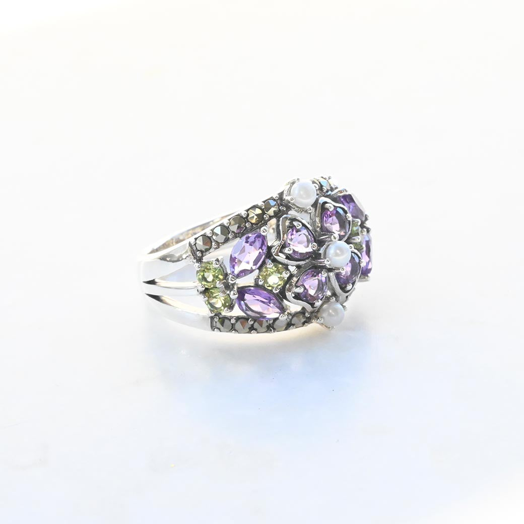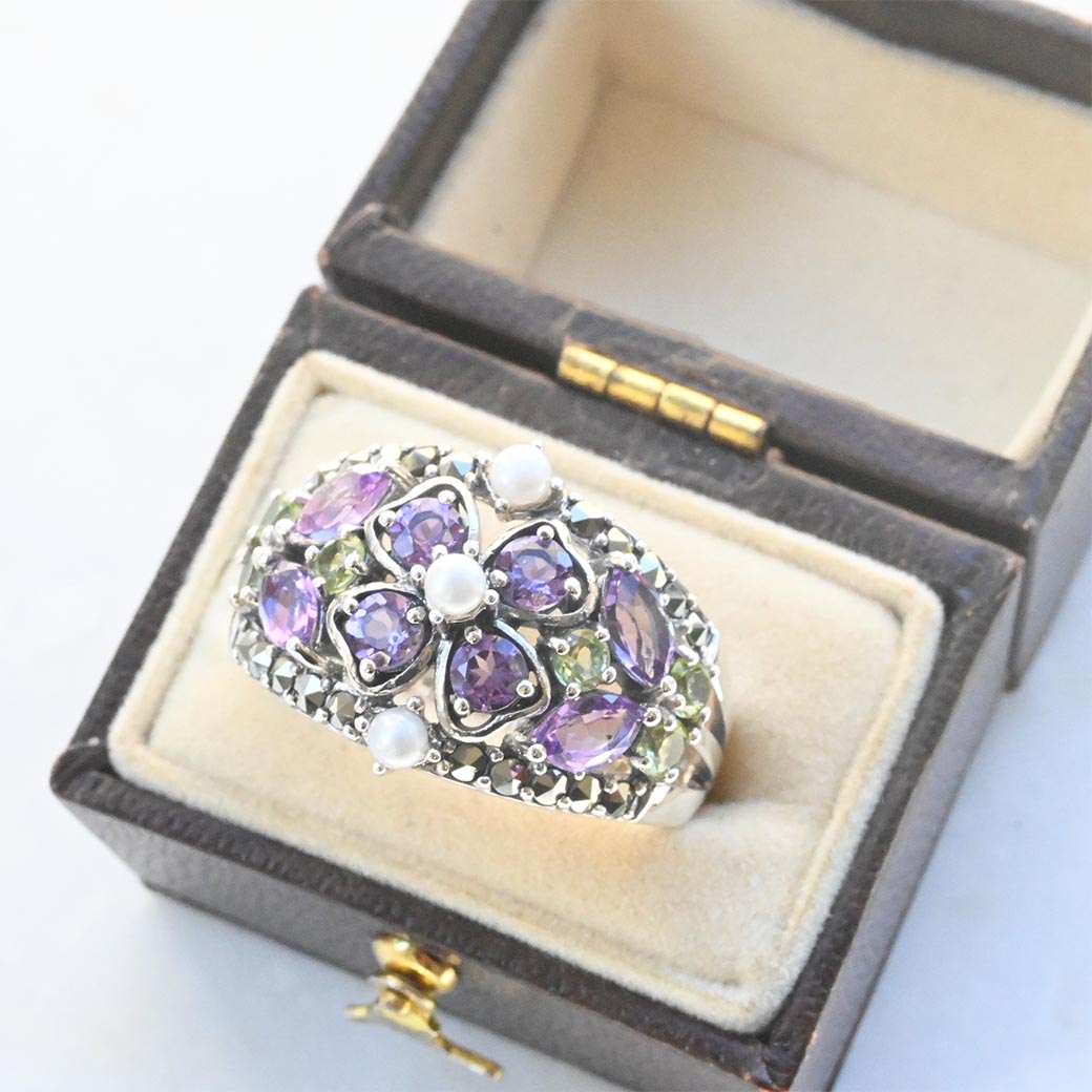 まるで花束がそのままリングになったような、色彩と造形のハーモニーが美しいデザイン。アメジストが、中央に向かって花びらのように配置され、周囲には清らかなパールと爽やかなペリドットがリズムを添えています。