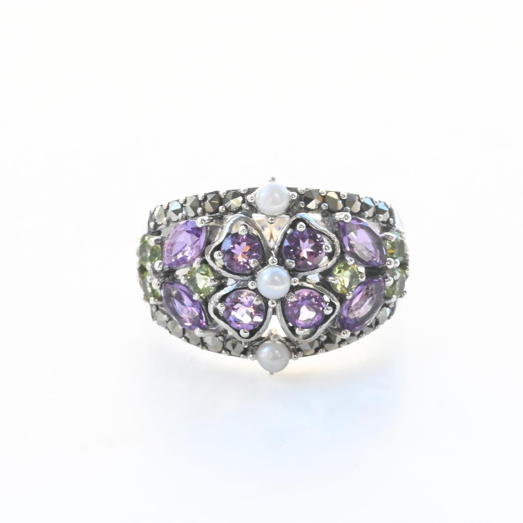 〈素材〉シルバー925〈石〉アメジスト、ペリドット、シードパール、マルカジット〈モチーフサイズ〉最大幅約20㎜(#15にて計測)〈サイズ直し〉不可