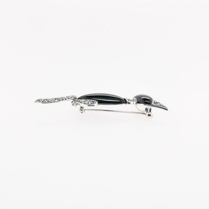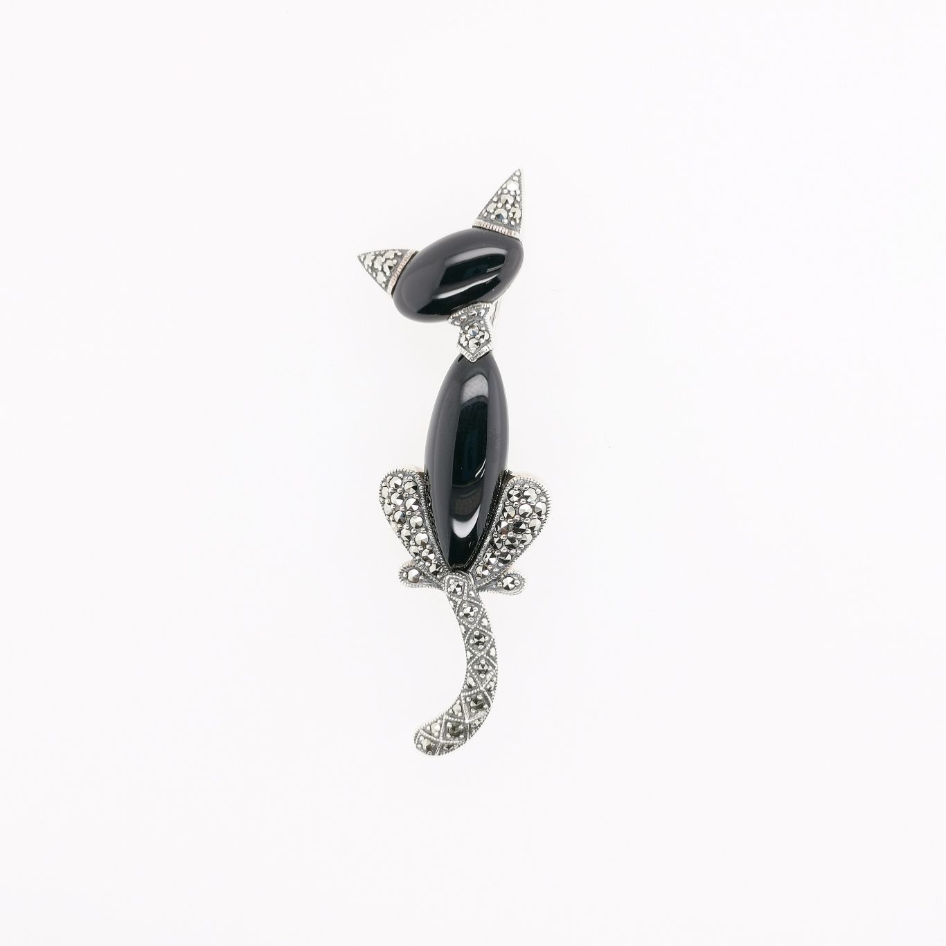 猫の頭と胴体をオニキスにし、耳、尻尾、首輪、足にはきらめきのマルカジットを留めた可愛らしいブローチ。