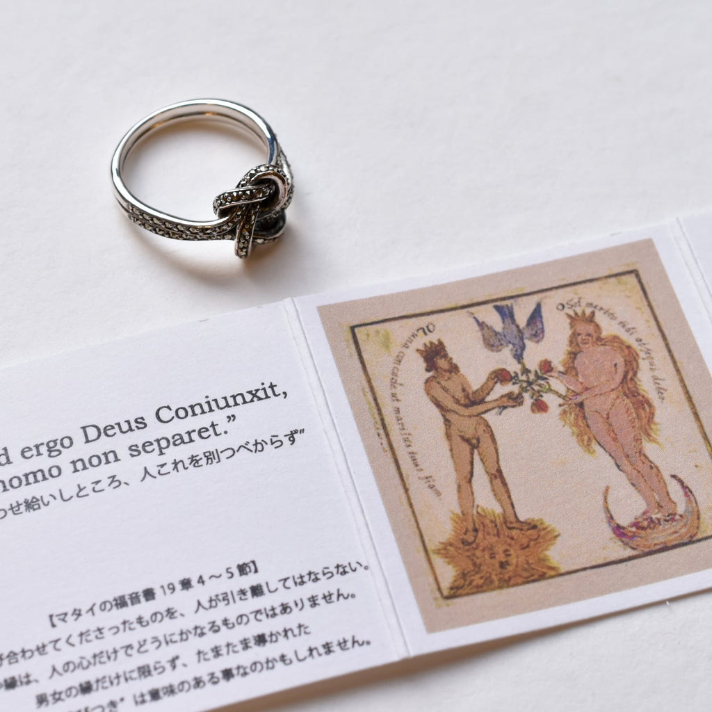knot/結び目Quod ergo Deus Coniunxit,homo non separet.ゆえに神の合わせ給いしところ、人これを分かつべからずほどけない2つの結び目(ノット)を表現しています。銘文は、聖書の一文で結婚式などで選ばれることも多いフレーズです。