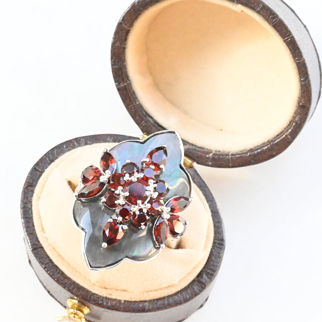 艶やかなブラックマザーオブパールをベースに、情熱的な赤が美しいガーネットを立体的にセッティング。